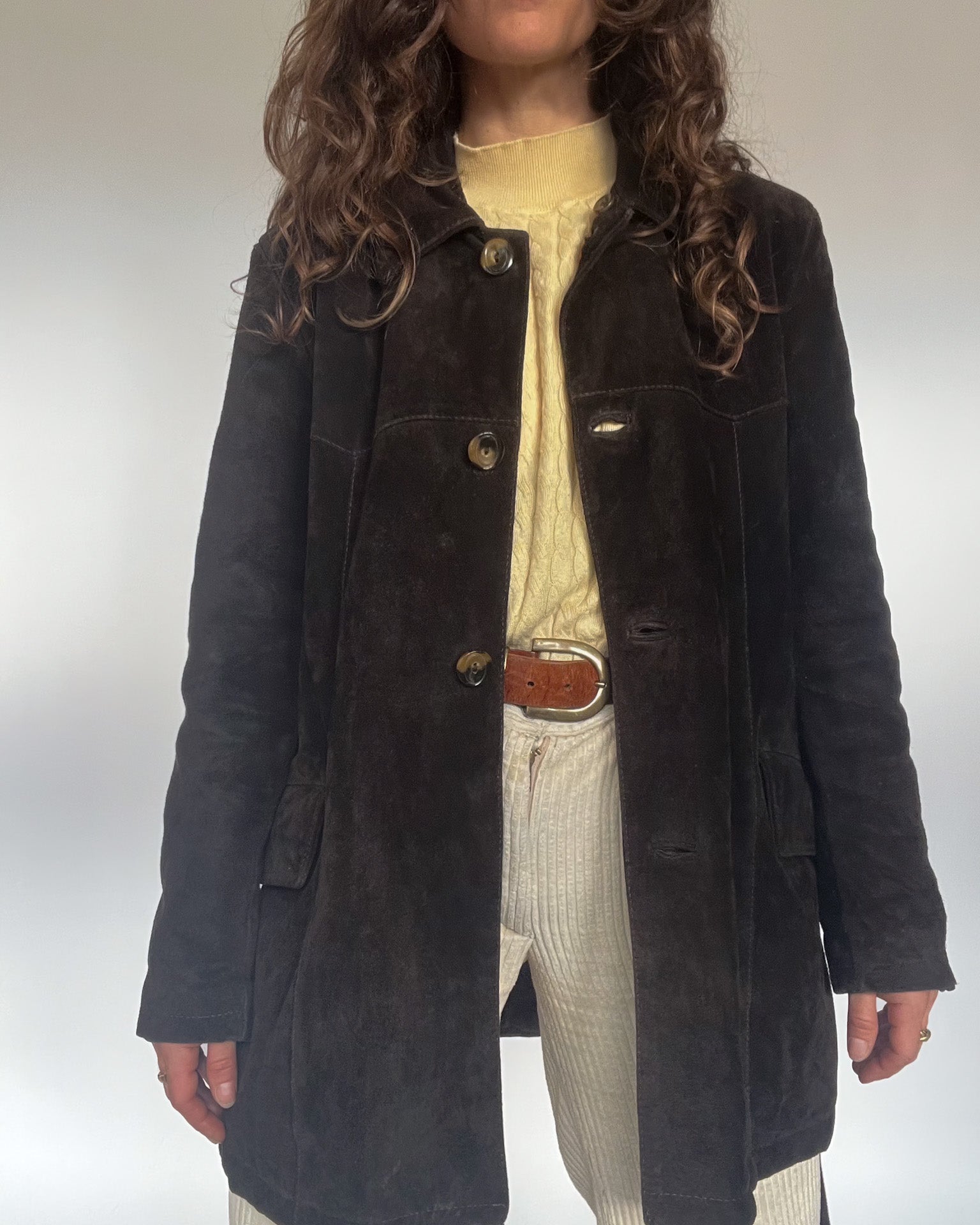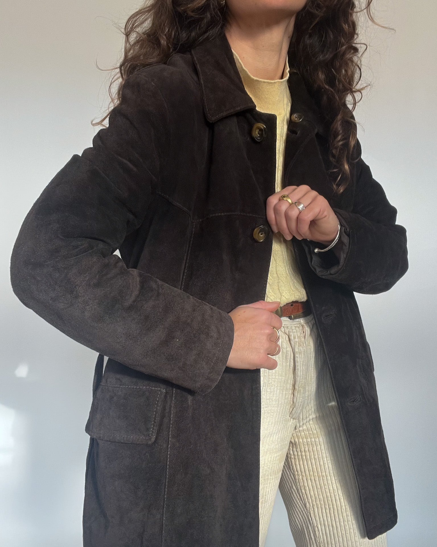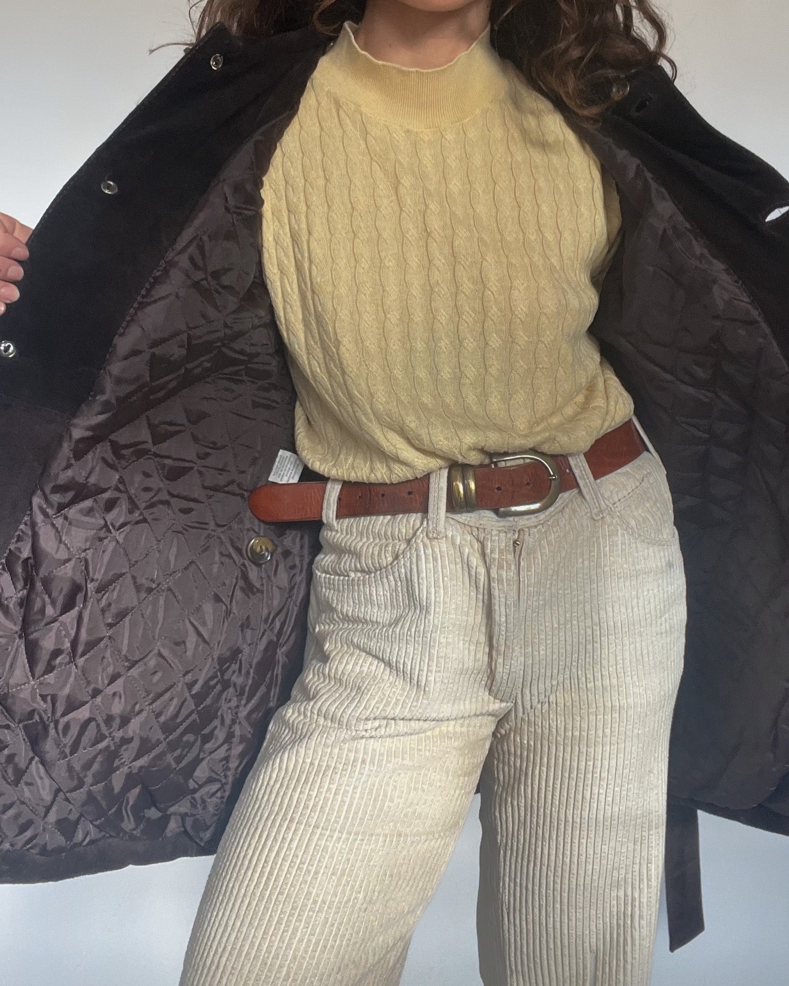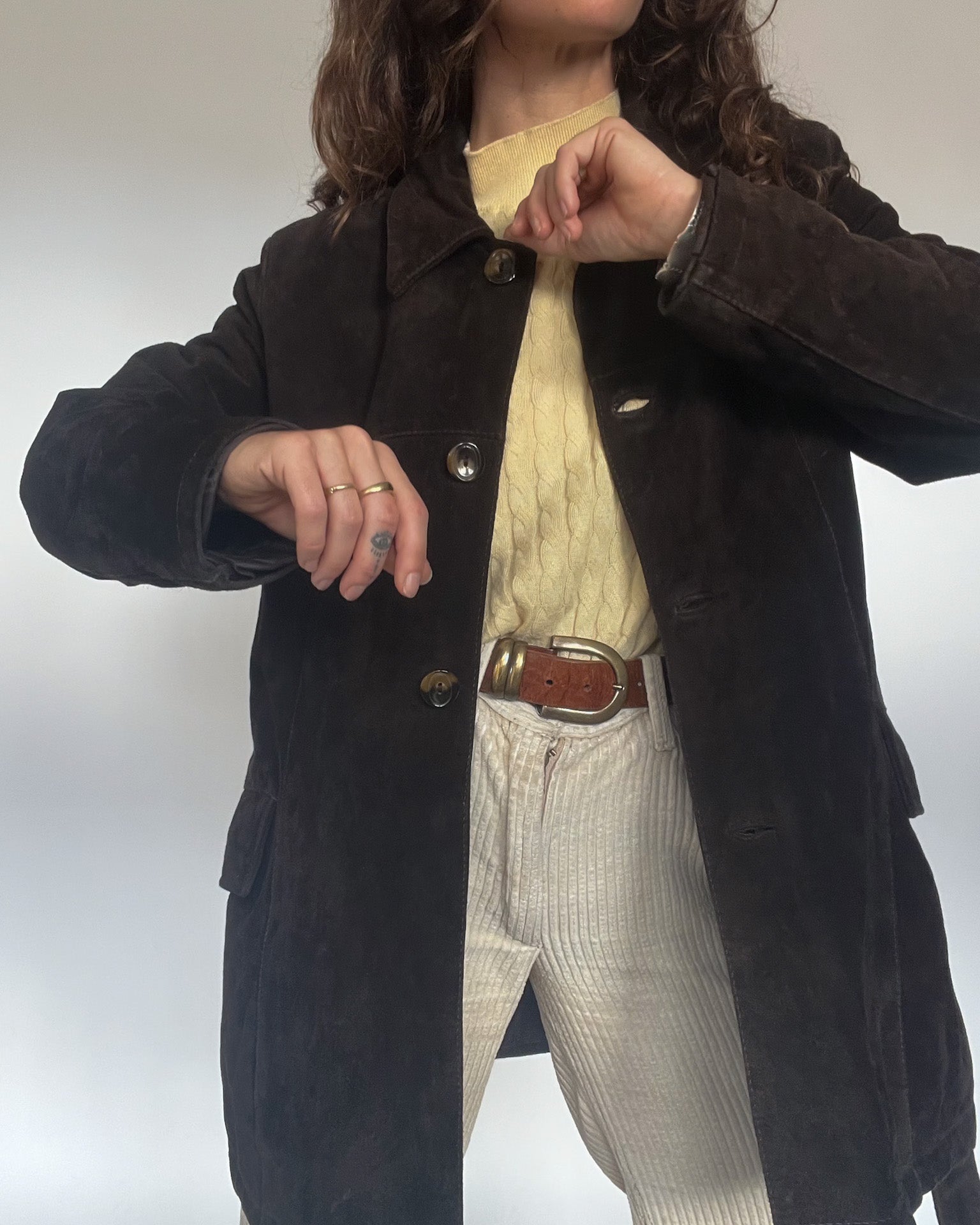 This coat is an absolute favorite of mine, with its perfect fit and exceptionnel quality. The rich brown color and velvet texture add a cozy yet chic vibe, making it an ideal pièce for staying stylish and warm in the coller months. Thanks!!