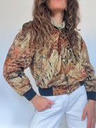 This striking 80’s bomber jacket fuses opulent baroque motifs with bold animal-inspired patterns, creating a unique mix of luxury and wild energy. The fabric has a velvety sheen that catches the light, while the ribbed cuffs and hem anchor the silhouette with a sporty touch. With its golden accents and eclectic mix of prints, it embodies the fearless spirit of 80’s fashion — unapologetic, daring, and endlessly expressive. A true Skorpiones Vintage piece, it’s made for those who embrace their individuality and aren’t afraid to make a statement.