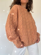 This thick textured cable knit sweater in warm peach tones is a celebration of vintage craftsmanship. With its slightly speckled yarn and oversized silhouette, it balances authenticity and coziness while elevating casual winter style.