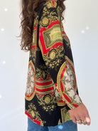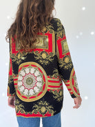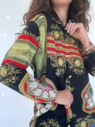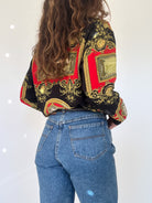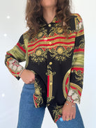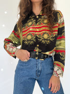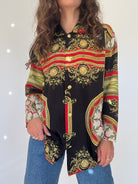 This stunning 90’s Italian baroque shirt embodies timeless elegance with a bold, regal edge. Featuring an intricate print in black, red, gold, and green tones, it recalls the lavish patterns of vintage high fashion. The silk-blend fabric adds a soft sheen and fluid drape, making it an ideal statement piece for both elevated daywear and striking evening looks. A true example of exclusivity and refinement, this shirt reflects the Skorpiones Vintage ethos: powerful, iconic, and unapologetically unique.