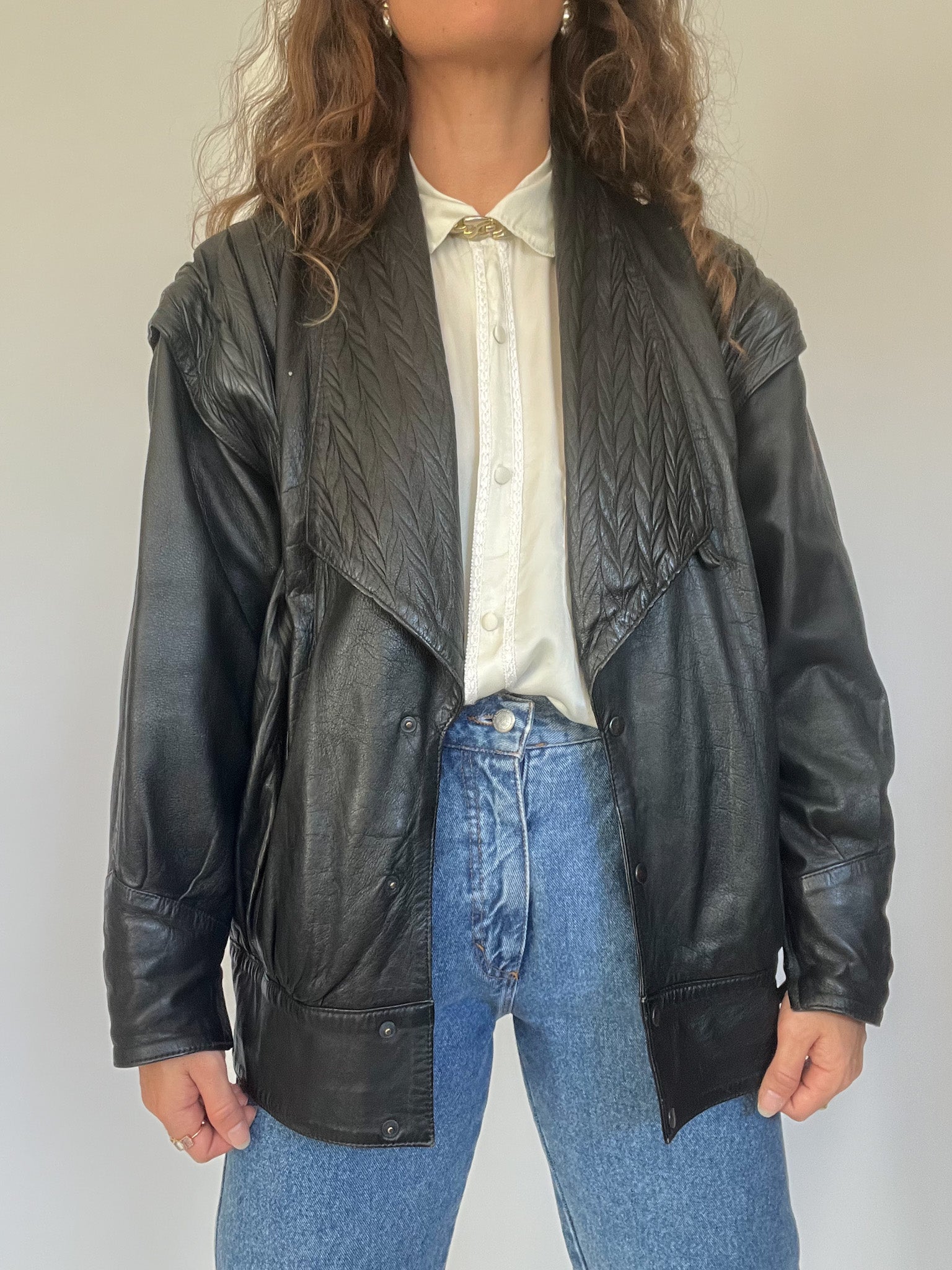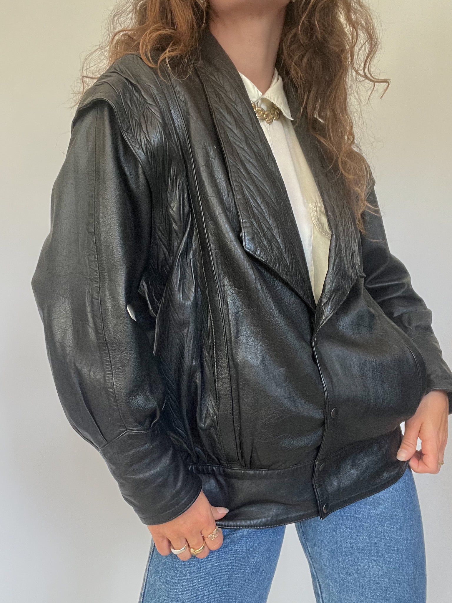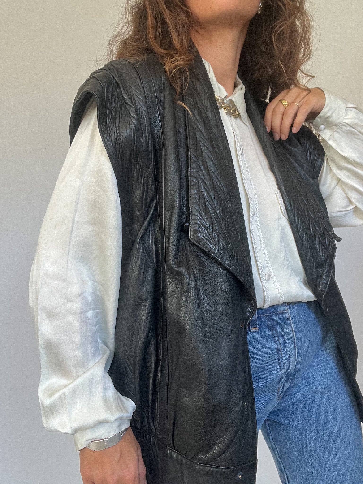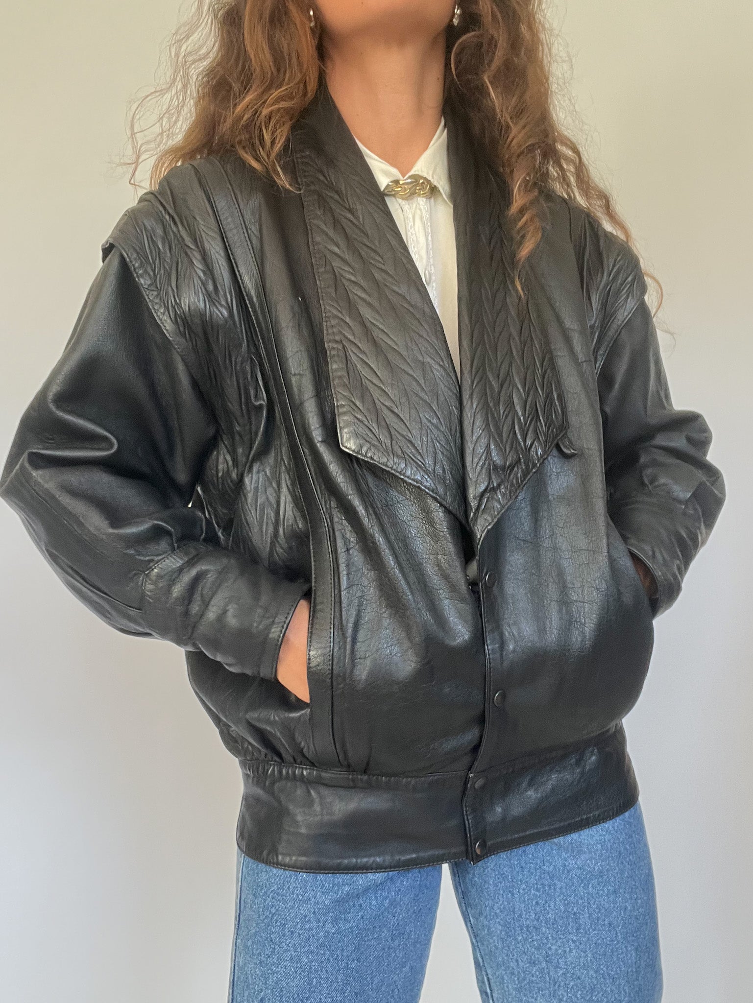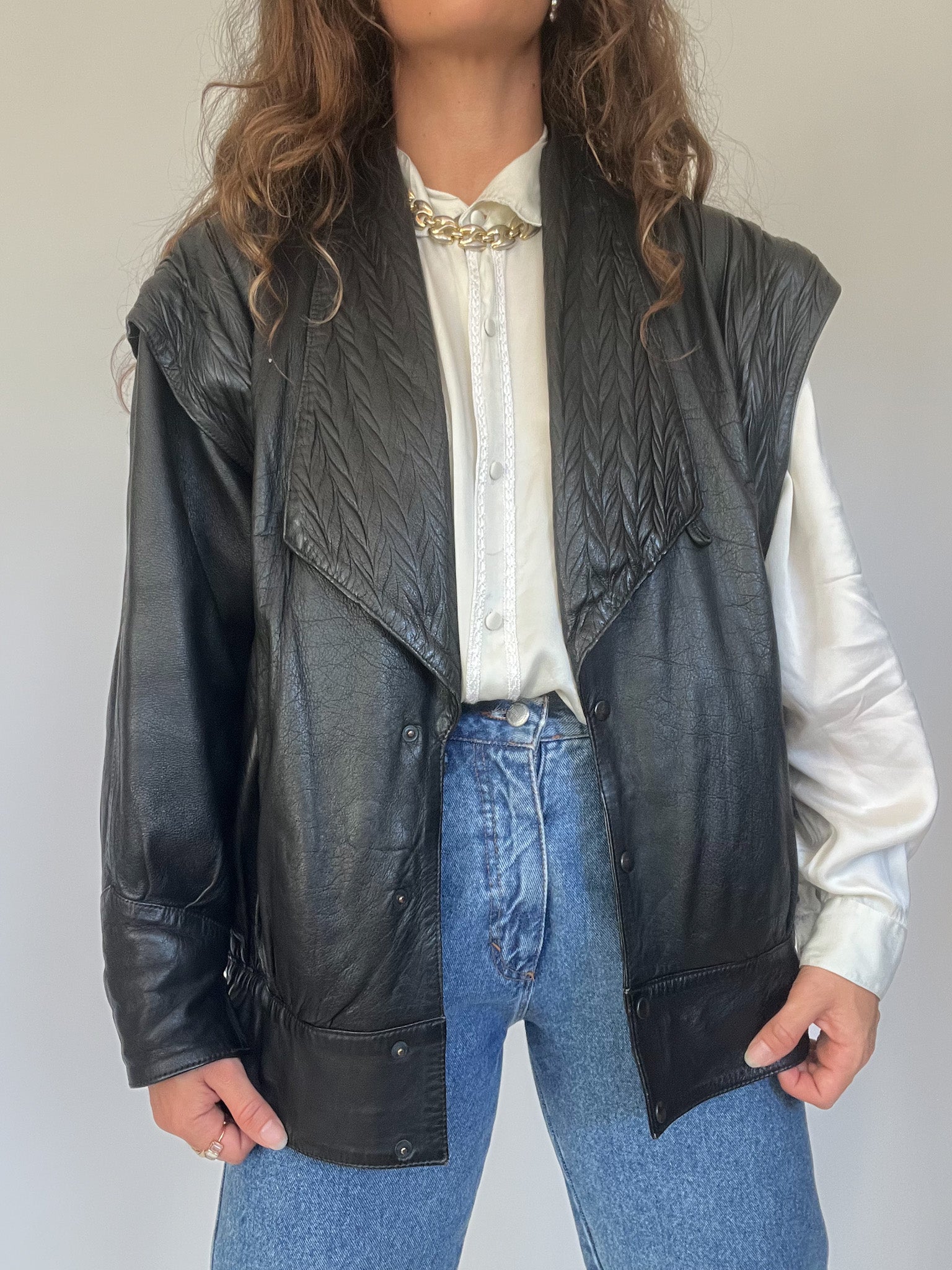 A bold and versatile statement piece from the 90’s, this jacket is crafted in 100% genuine leather with a unique convertible design: the sleeves can be removed to transform it into a gilet. The quilted detailing at the shoulders and lapels adds a structured edge, while the relaxed fit channels the confident, rebellious energy that defines Skorpiones Vintage. This is the kind of rare, empowering piece that elevates any look, worn oversized with denim or layered as a vest over a silk shirt, it captures the essence of timeless strength and individuality.