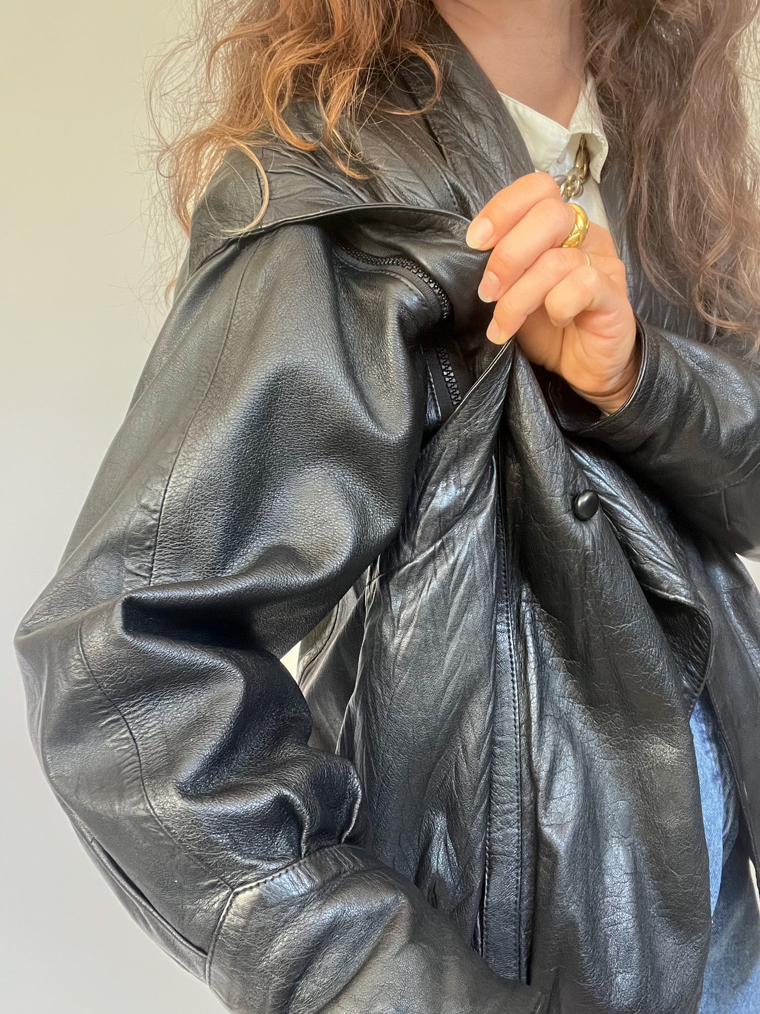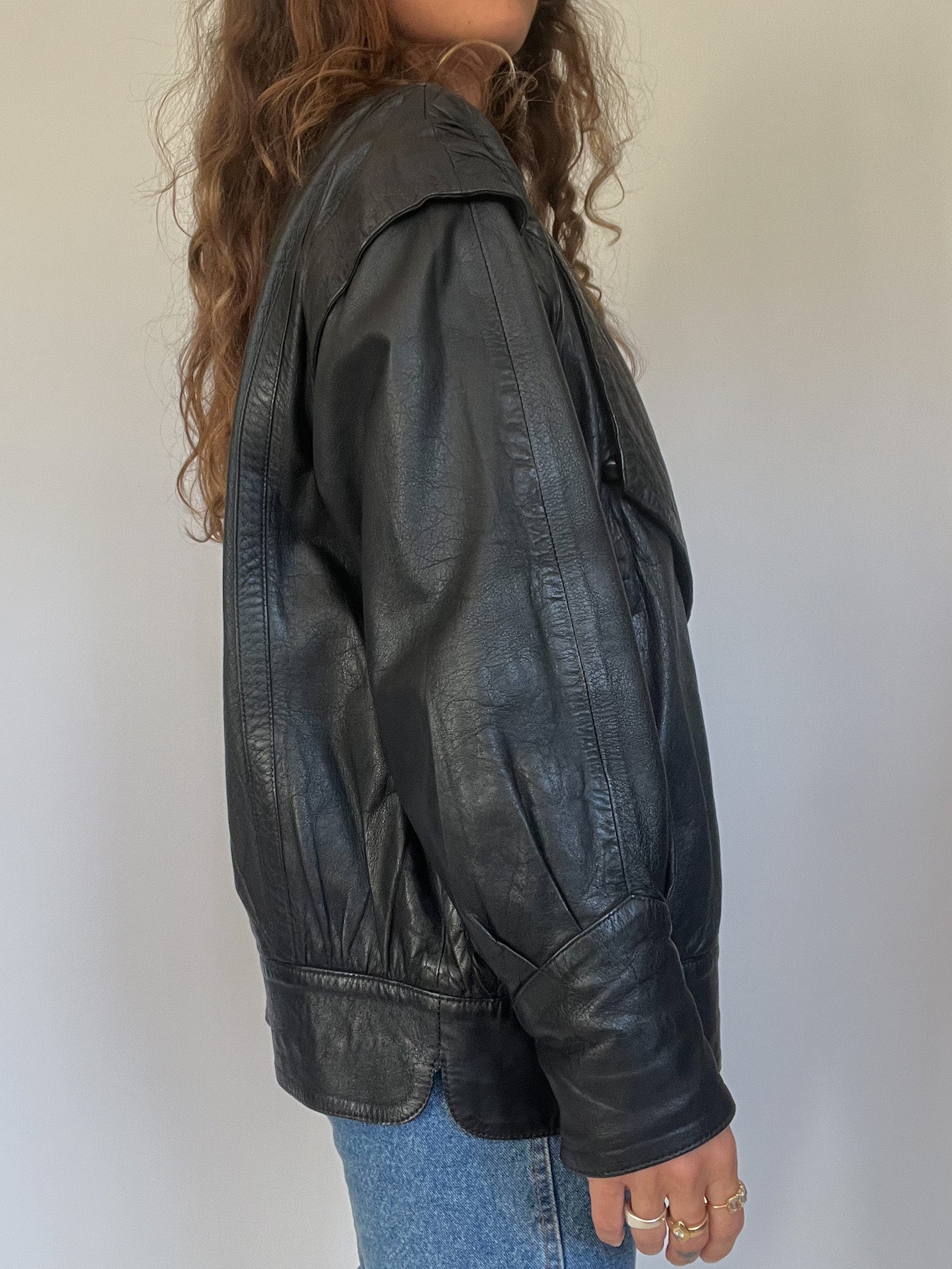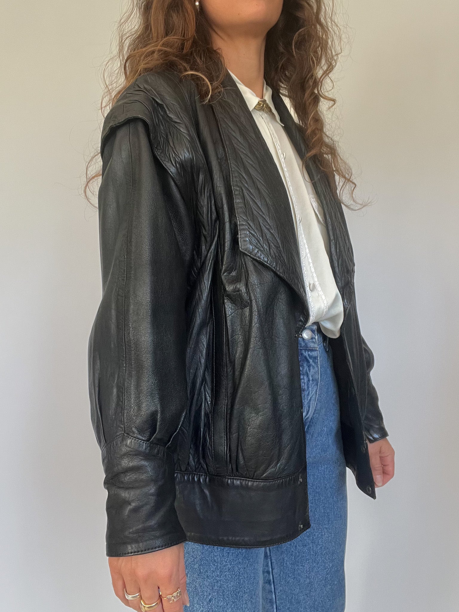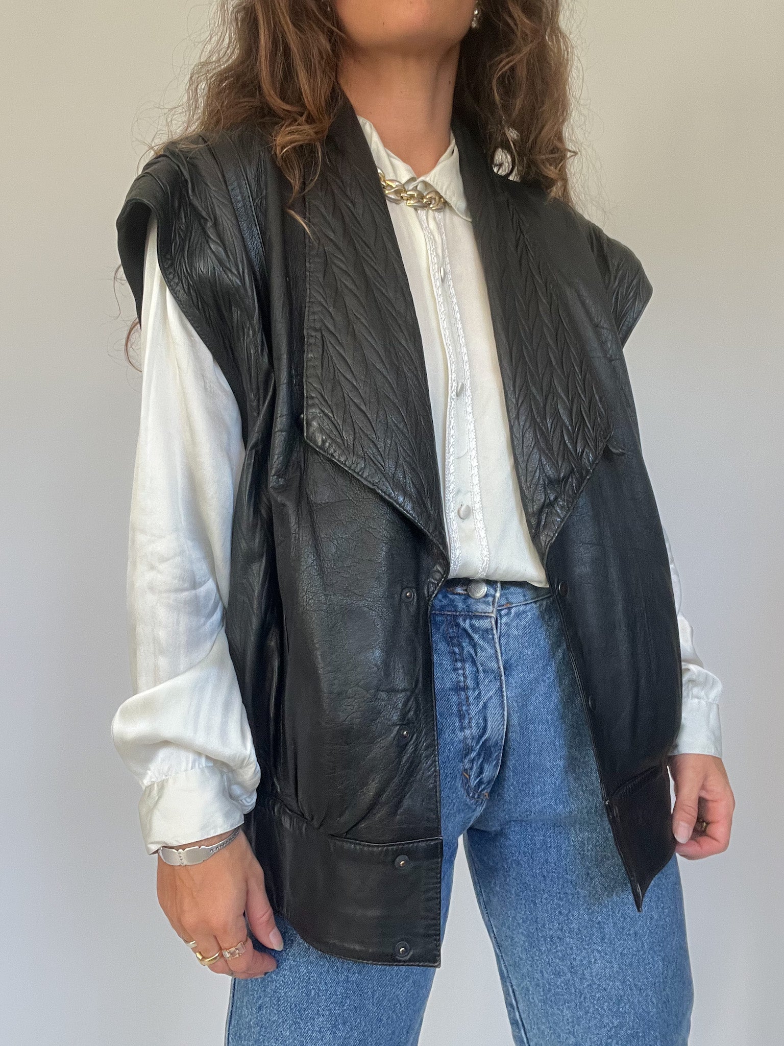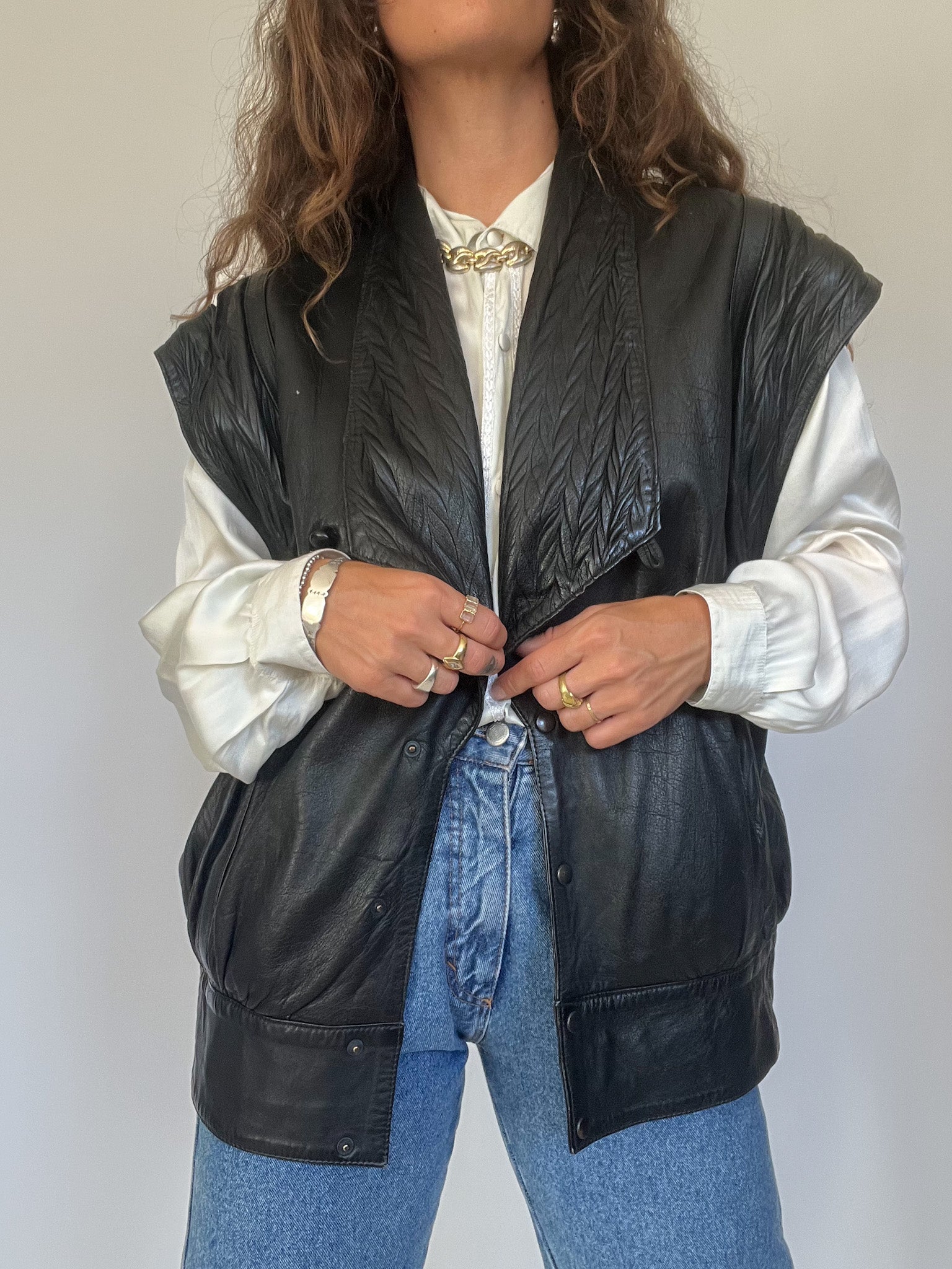 A bold and versatile statement piece from the 90’s, this jacket is crafted in 100% genuine leather with a unique convertible design: the sleeves can be removed to transform it into a gilet. The quilted detailing at the shoulders and lapels adds a structured edge, while the relaxed fit channels the confident, rebellious energy that defines Skorpiones Vintage. This is the kind of rare, empowering piece that elevates any look, worn oversized with denim or layered as a vest over a silk shirt, it captures the essence of timeless strength and individuality.