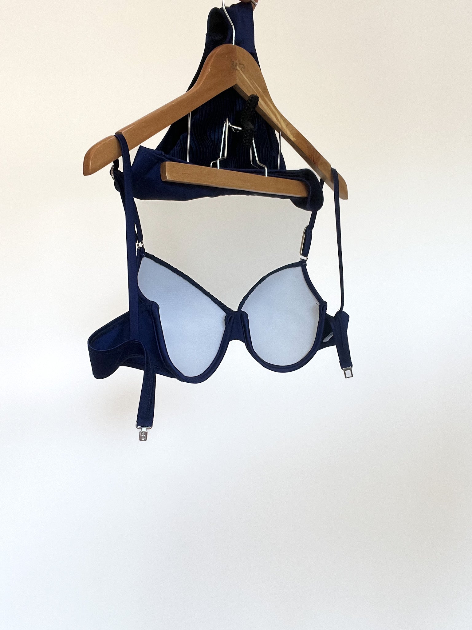Sleek, sophisticated, and effortlessly chic, this 90’s bikini in deep navy brings a refined edge to classic swimwear. The pleated detail on both the structured C-cup top and the matching bottoms adds texture and movement, elevating the minimalist silhouette. Crafted in Italy from high-quality stretch fabric, it embodies the Skorpiones Vintage commitment to timeless design and empowering fits — perfect for those who want elegance without sacrificing comfort.