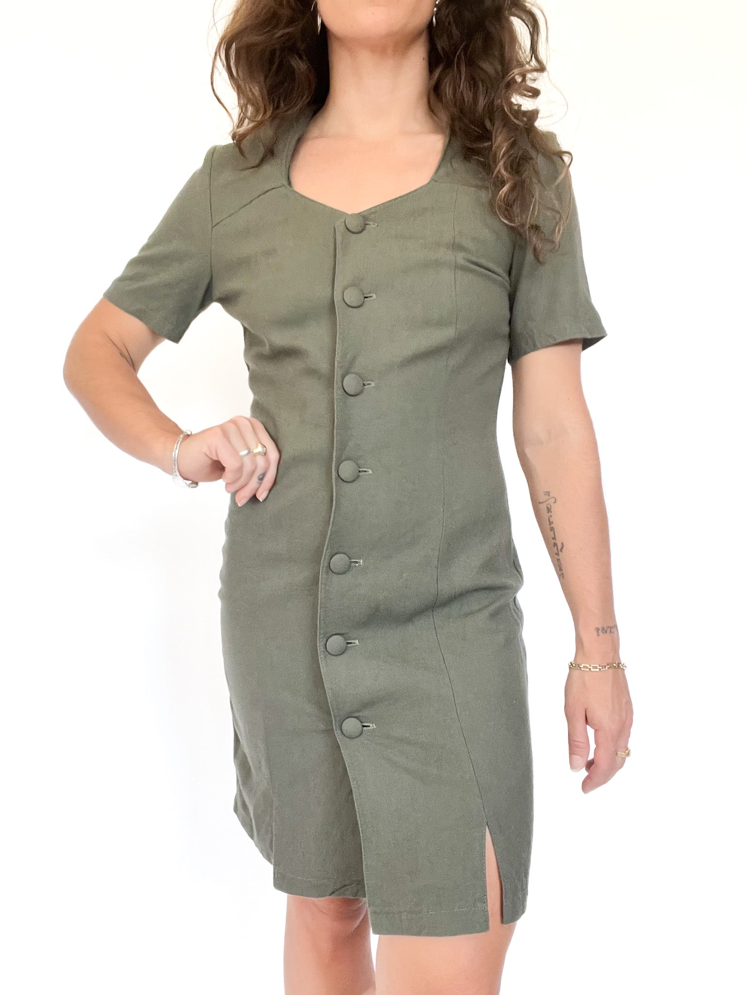 A refined 90’s silhouette designed for bold summer statements. This fitted olive green dress features a beautifully sculpted neckline and an off-centre button closure that elongates the figure. With its structured tailoring and soft linen-viscose blend, it hugs the body with ease while keeping a crisp, lightweight feel. It’s the kind of dress you reach for when you want to channel understated power—the kind that doesn’t shout but always gets noticed. A classic reimagined for warm days and cooler nights, curated with the eye of Skorpiones Vintage: where elegance meets singularity.