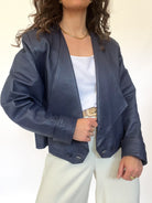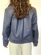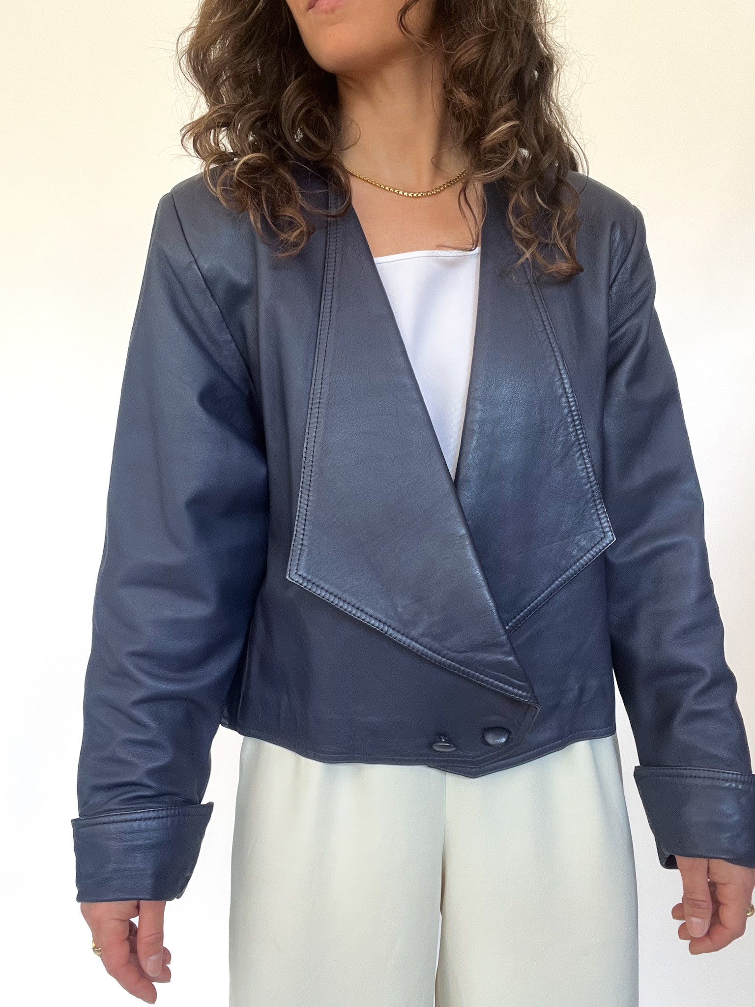 A true testament to bold 90’s tailoring, this purple leather jacket is all about attitude and clean, architectural lines. With its sculptural open front and sharply angled hem, it adds instant structure to any silhouette while remaining surprisingly lightweight. The matte leather feels buttery and premium, and the back button-tab detail gives it an edge that’s both graphic and subtly rebellious. A statement piece for women who want to look iconic without trying too hard — exactly the kind of energy Skorpiones Vintage celebrates.