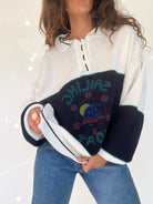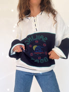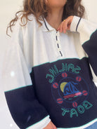 Casual yet iconic, this oversized knit polo captures nautical charm. The cream-and-navy palette frames an embroidered sailing motif, evoking freedom and adventure. Both relaxed and refined, it embodies the empowerment of effortless dressing.