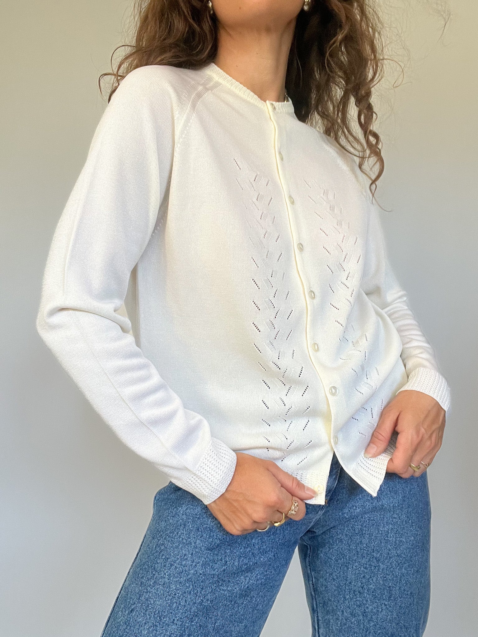 A timeless layering piece that embodies the quiet elegance of vintage knitwear. This creamy white cardigan is adorned with delicate openwork patterns down the front, adding refinement while keeping its minimalist charm. A versatile essential that blends seamlessly with denim, dresses, or tailoring — a perfect reflection of Skorpiones Vintage’s values.