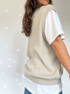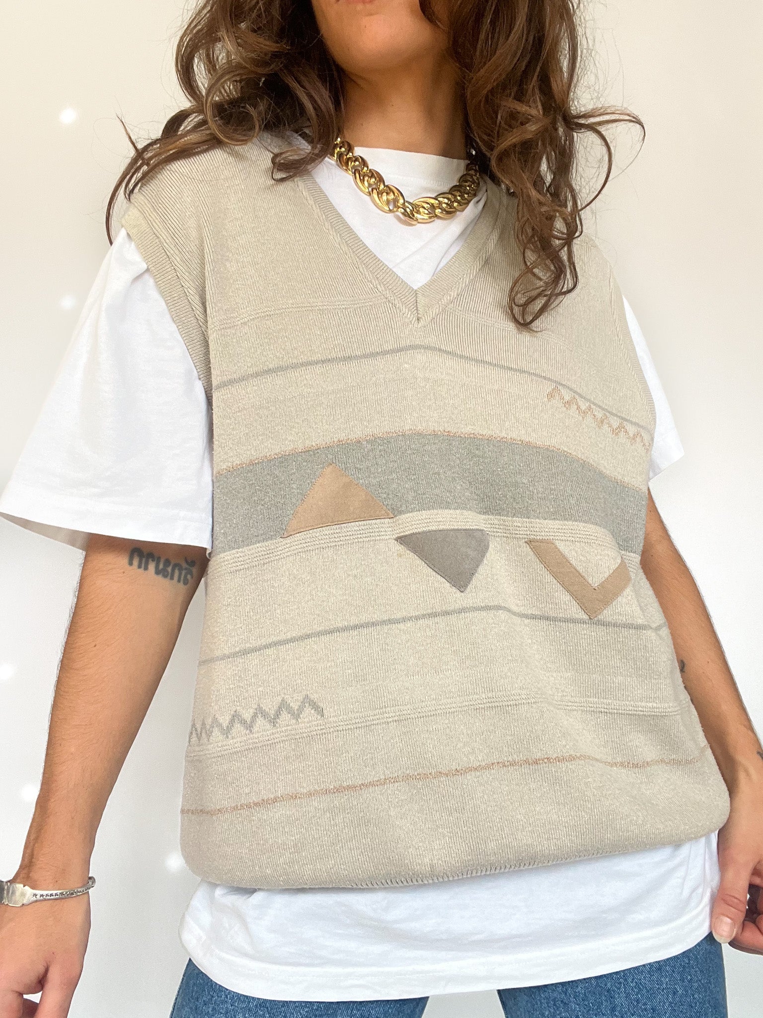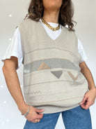 A timeless sleeveless knit vest with an elegant V-neckline, featuring a unique geometric pattern in soft earth tones. The intricate design blends neutral hues of beige, taupe, and muted brown, giving it a subtle yet distinctive aesthetic.