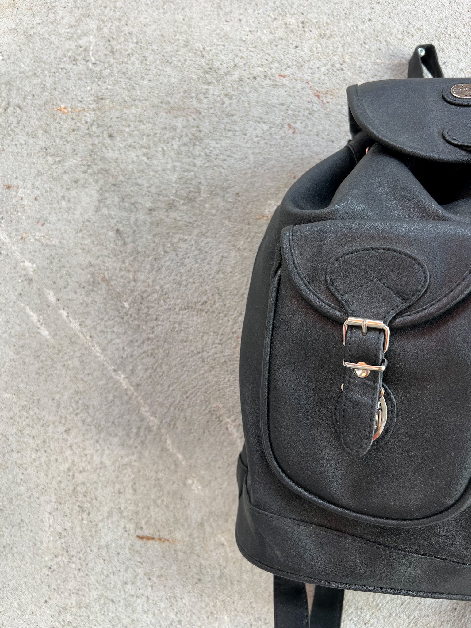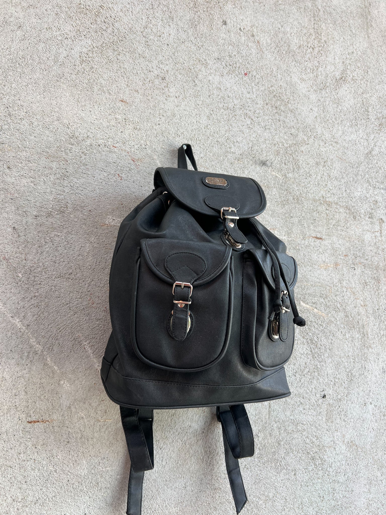 A sleek and functional staple from the 90s era, this black faux leather backpack is all about casual utility with a retro edge. Its structured silhouette is softened by rounded flap pockets and silver-tone buckles, while the splash logo on the front adds a subtle nod to vintage branding. Ideal for everyday city life or styling up your off-duty looks.