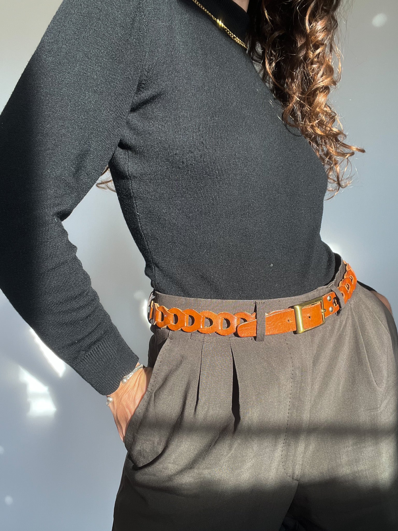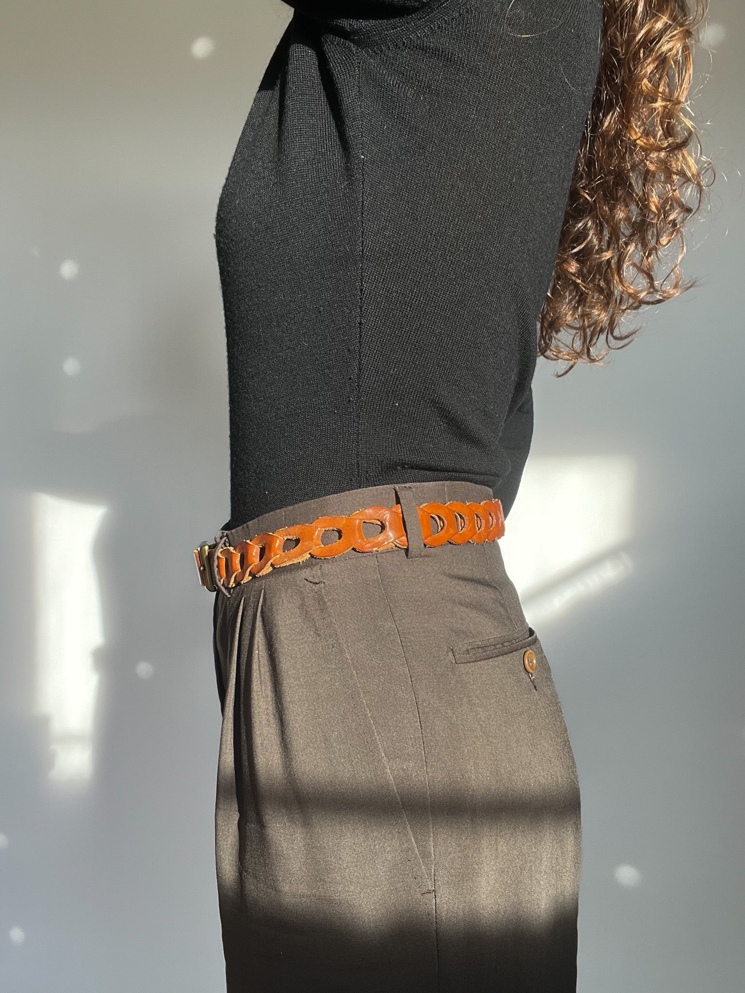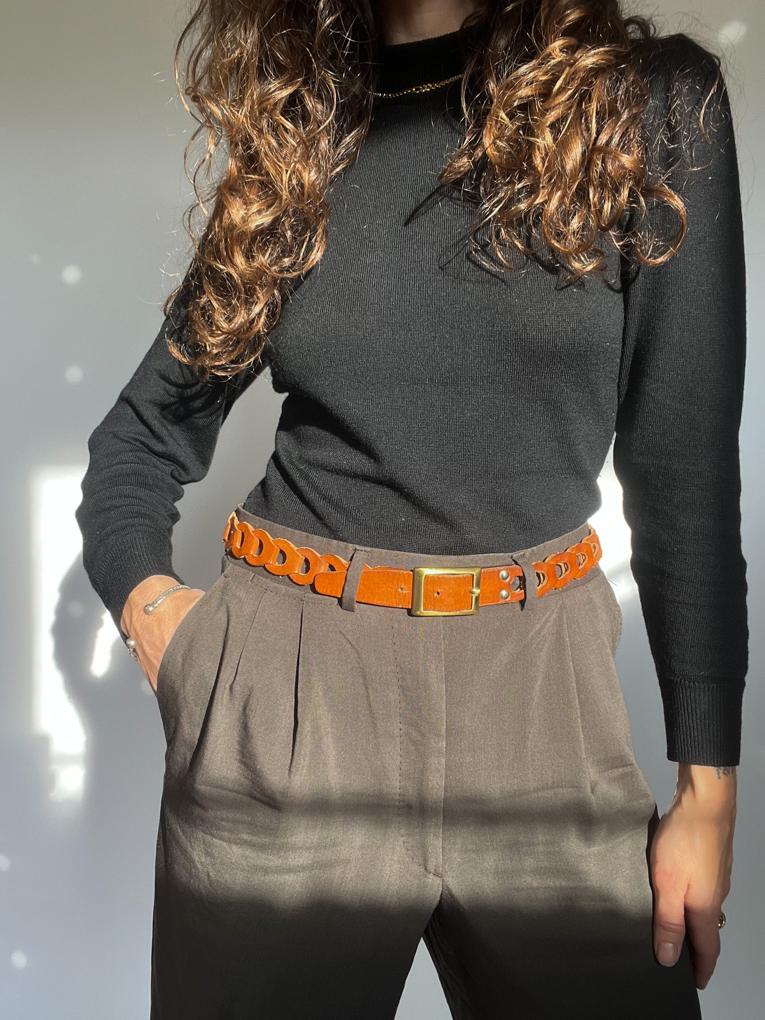 A beautifully crafted 90’s belt in warm tan leather, designed with an interlaced structure that gives it both texture and presence. Its woven construction makes it feel artisanal and refined, while the brushed brass buckle adds a timeless touch. This is the kind of vintage accessory that instantly softens and elevates a look — the perfect balance between understated and distinctive, fully aligned with the Skorpiones Vintage spirit of authenticity and effortless empowerment.