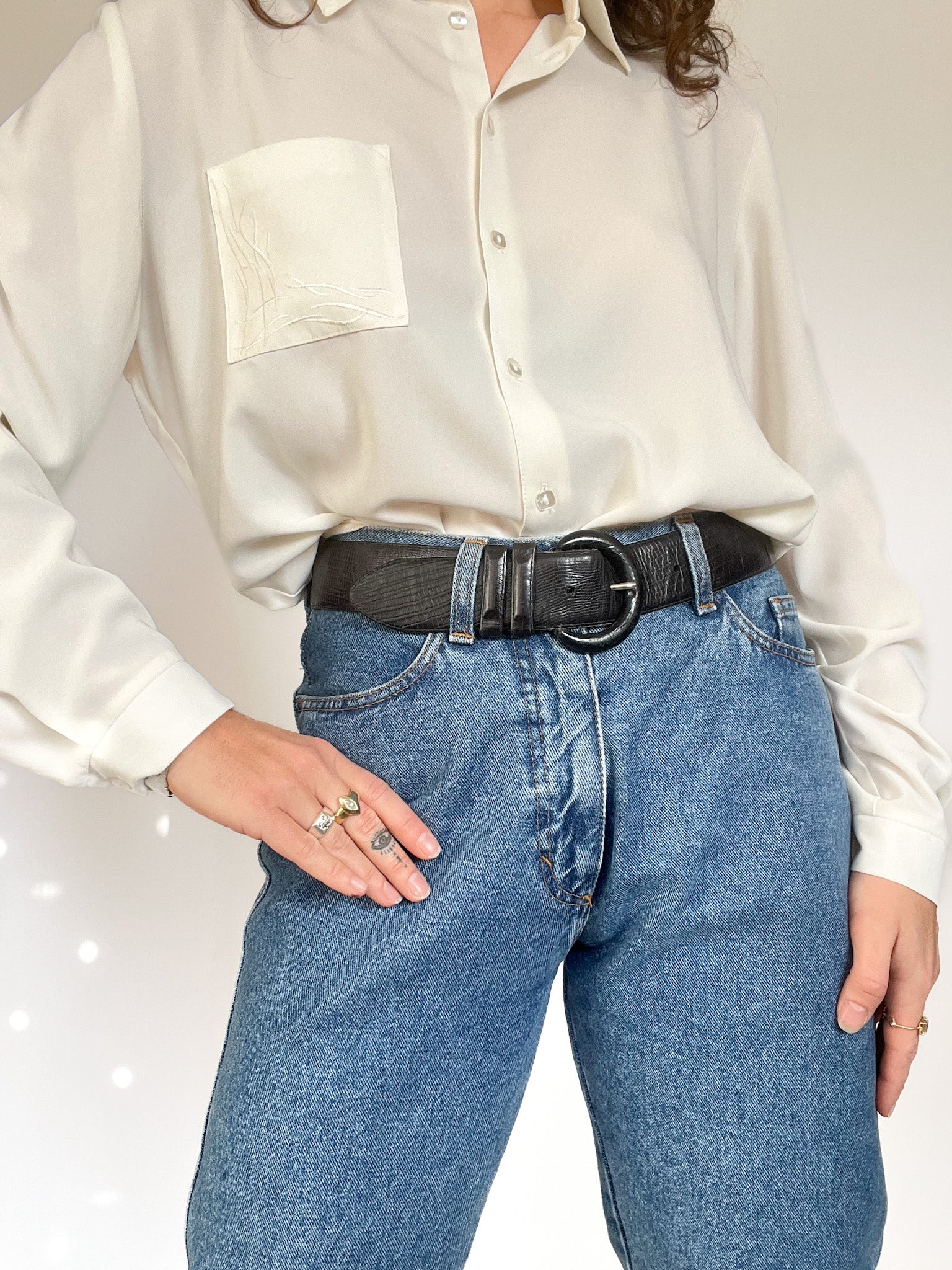 A timeless accessory with a bold touch, this vintage black leather belt is designed to elevate any outfit. The textured leather, subtly embossed with a refined pattern, adds dimension and character, while the round buckle enhances its vintage charm. Whether cinched at the waist or worn with high-waisted denim, this belt is a statement of effortless elegance.