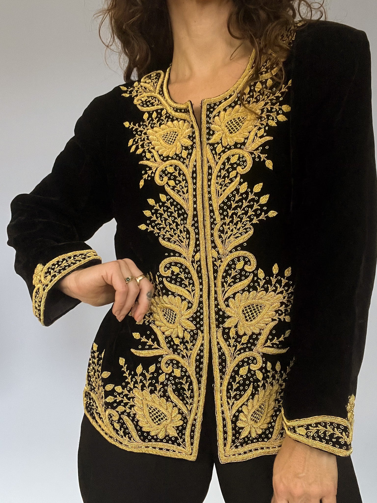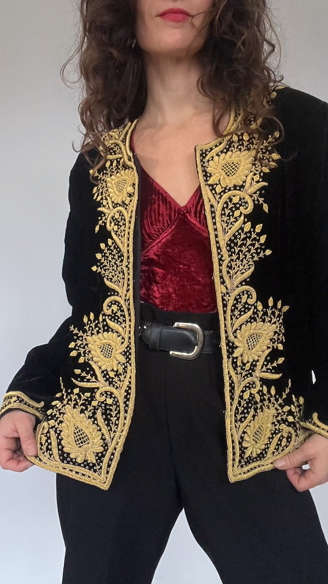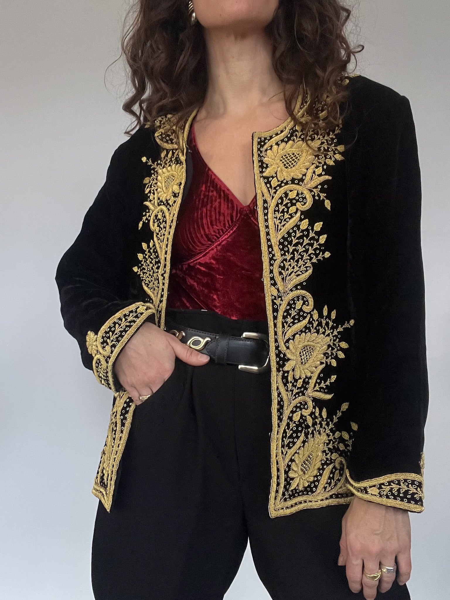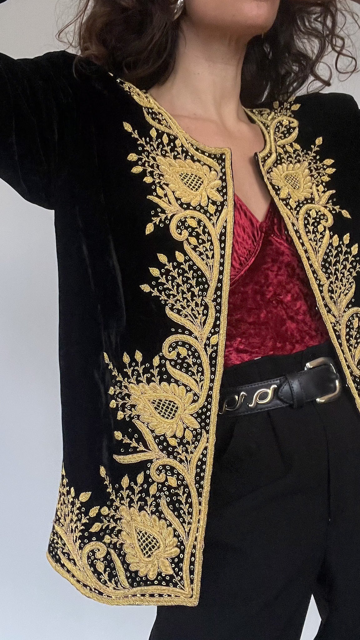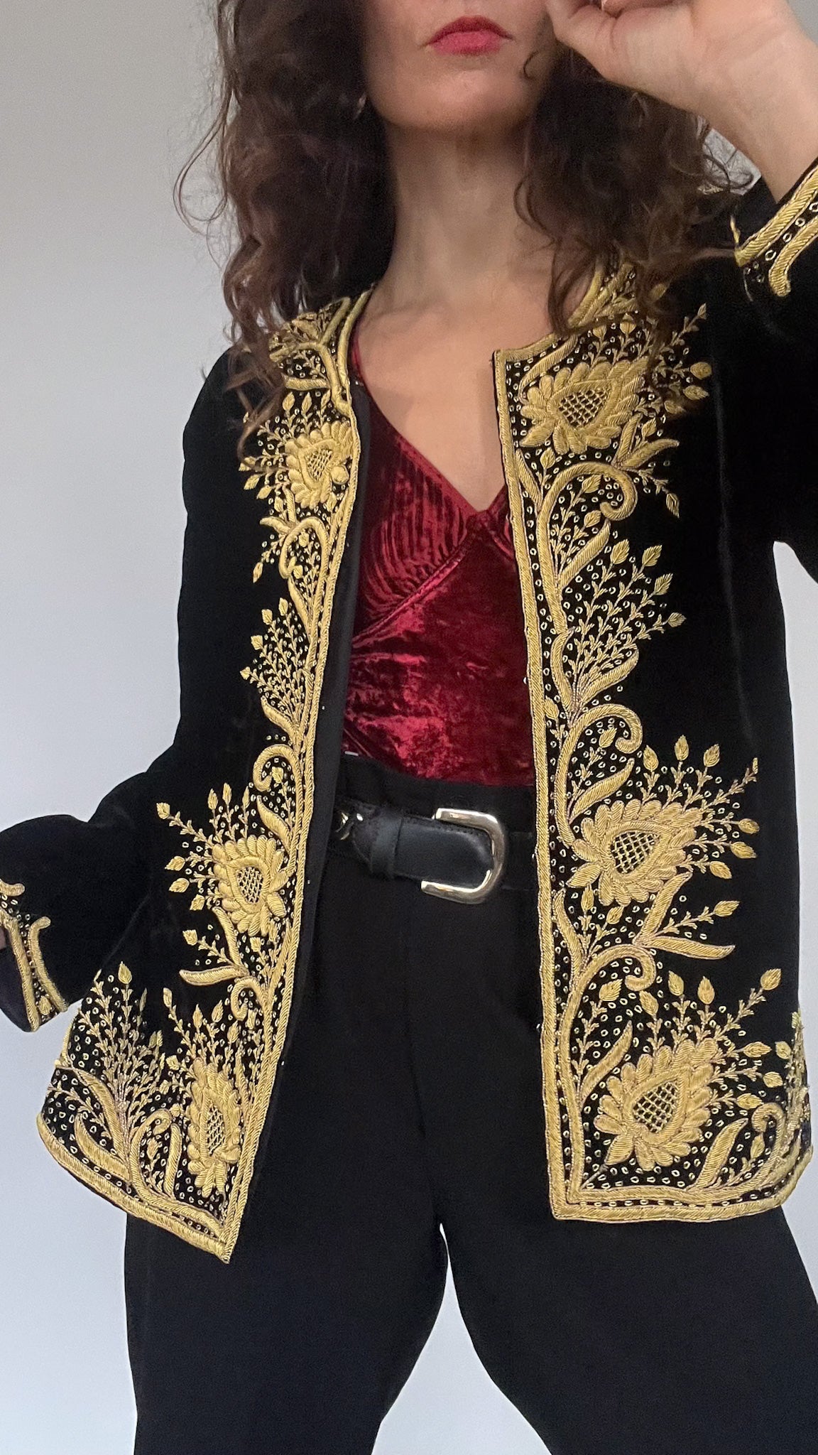 An absolutely iconic 80’s velvet jacket, hand-embellished with intricate golden embroidery and tiny pearls scattered throughout the pattern — a piece that feels almost museum-worthy. The craftsmanship is breathtaking: ornate florals climbing along the front, cuffs and hem, each detail adding depth and richness to the soft black velvet. The silhouette is structured yet fluid, making it just as stunning worn open over a festive look as it is fully closed for maximum impact.