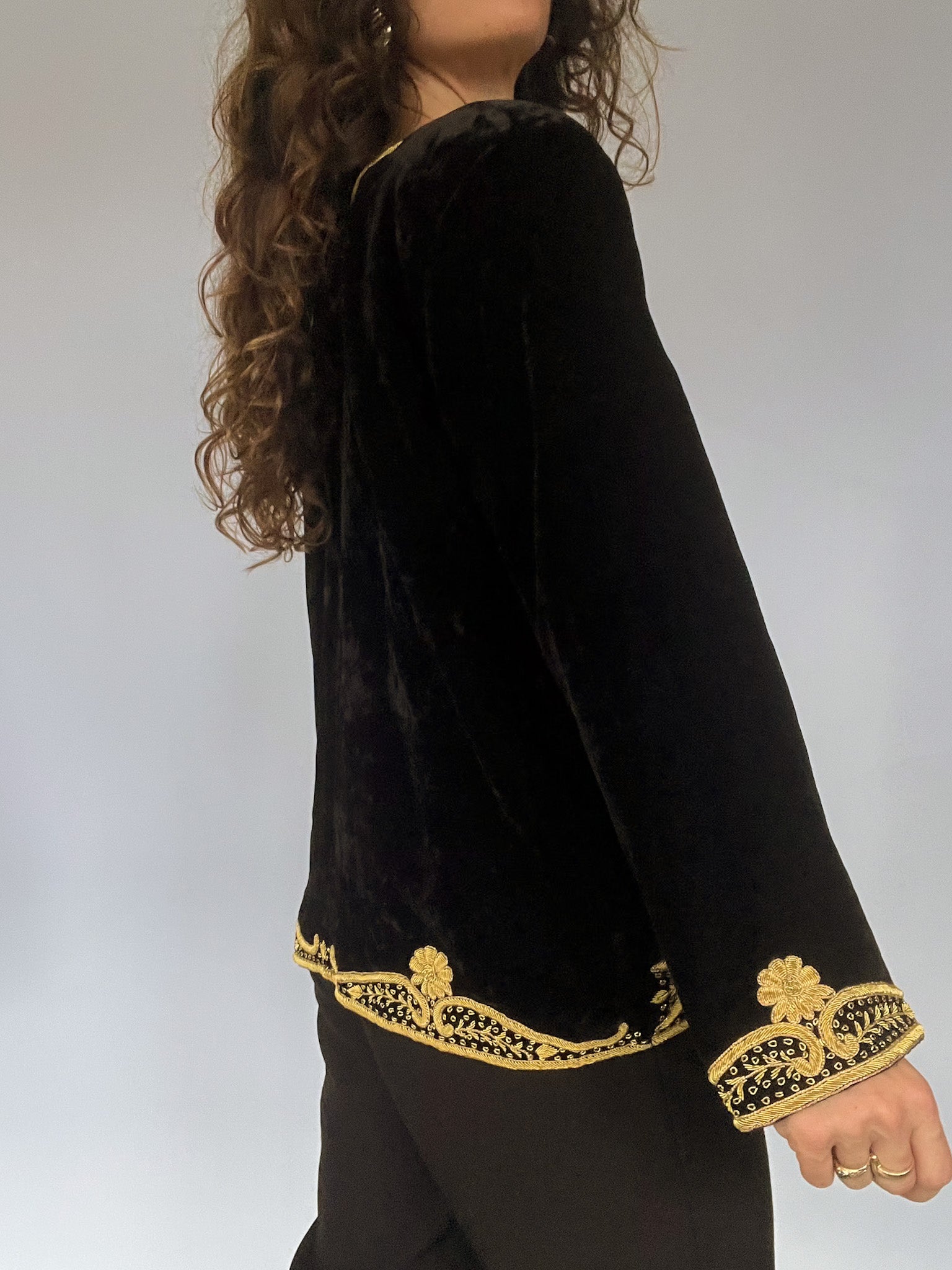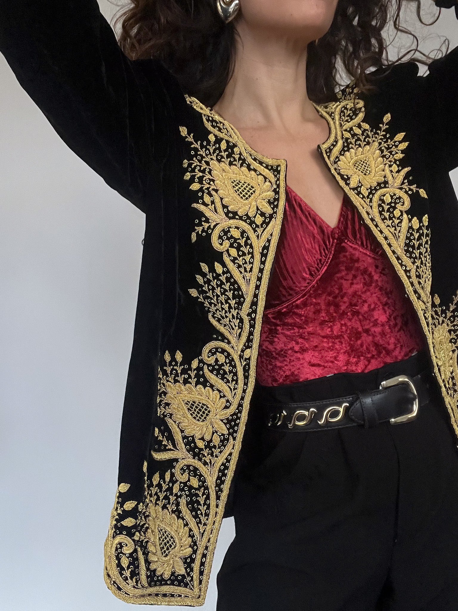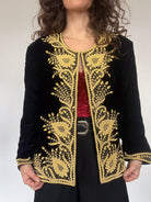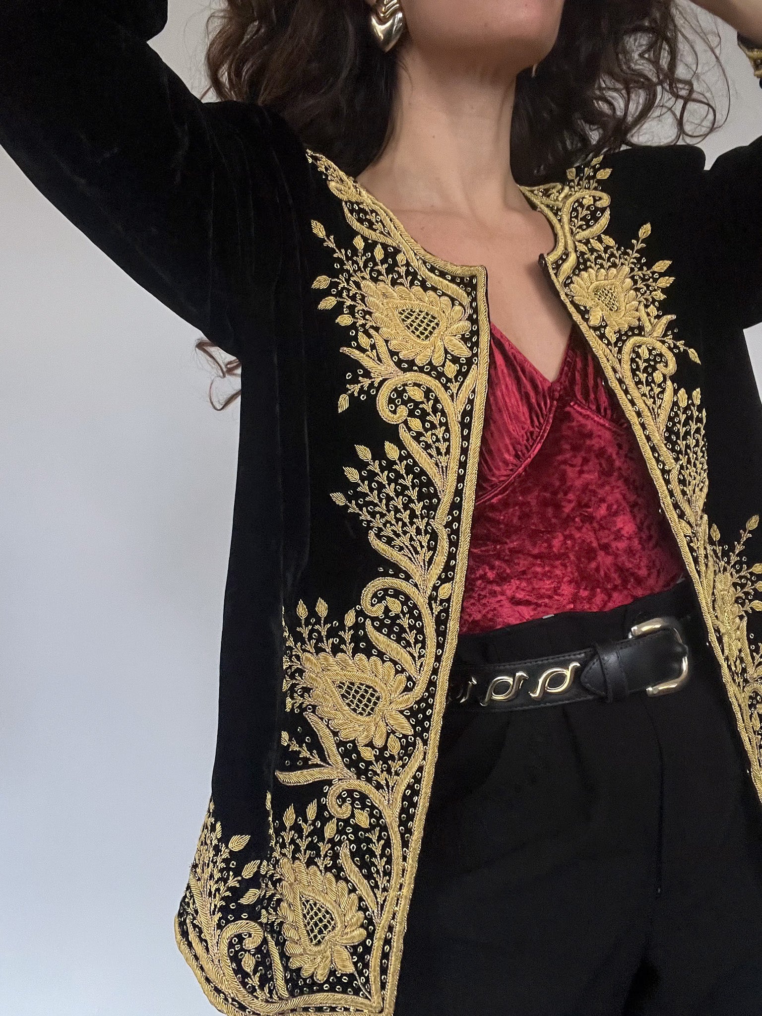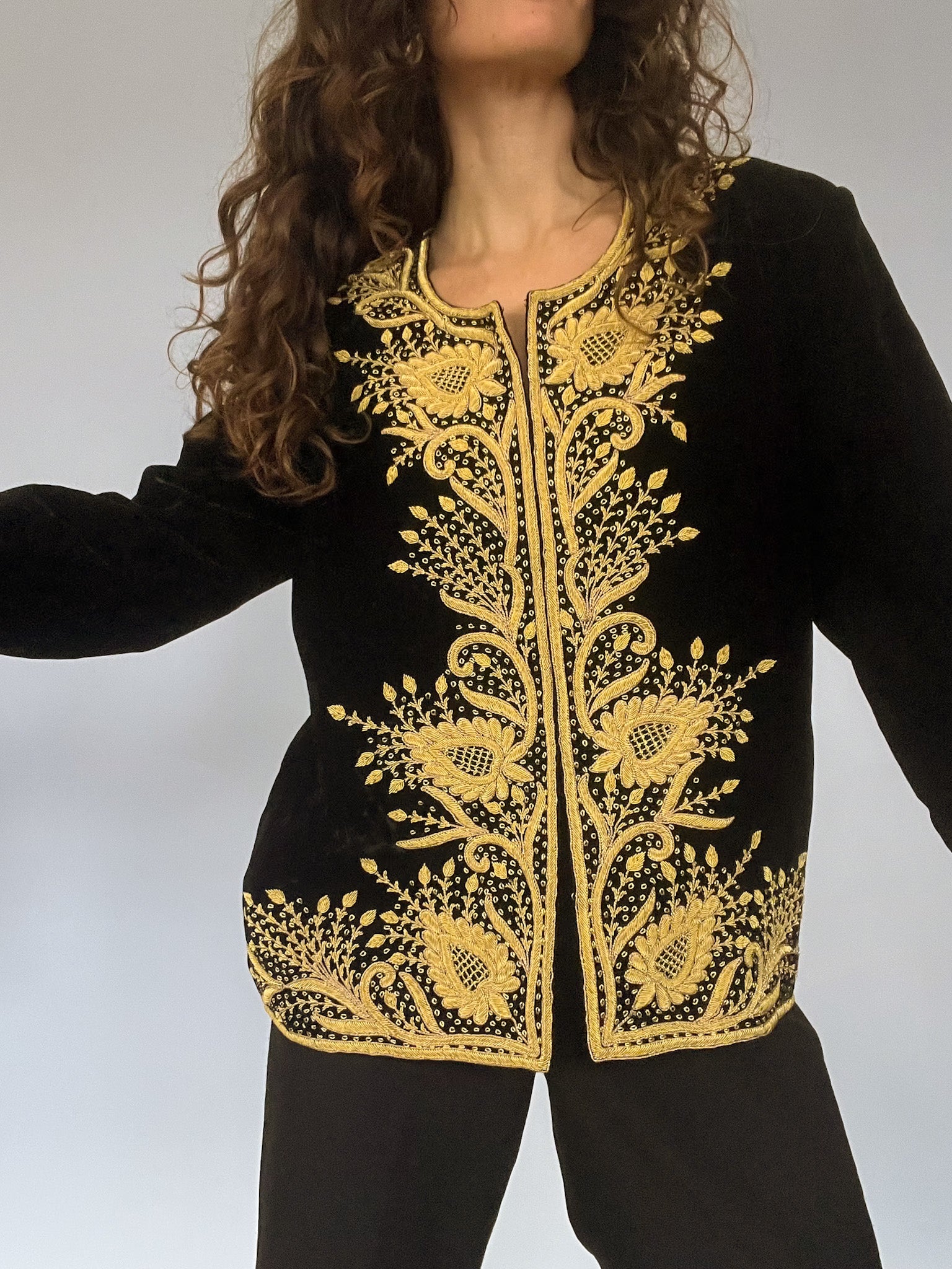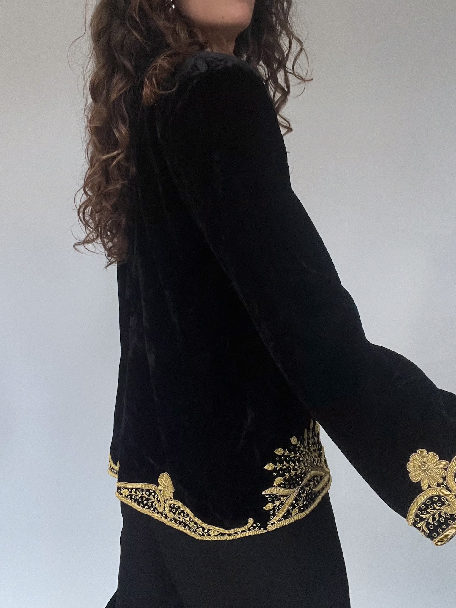 An absolutely iconic 80’s velvet jacket, hand-embellished with intricate golden embroidery and tiny pearls scattered throughout the pattern — a piece that feels almost museum-worthy. The craftsmanship is breathtaking: ornate florals climbing along the front, cuffs and hem, each detail adding depth and richness to the soft black velvet. The silhouette is structured yet fluid, making it just as stunning worn open over a festive look as it is fully closed for maximum impact.