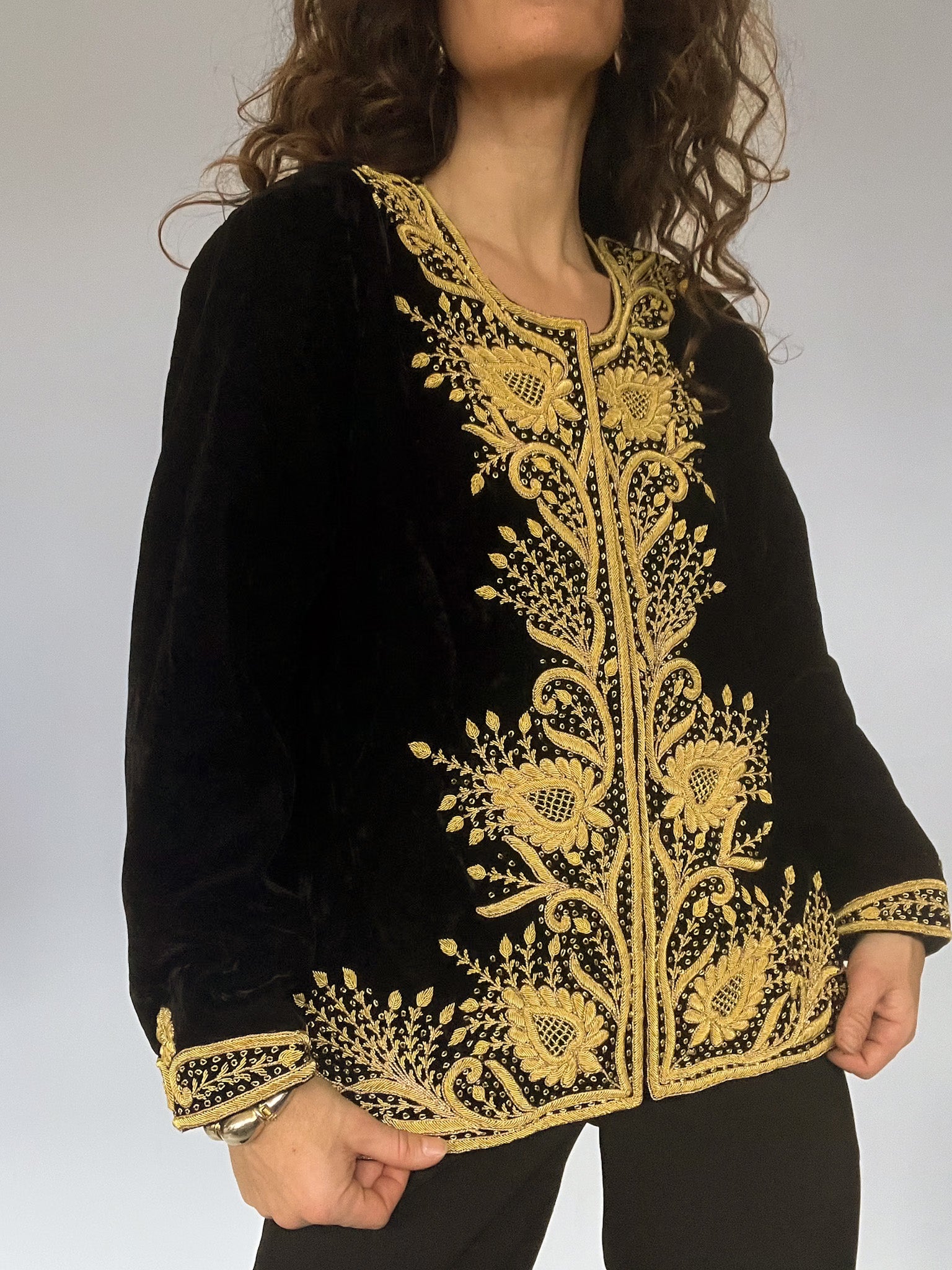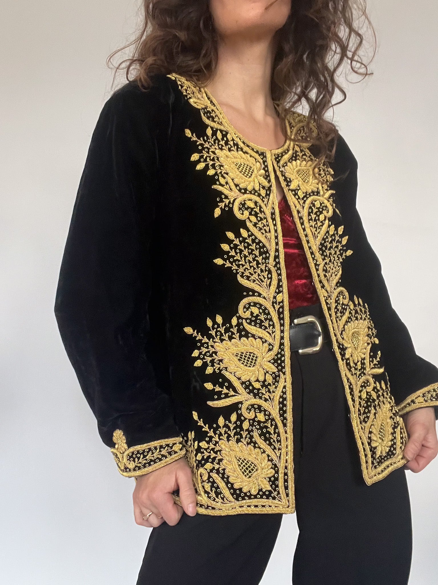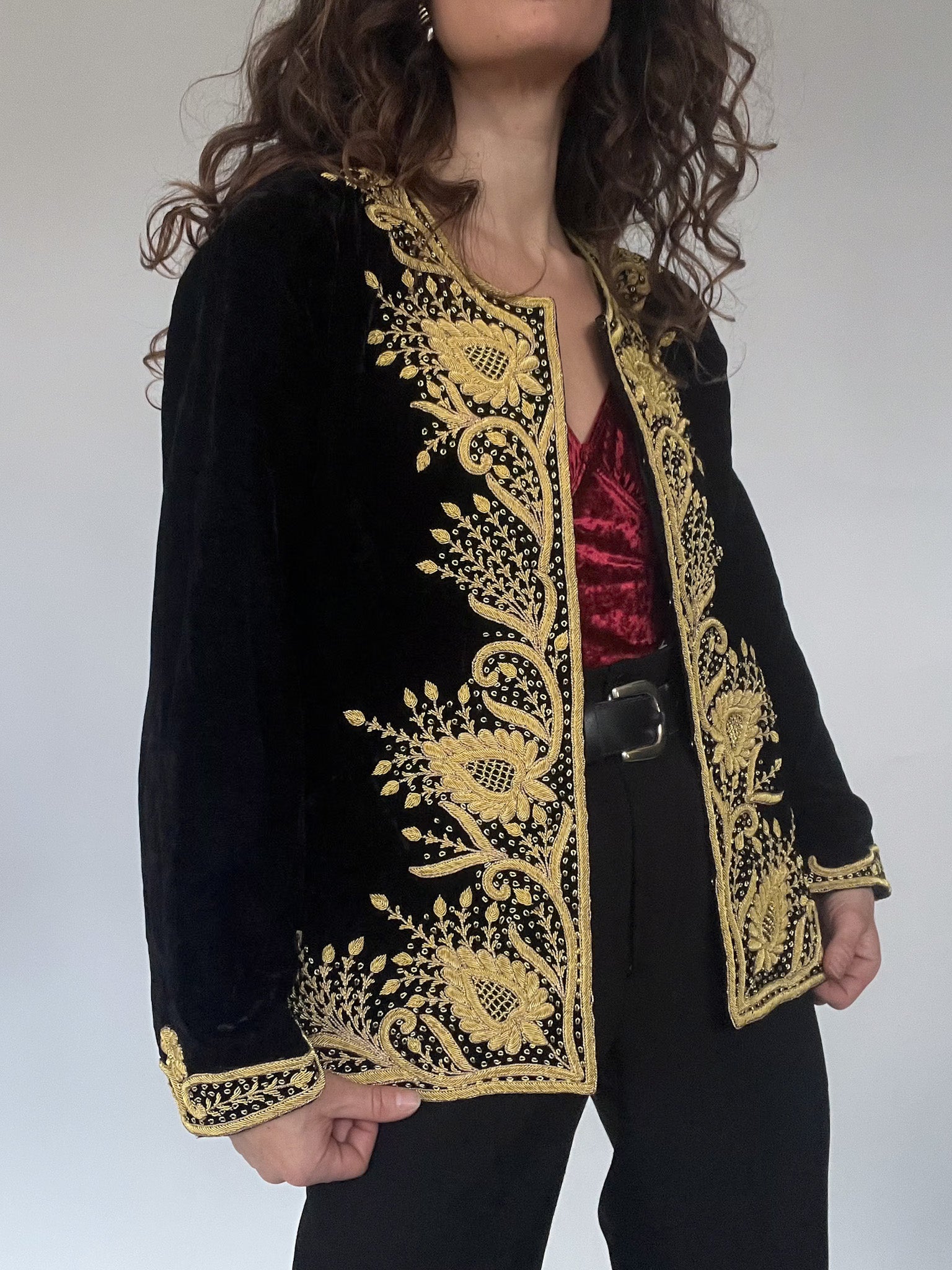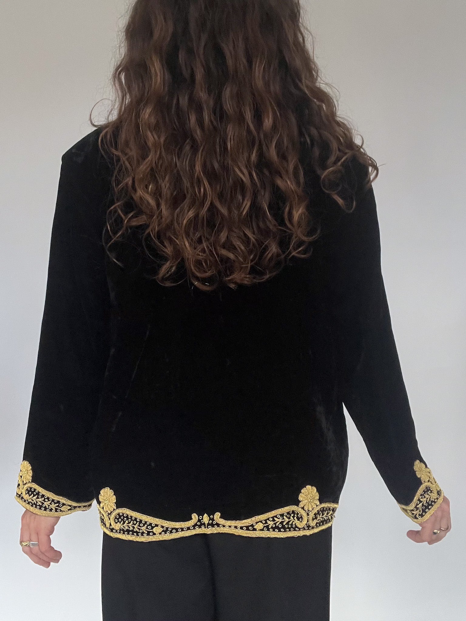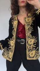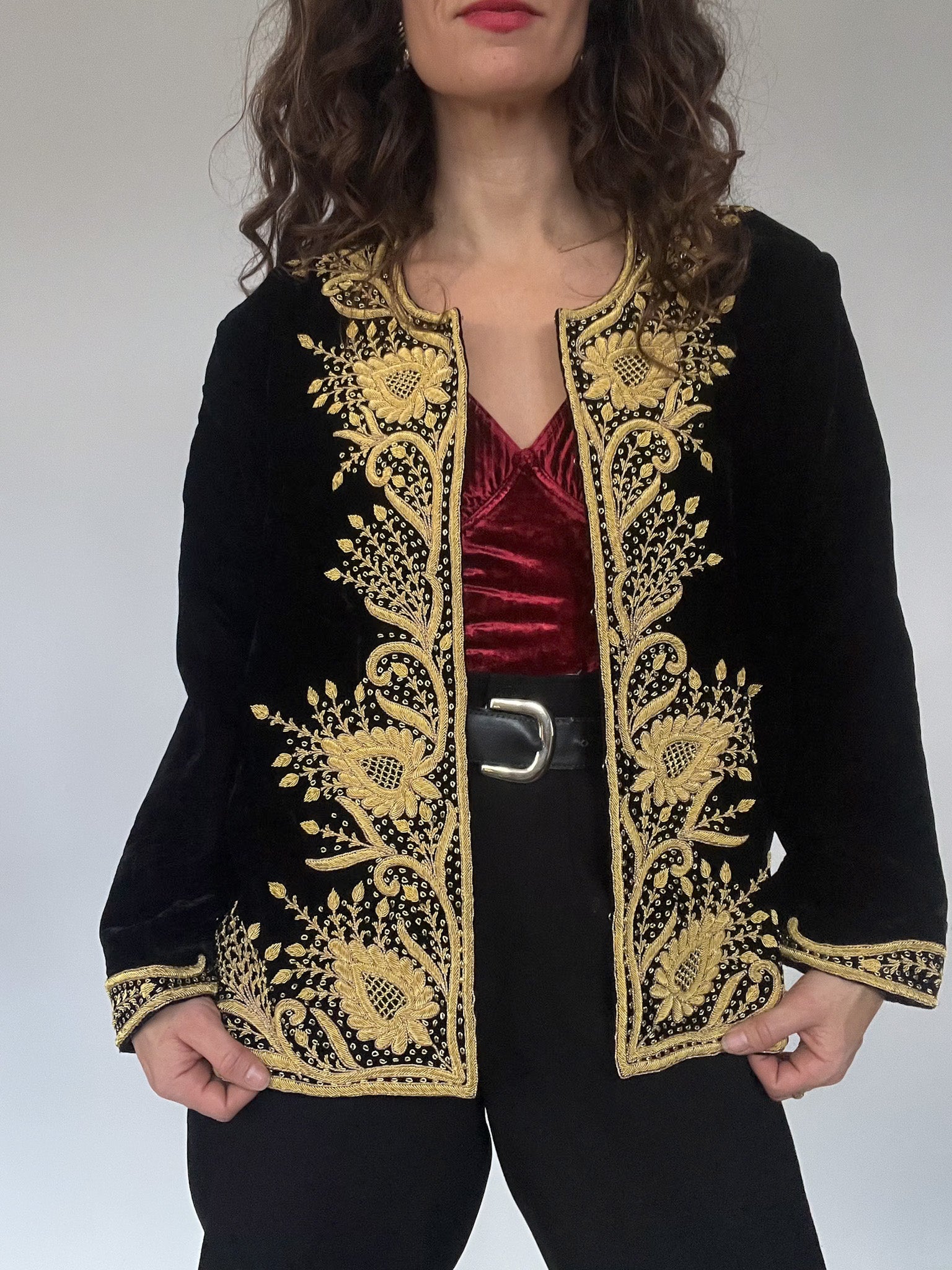 An absolutely iconic 80’s velvet jacket, hand-embellished with intricate golden embroidery and tiny pearls scattered throughout the pattern — a piece that feels almost museum-worthy. The craftsmanship is breathtaking: ornate florals climbing along the front, cuffs and hem, each detail adding depth and richness to the soft black velvet. The silhouette is structured yet fluid, making it just as stunning worn open over a festive look as it is fully closed for maximum impact.