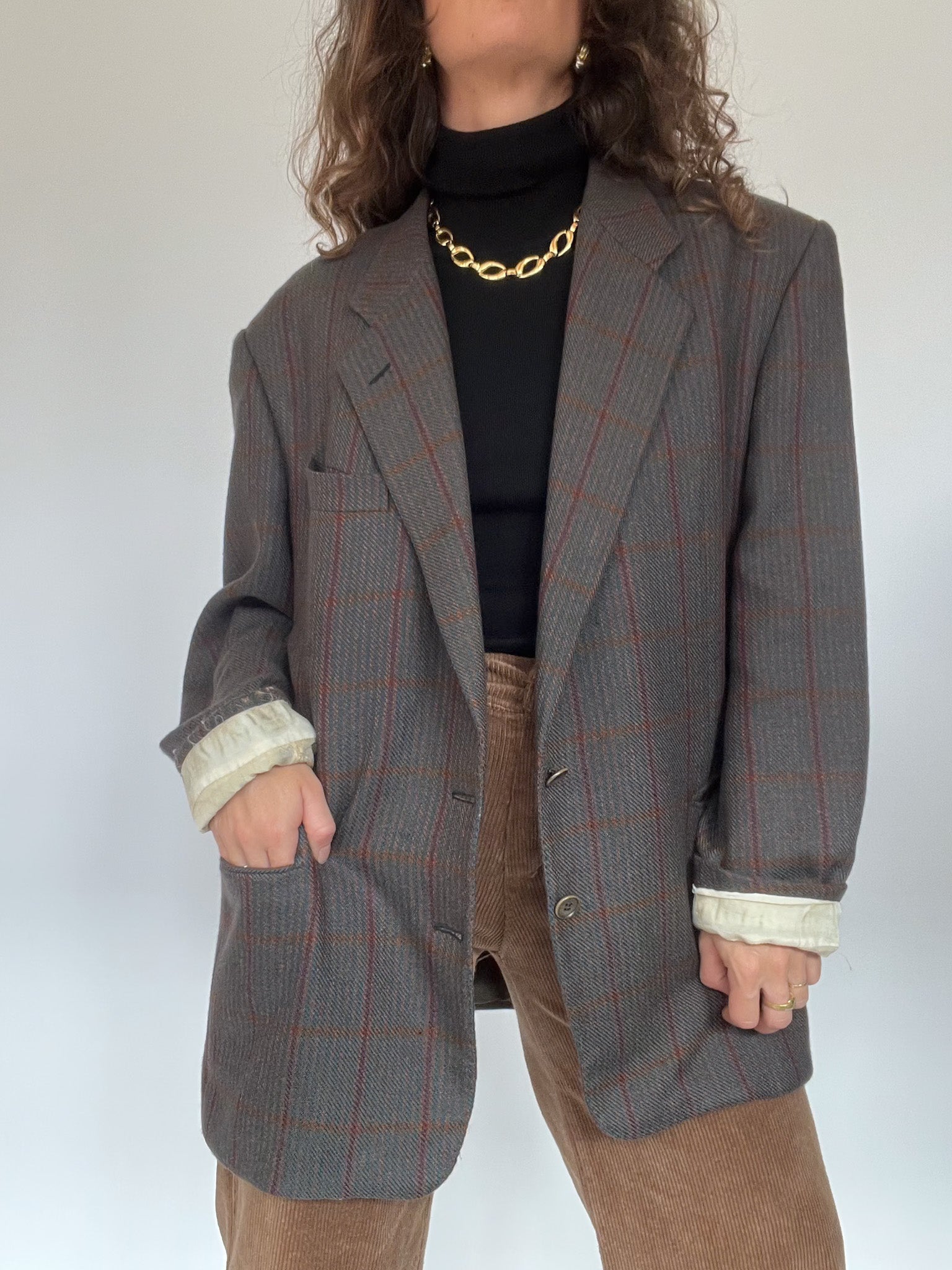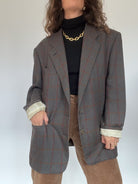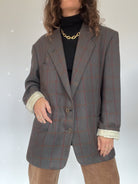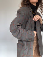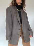 - Special features: Grey check pattern with rust lines, structured shoulders, two-button closure, front pockets