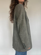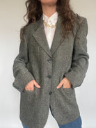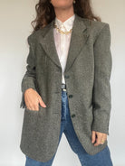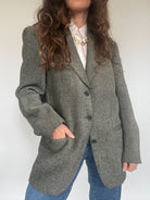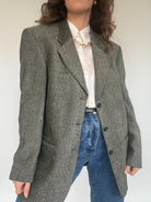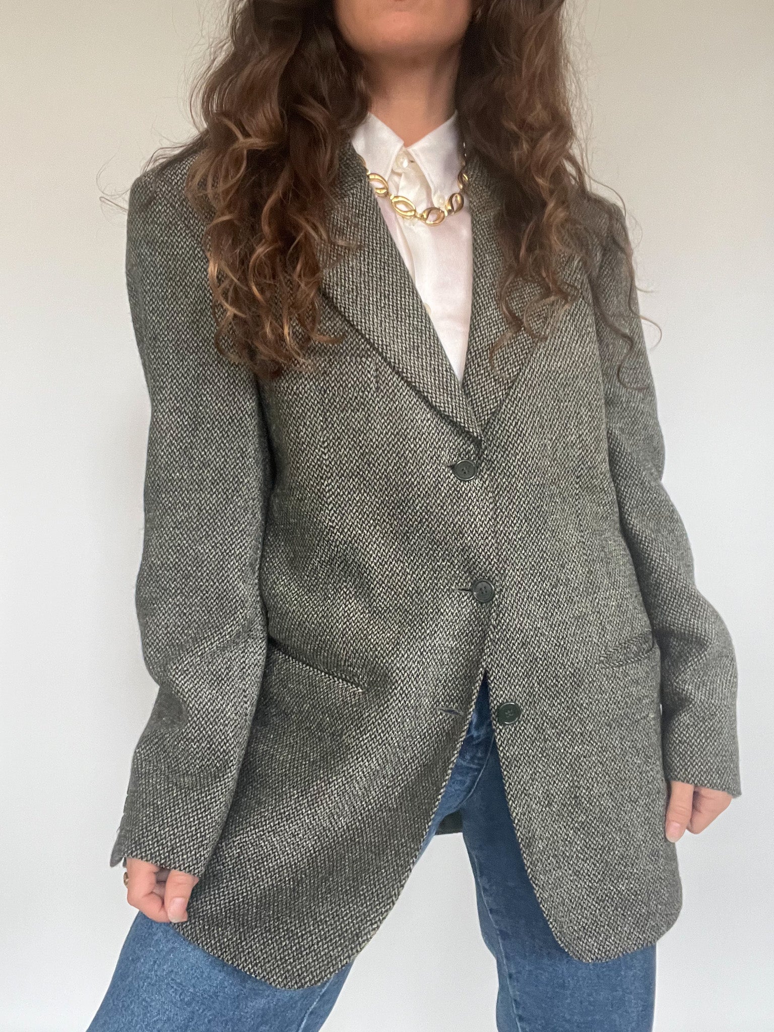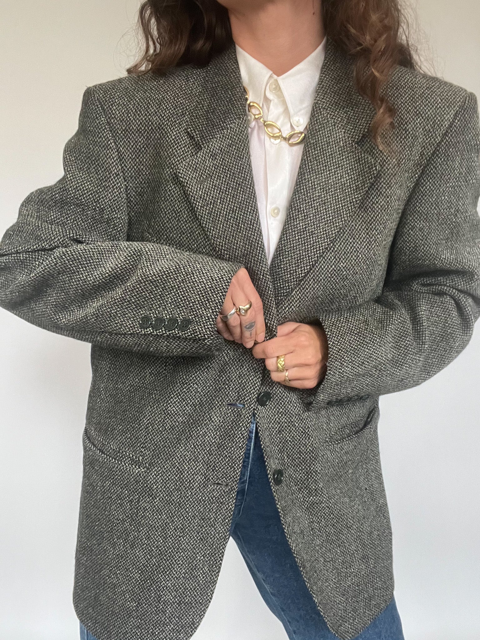 This 80’s wool blazer captures the essence of the decade’s fearless tailoring — structured, confident, and impeccably cut. Its herringbone weave in black and grey tones brings texture and timeless sophistication, while the elongated fit and defined shoulders give it a subtle androgynous power. Perfect layered over a silk shirt or worn loose over denim, it embodies the effortless elegance of the Skorpiones woman: classic, free-spirited, and unafraid to stand out.
