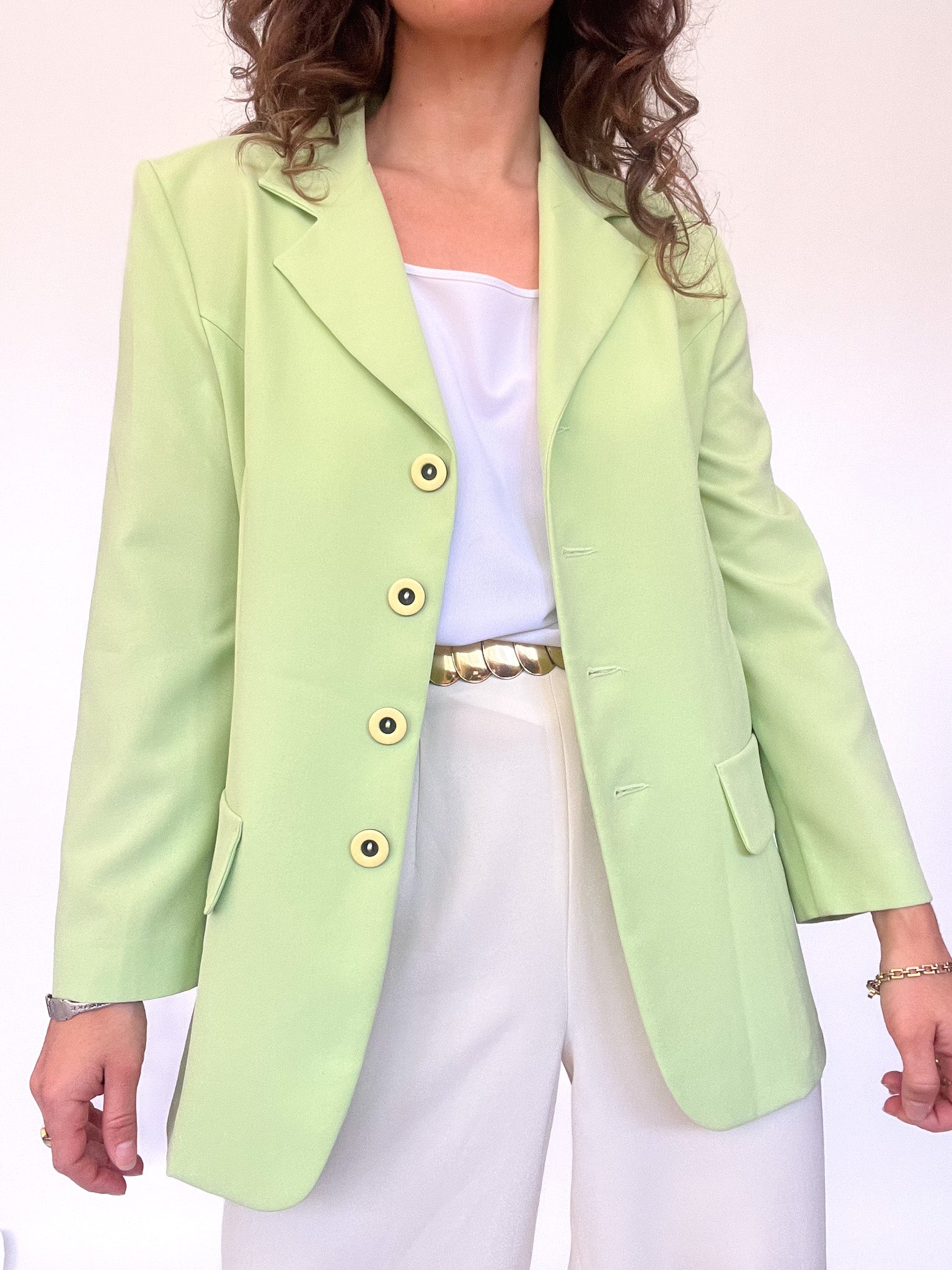 A rare pop of colour straight from the 80’s—this lime green vintage blazer is the ultimate blend of playful boldness and sharp tailoring. Made in Italy and cut in a perfectly structured silhouette, it balances its candy-toned hue with a timeless single-breasted shape and graphic black-rimmed buttons. A statement piece that still feels elegant and wearable, made for those who dare to dress differently without compromising on sophistication. Part of the Skorpiones Vintage curation, this piece celebrates strong femininity with a twist—because iconic style is always a little unexpected.