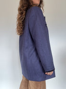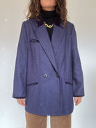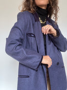 A bold 80’s blazer that blends masculine tailoring with feminine strength. Crafted in deep navy wool with subtle purple stripes, it features a double-breasted silhouette and velvet collar for a touch of sophistication. Its structured shape and precise detailing make it a powerful statement piece — timeless, confident, and unapologetically elegant, just like the Skorpiones woman.