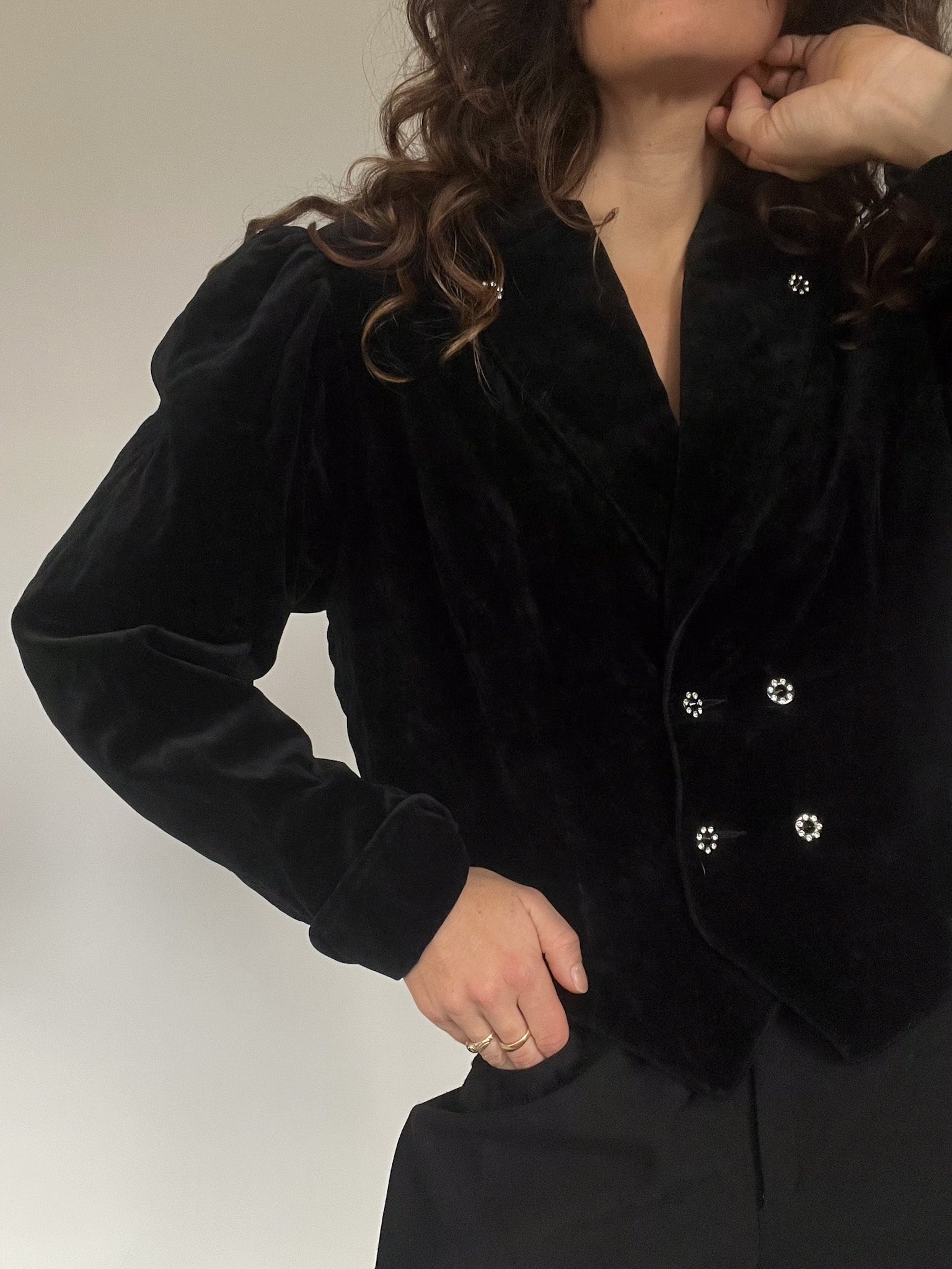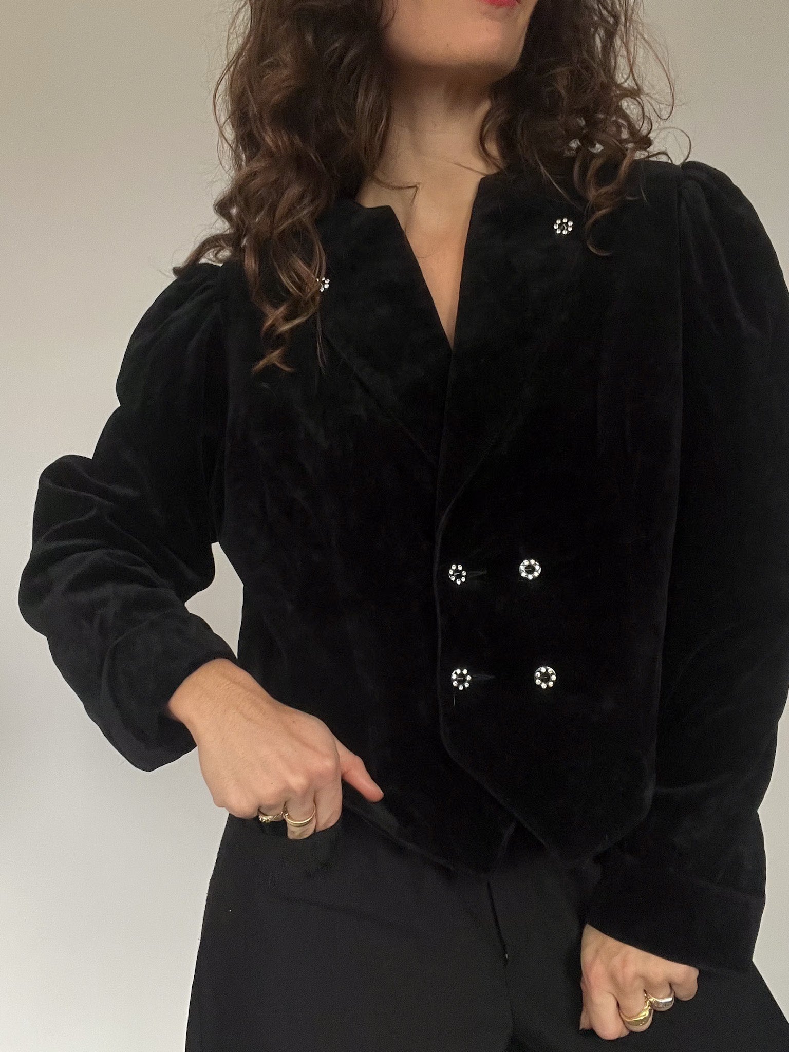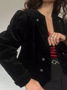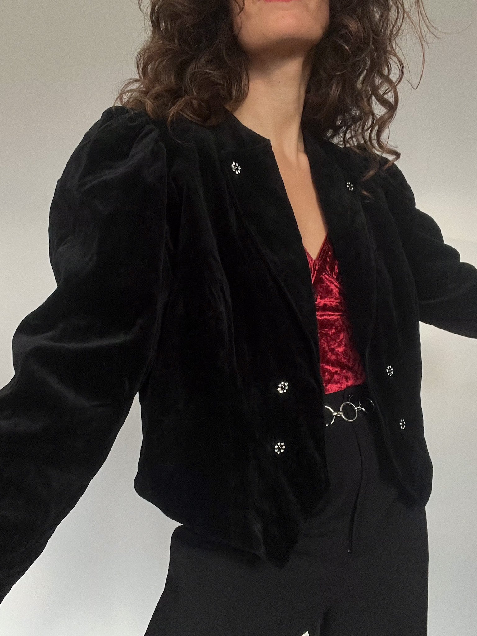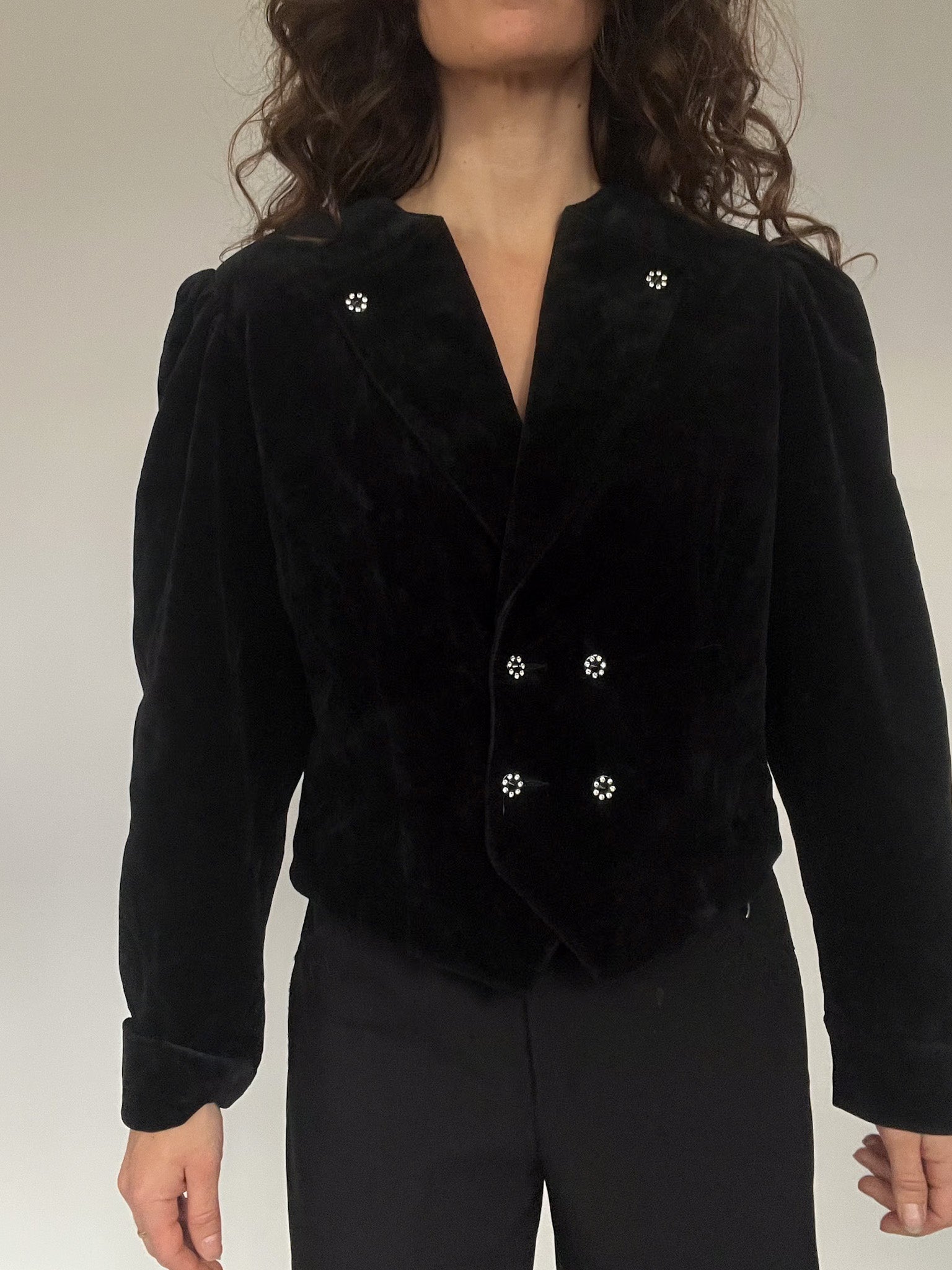 - Special features: Cropped structured cut; crystal-style decorative buttons; pronounced 80’s shoulders; rich black velvet; versatile fit