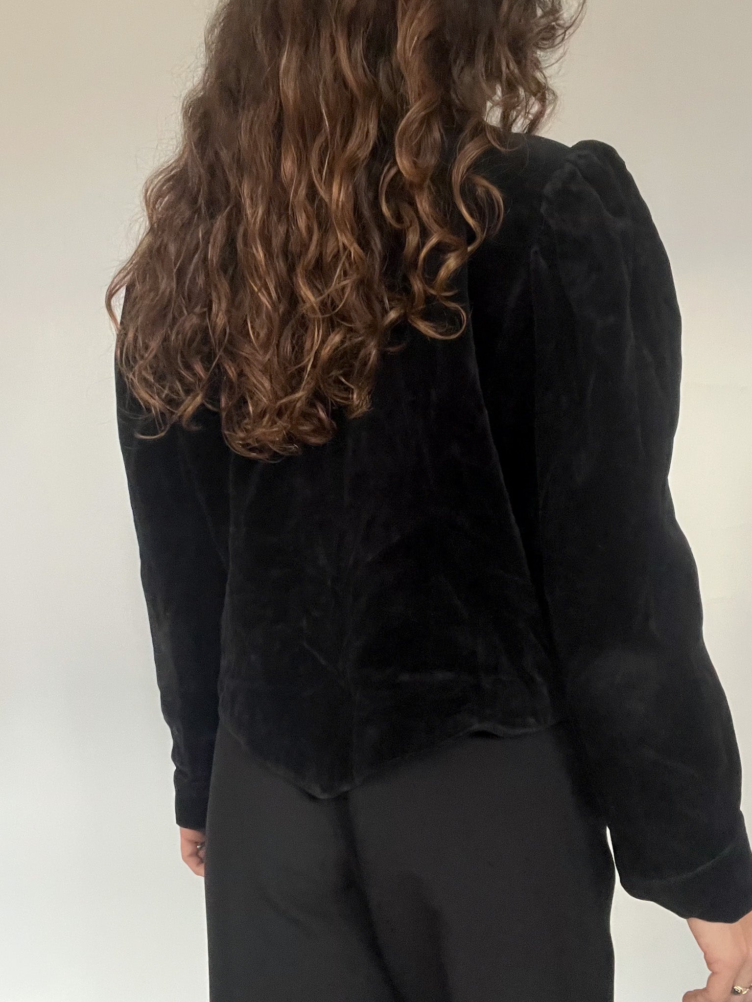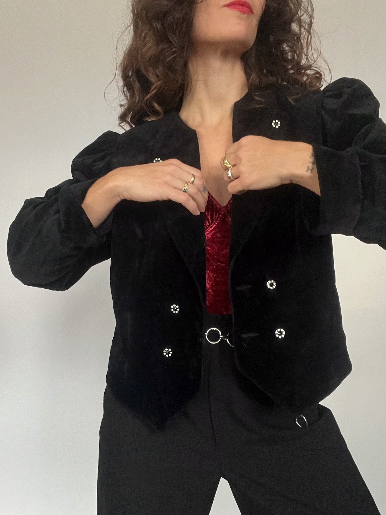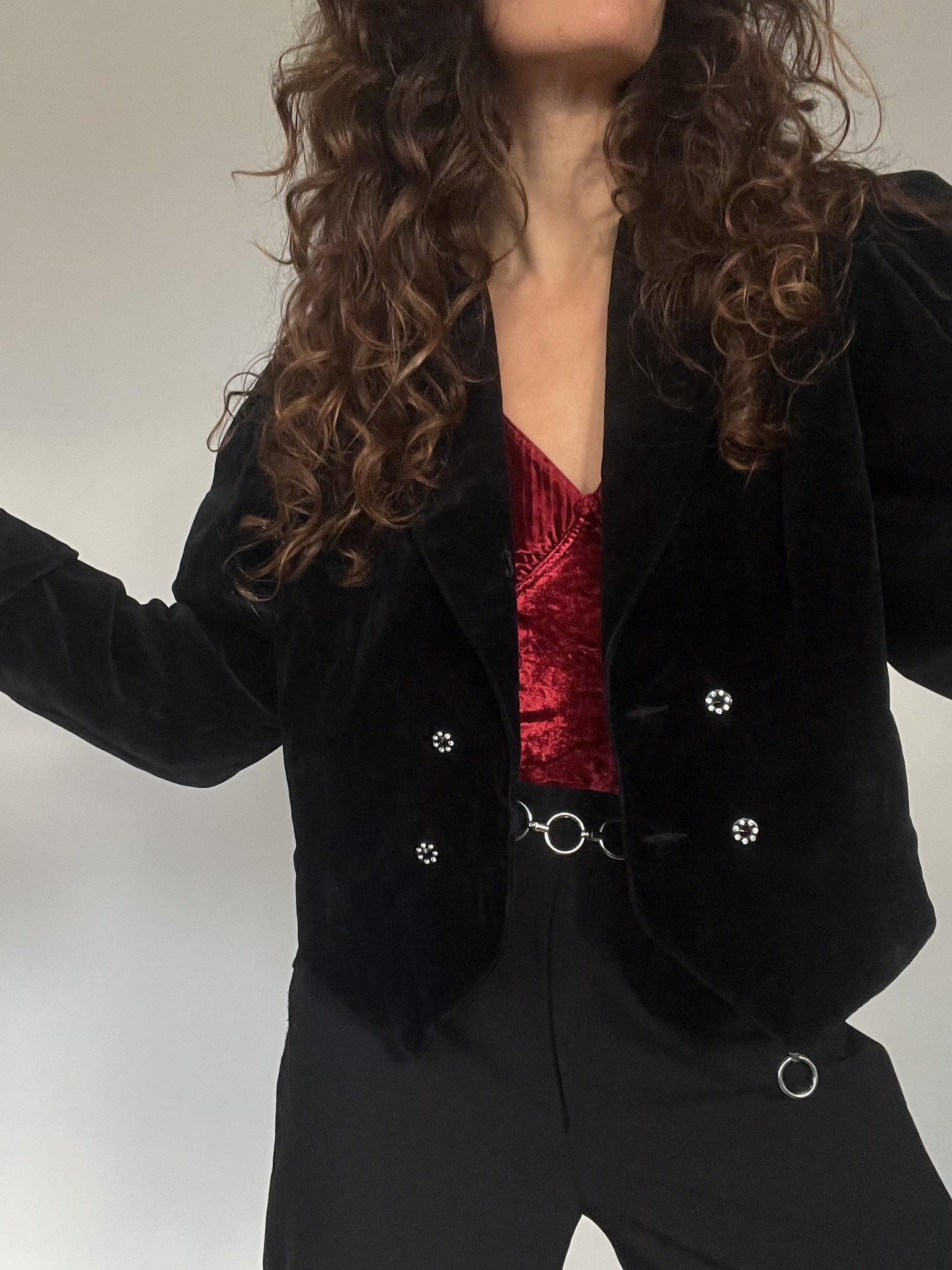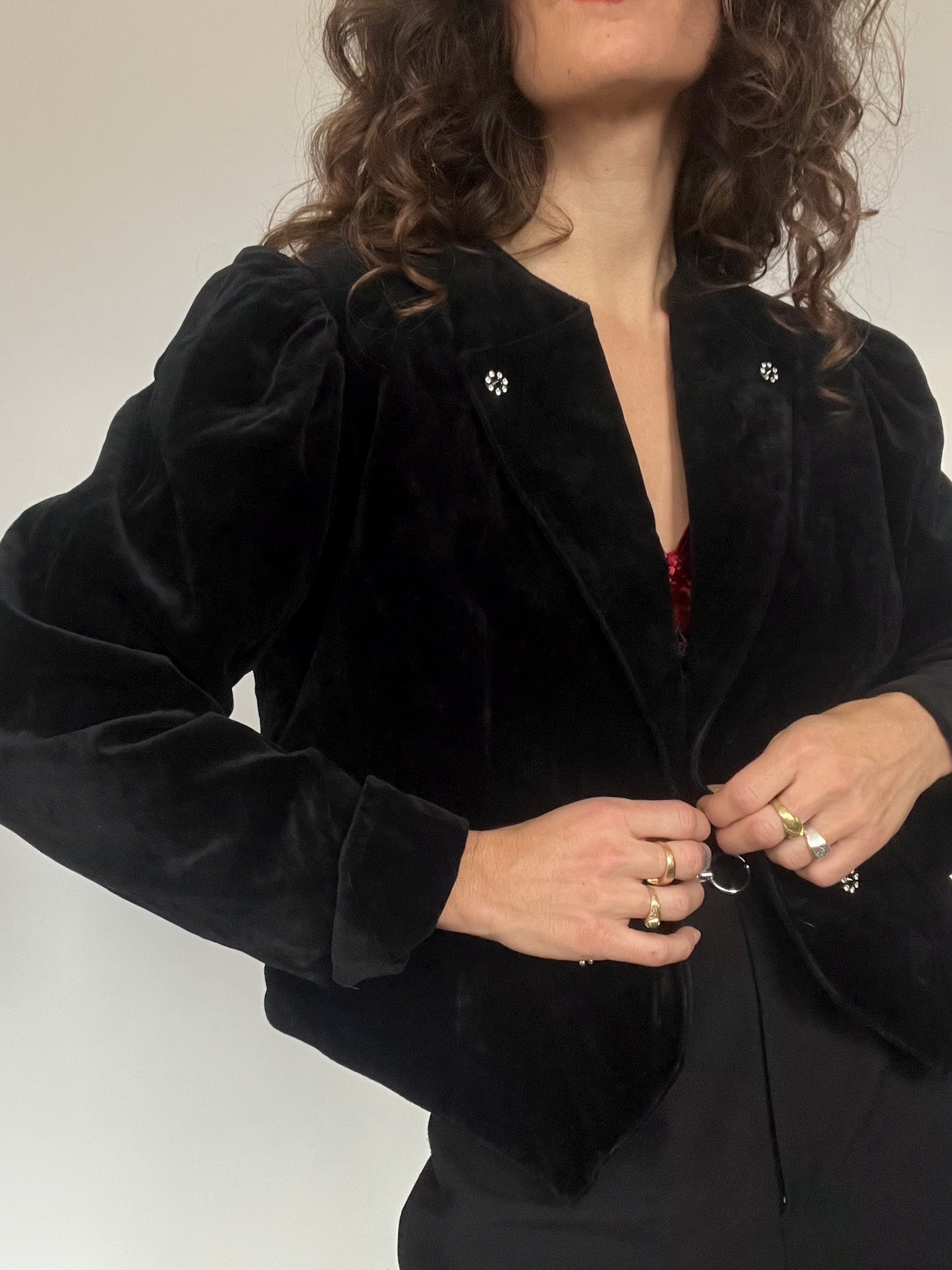 - Special features: Cropped structured cut; crystal-style decorative buttons; pronounced 80’s shoulders; rich black velvet; versatile fit