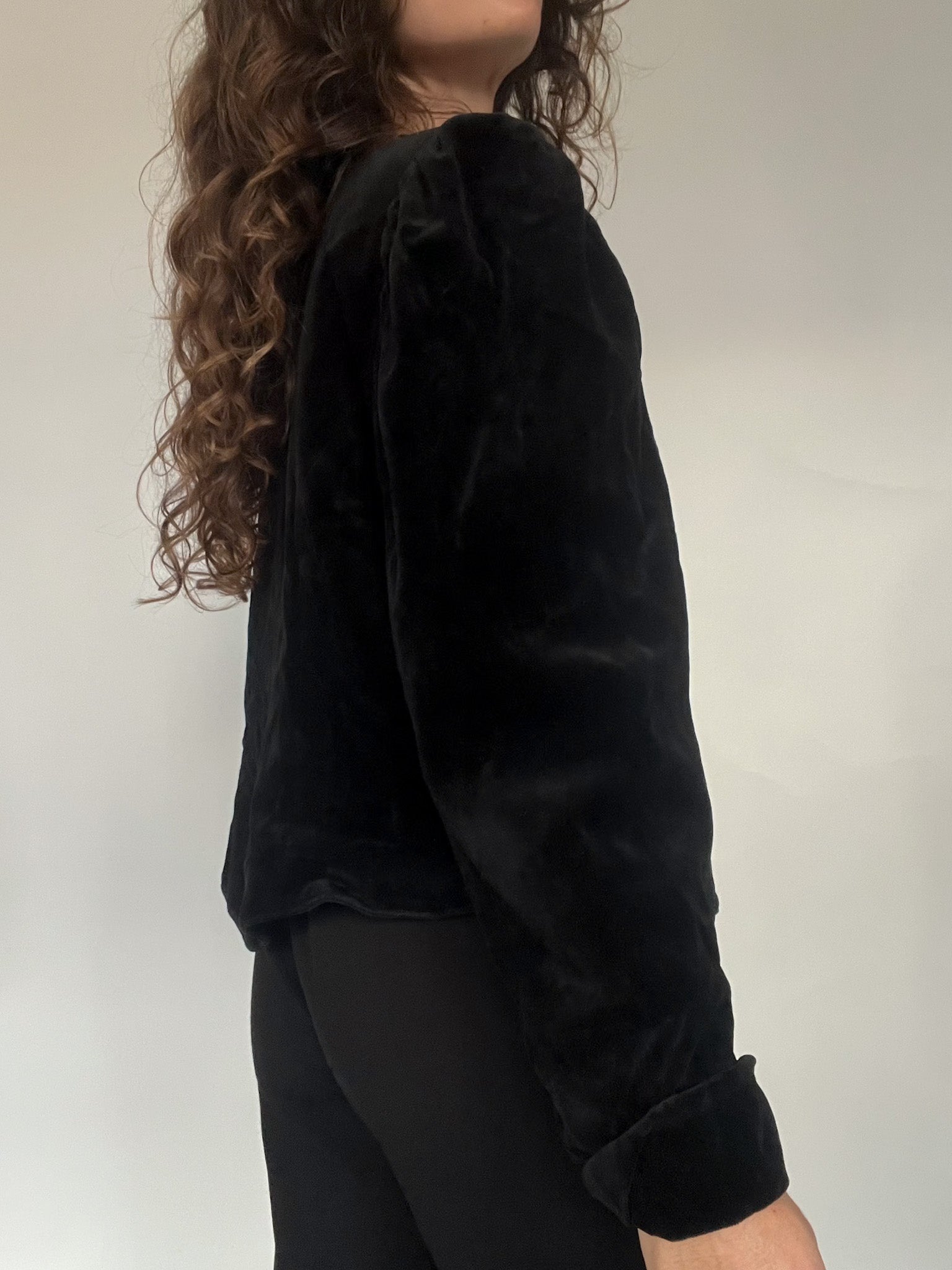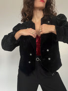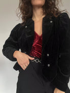 A striking cropped blazer crafted in deep black velvet, selected for its sculptural silhouette and refined evening allure. This piece carries that unmistakable Skorpiones Vintage energy: strong lines, soft textures, and a subtle drama that feels both iconic and timeless. The sharp front cut and structured shoulders create an elegant statement, while the crystal-style buttons add a luminous contrast against the rich velvet. Despite being marked as a size L, it fits beautifully on smaller frames as well, offering that intentionally tailored yet relaxed 80’s effect. It’s the kind of blazer that elevates any festive look instantly, whether styled over a camisole, a velvet top, or even a sleek all-black ensemble. A true celebration of vintage craftsmanship designed to empower and highlight individuality.