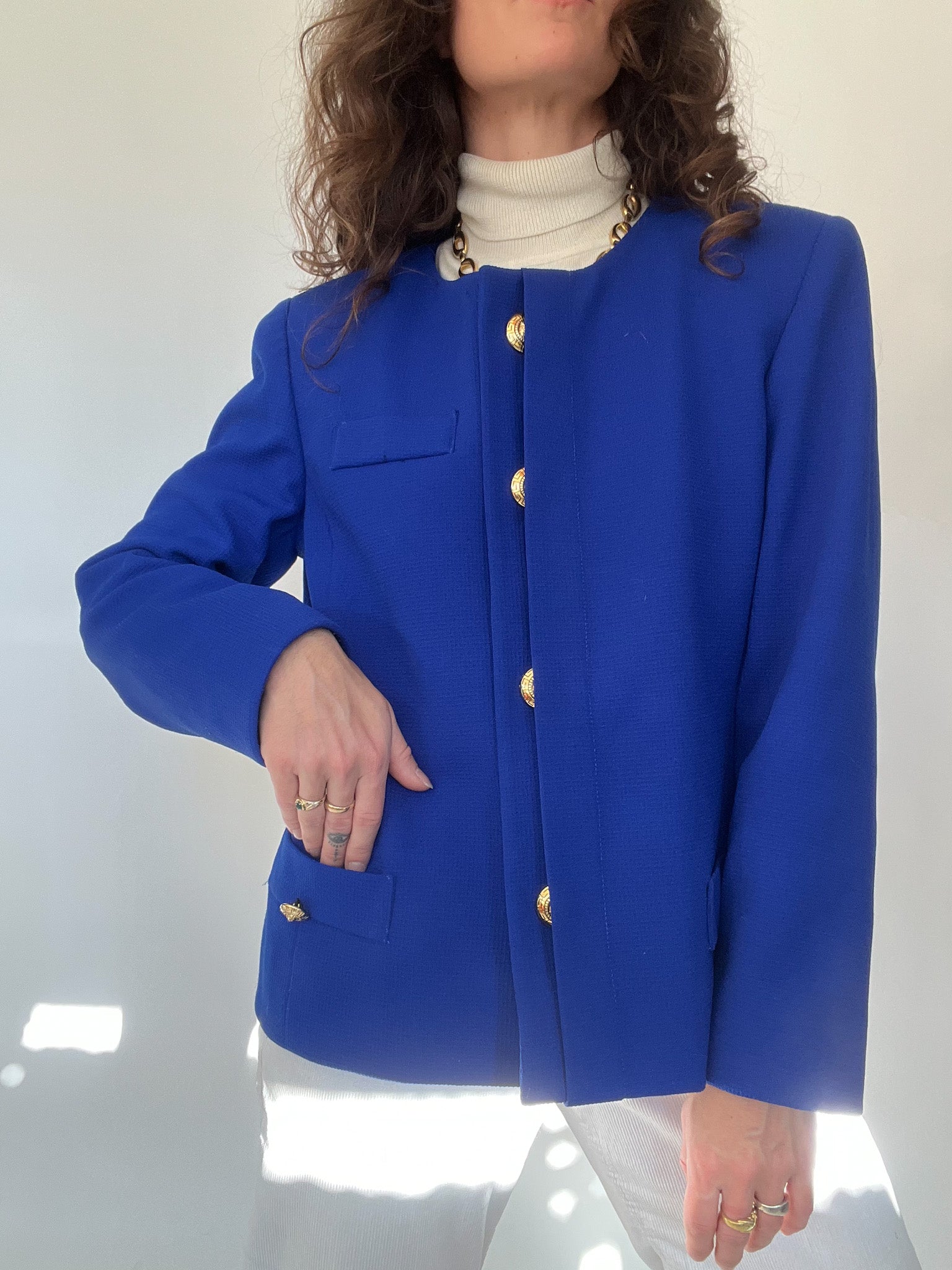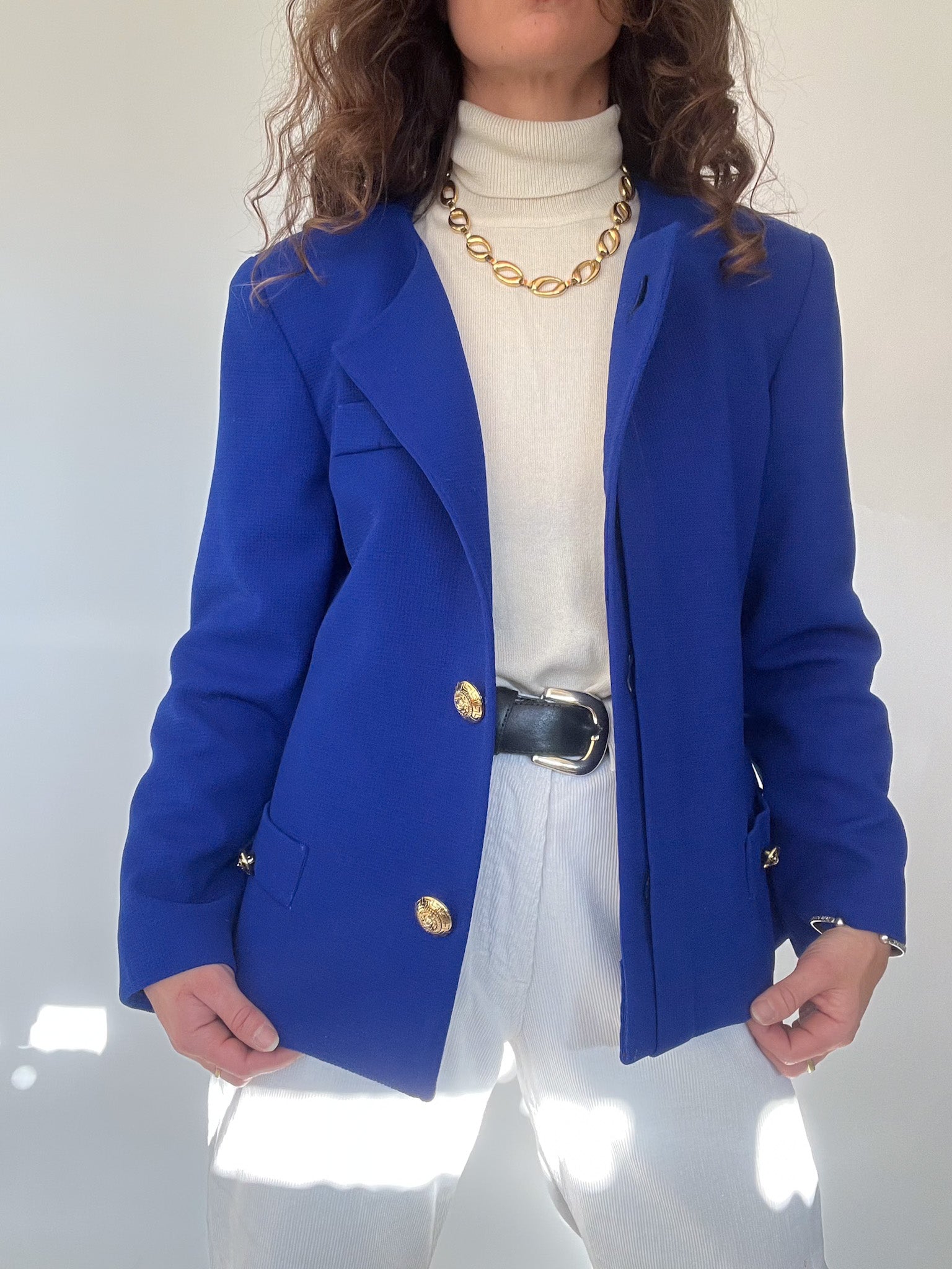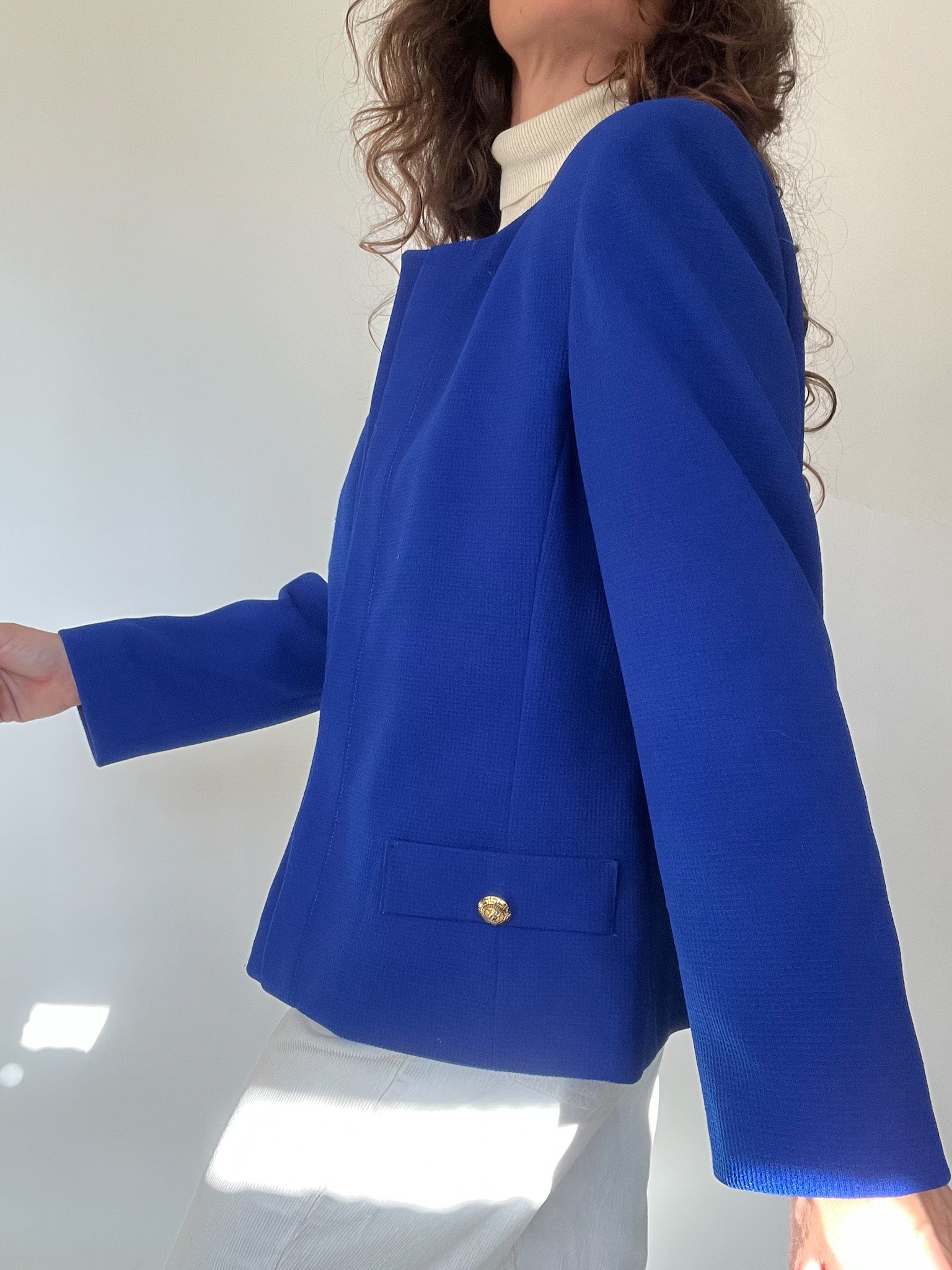 A powerful 90’s statement piece in an exceptional electric blue — that bold, radiant shade that instantly channels the glamour and confidence of the era. Selected for its unmistakable Versace-inspired energy, this blazer blends sharp sophistication with a touch of extravagance, true to the Skorpiones Vintage spirit: iconic colours, expressive silhouettes, and pieces that make you feel unapologetically unique.