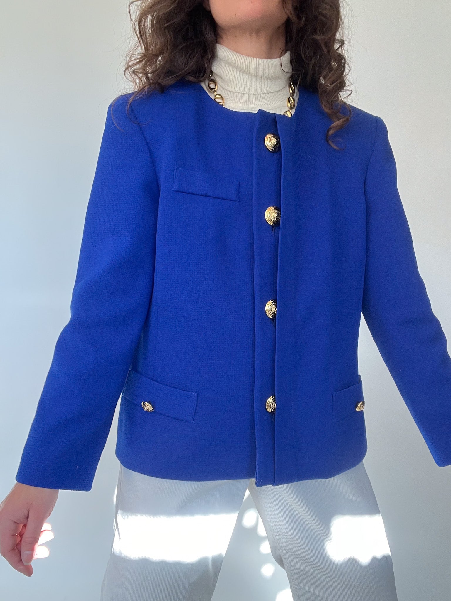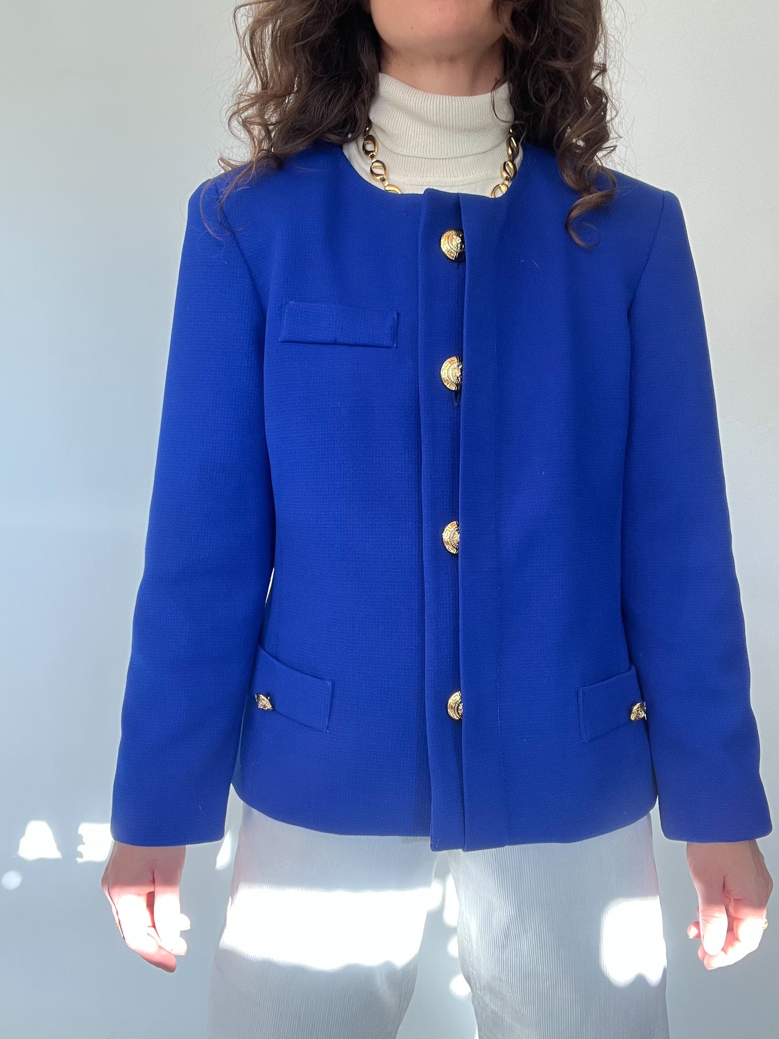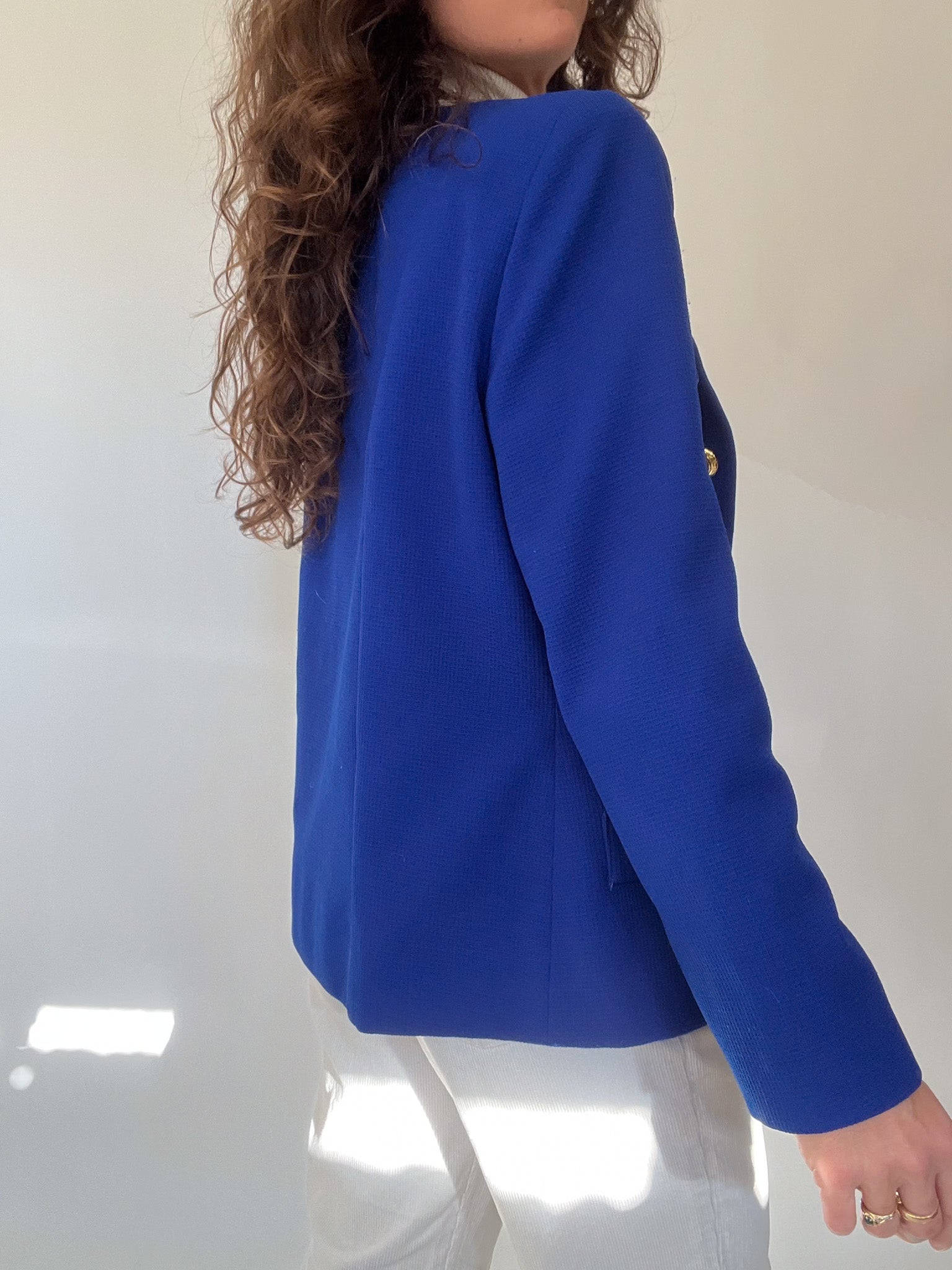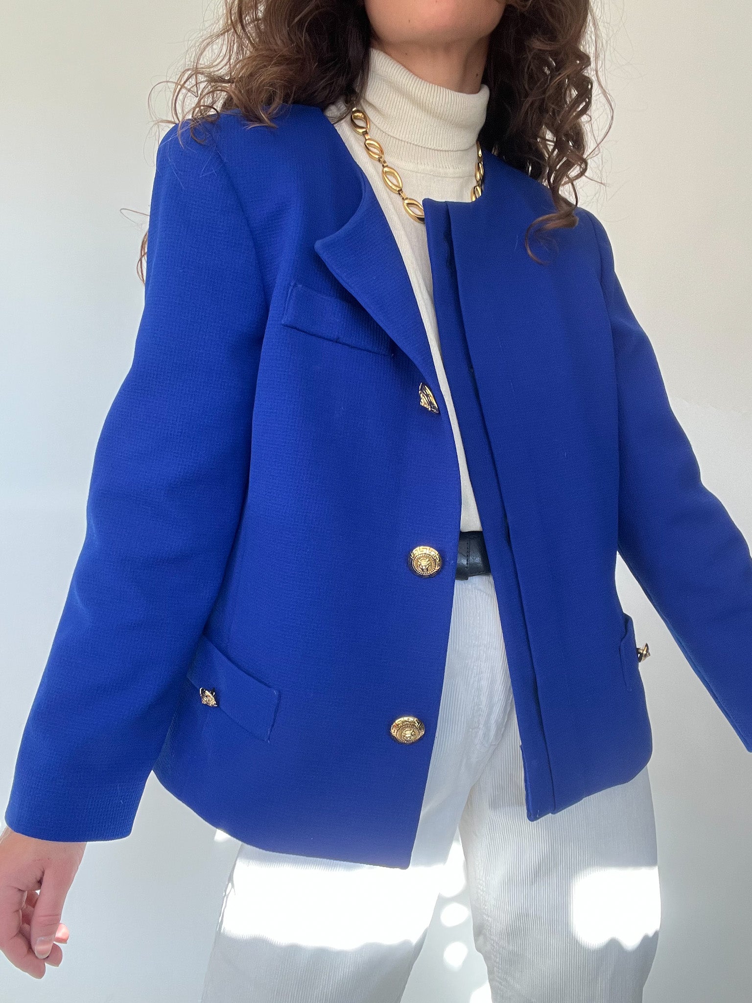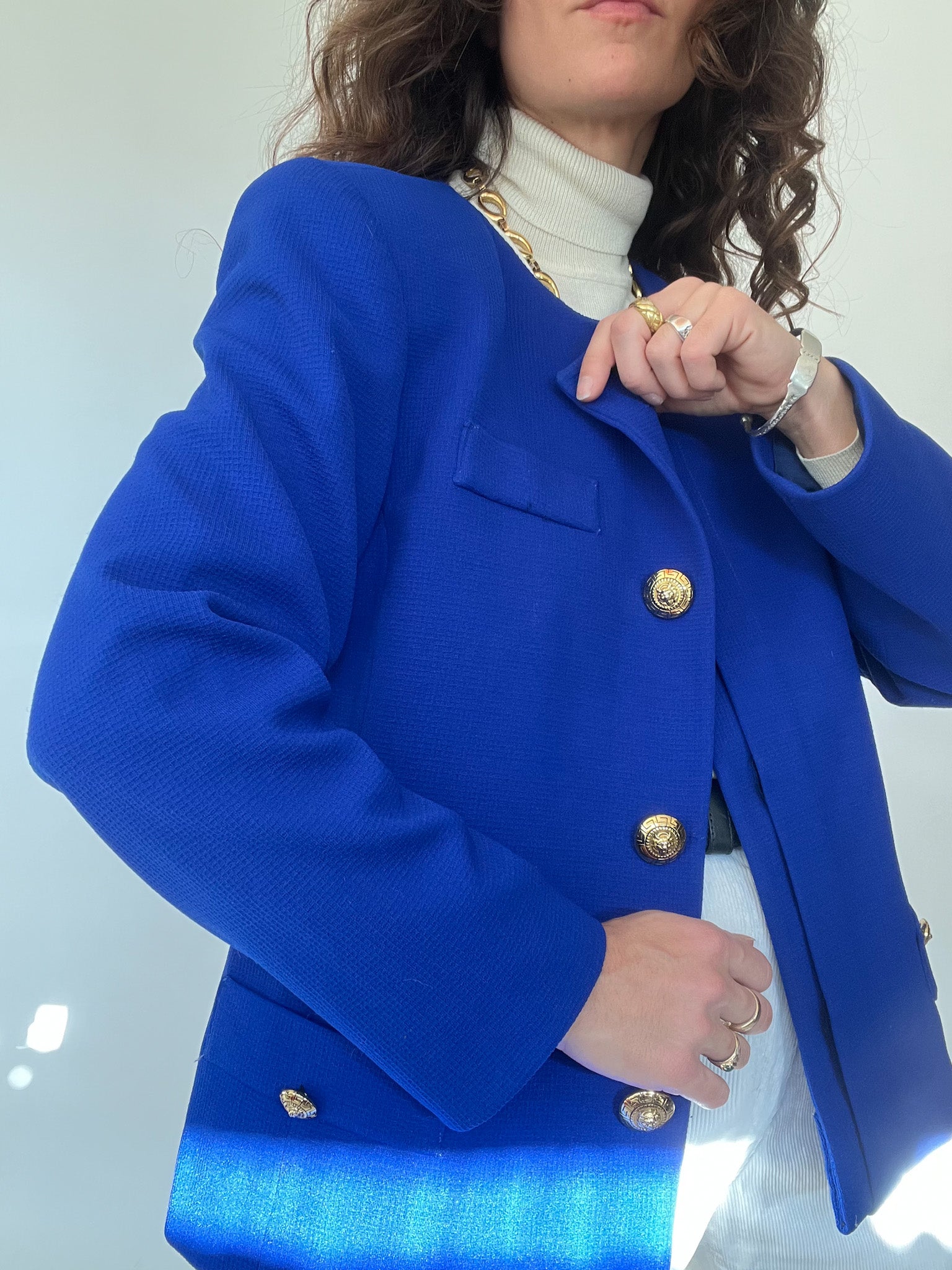 • Special features: Electric blue tone; Versace-inspired design; gold sculpted buttons; structured wool tailoring