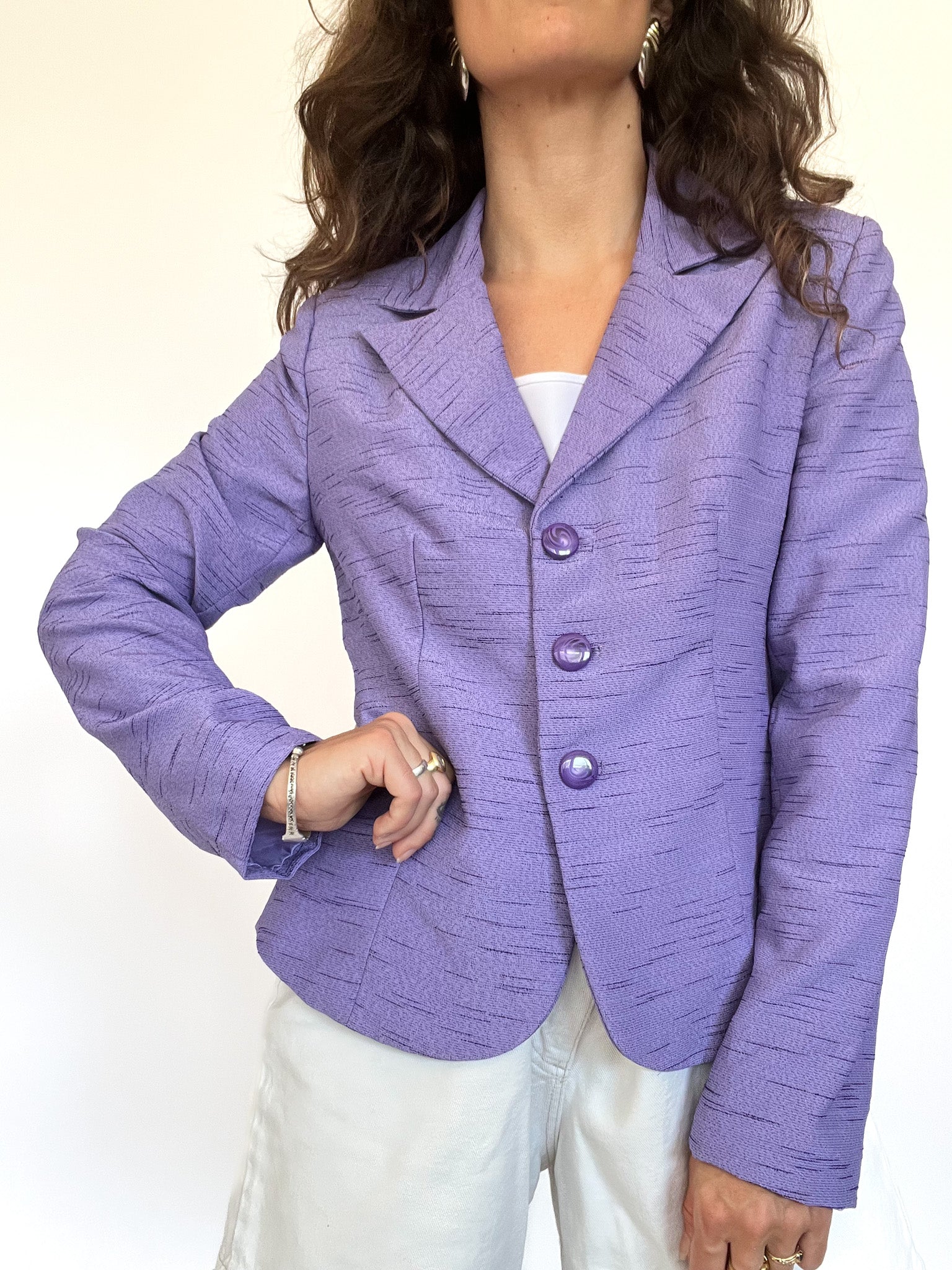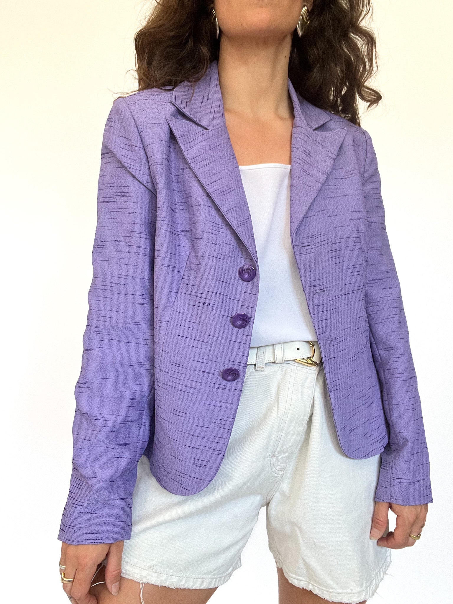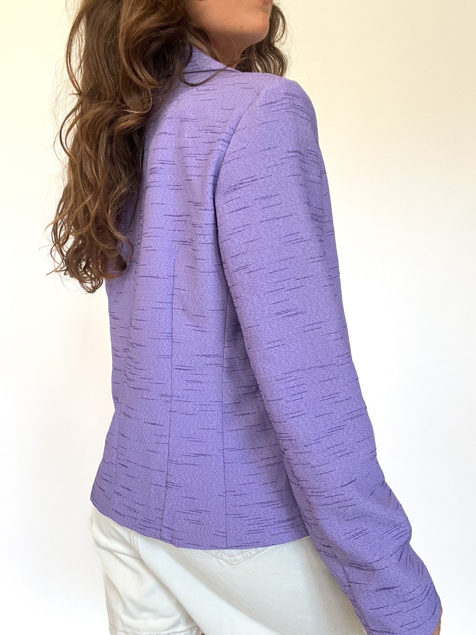 This vintage lilac blazer is a rare gem that blends softness and structure. Its unique textured fabric and curved hemline give it a feminine twist, while the tailored cut and tone-on-tone buttons keep it sharp and modern. A piece that carries the quiet confidence of the ’90s, made for those who love standing out without raising their voice. At Skorpiones Vintage, we handpick blazers that empower – this one is no exception.