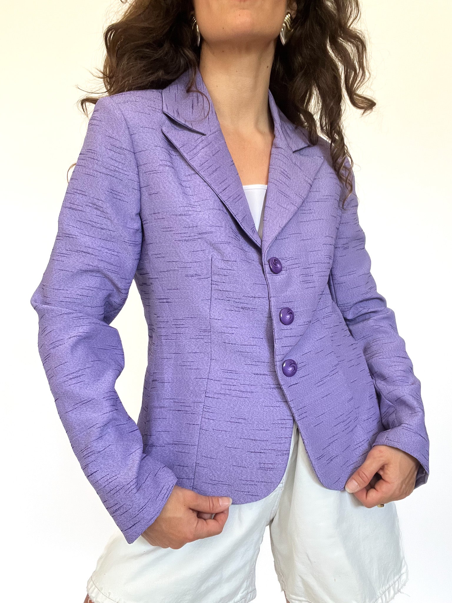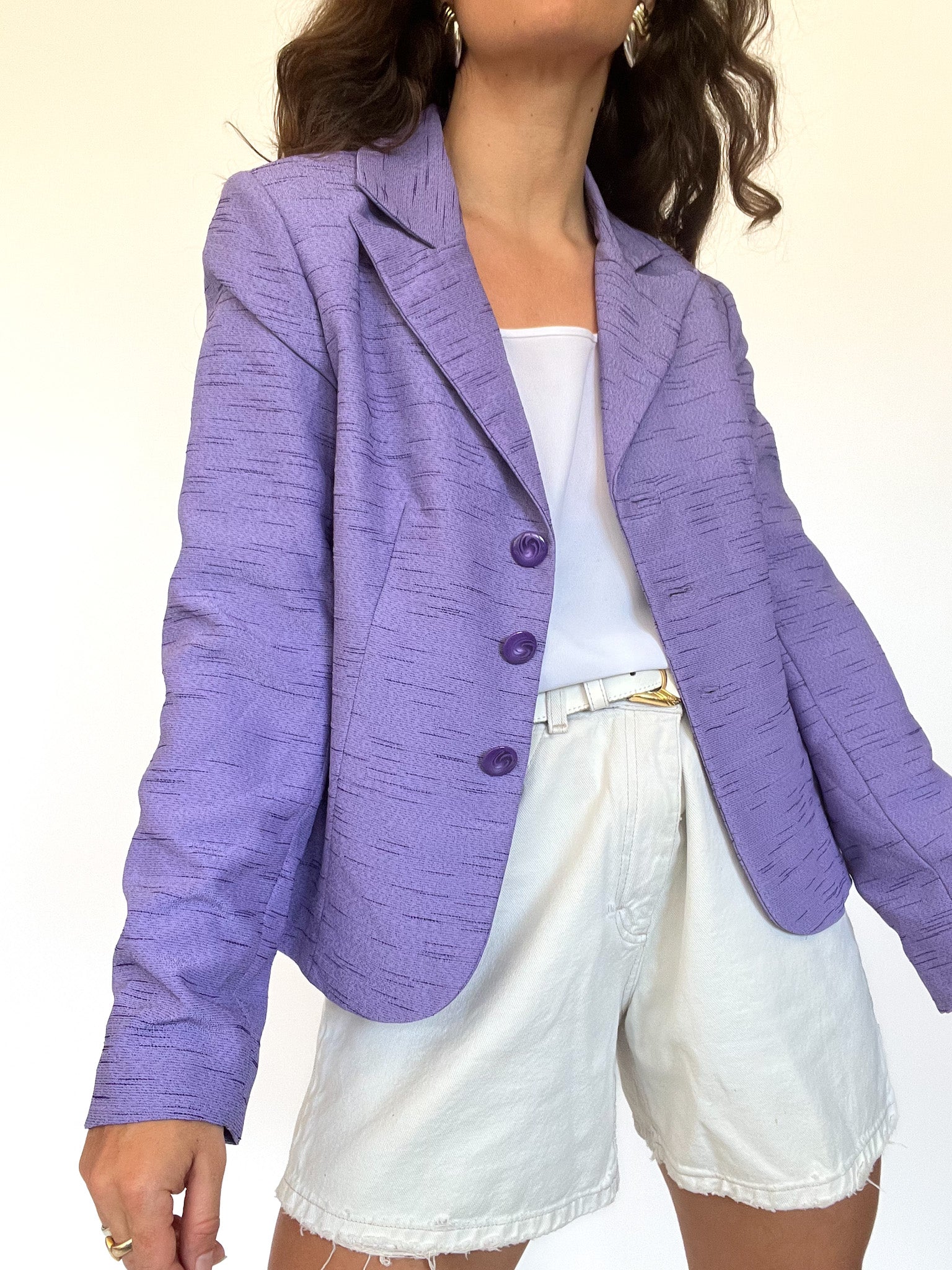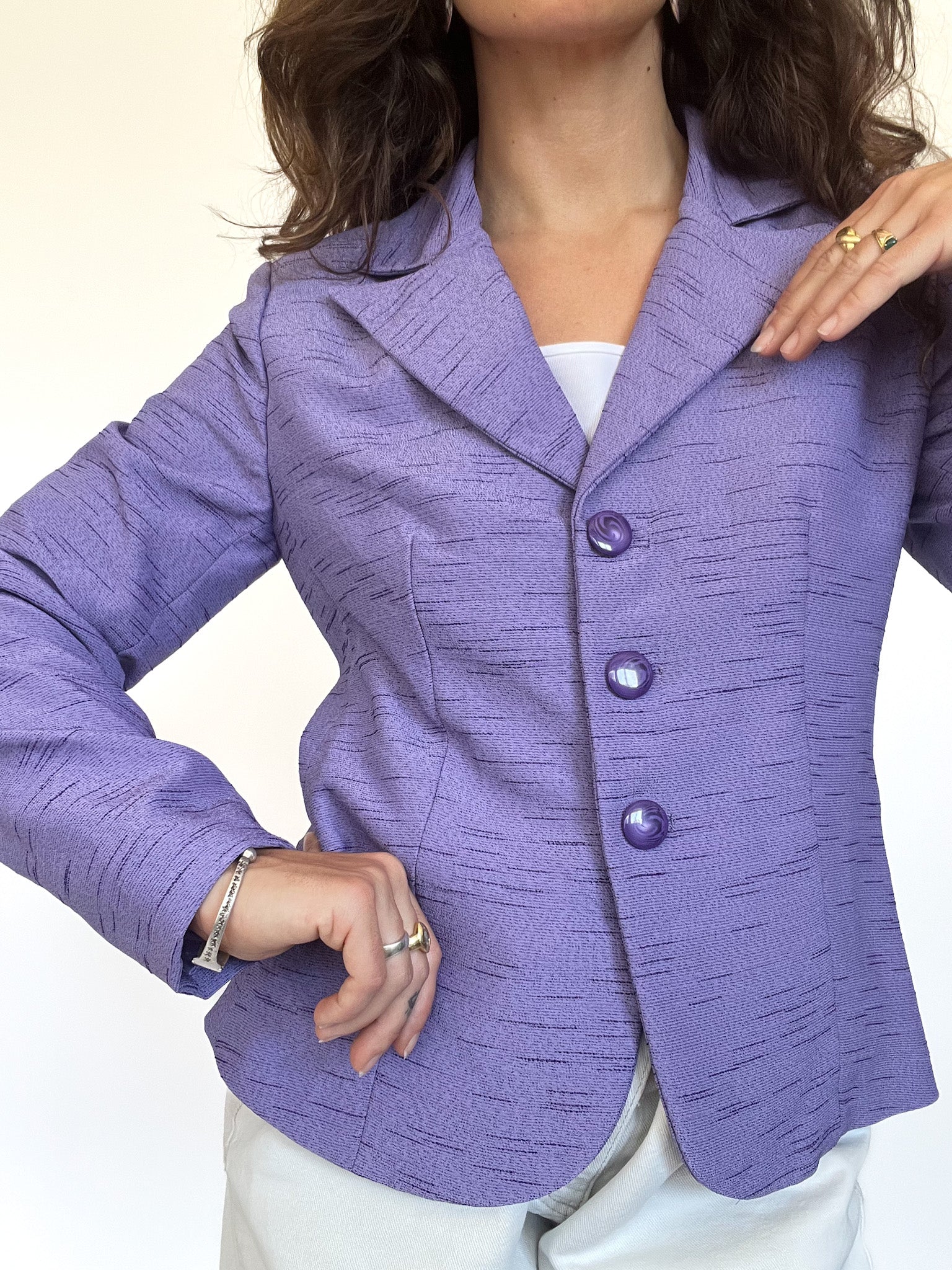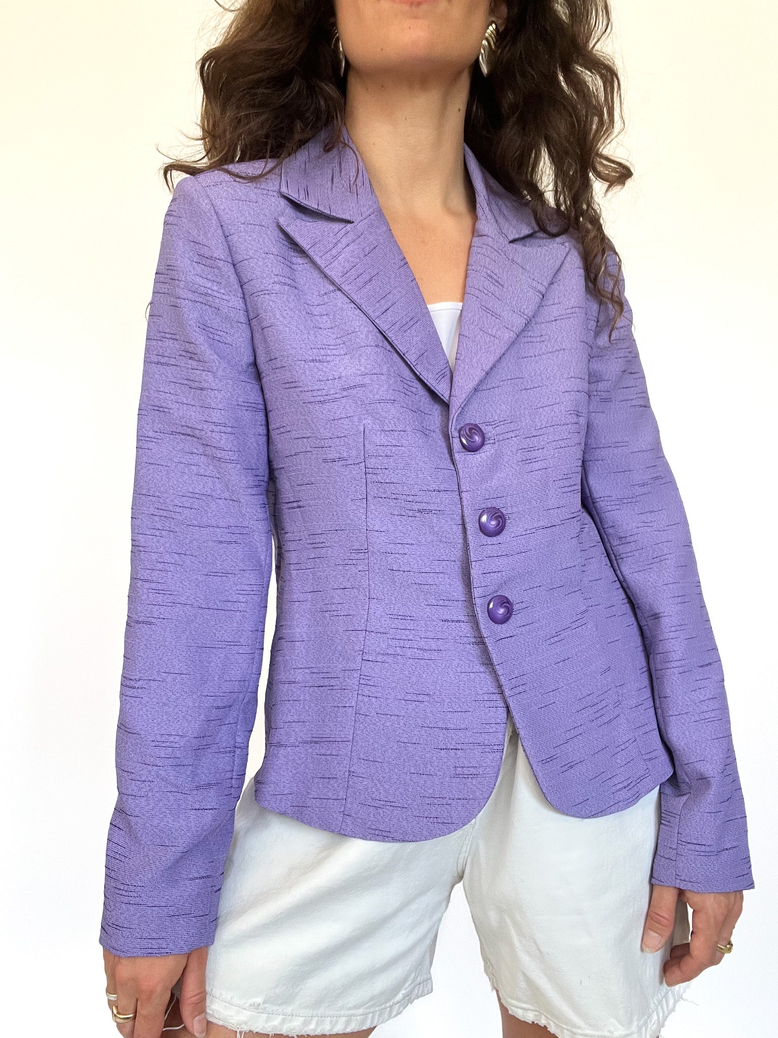 This vintage lilac blazer is a rare gem that blends softness and structure. Its unique textured fabric and curved hemline give it a feminine twist, while the tailored cut and tone-on-tone buttons keep it sharp and modern. A piece that carries the quiet confidence of the ’90s, made for those who love standing out without raising their voice. At Skorpiones Vintage, we handpick blazers that empower – this one is no exception.