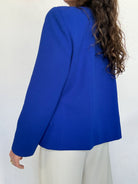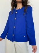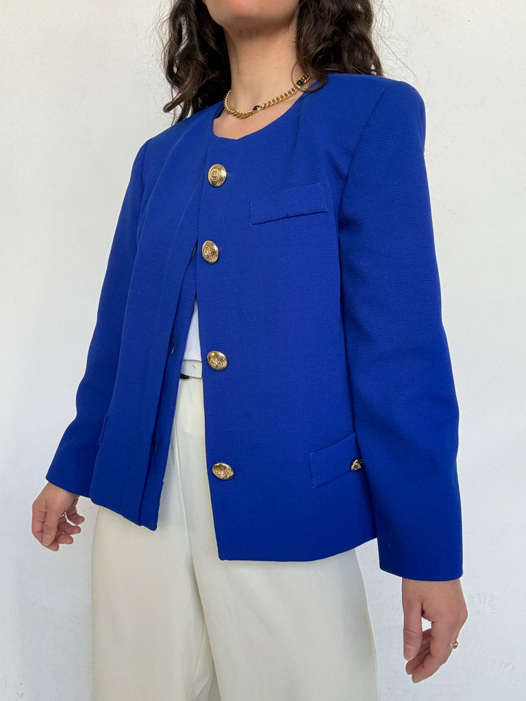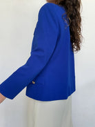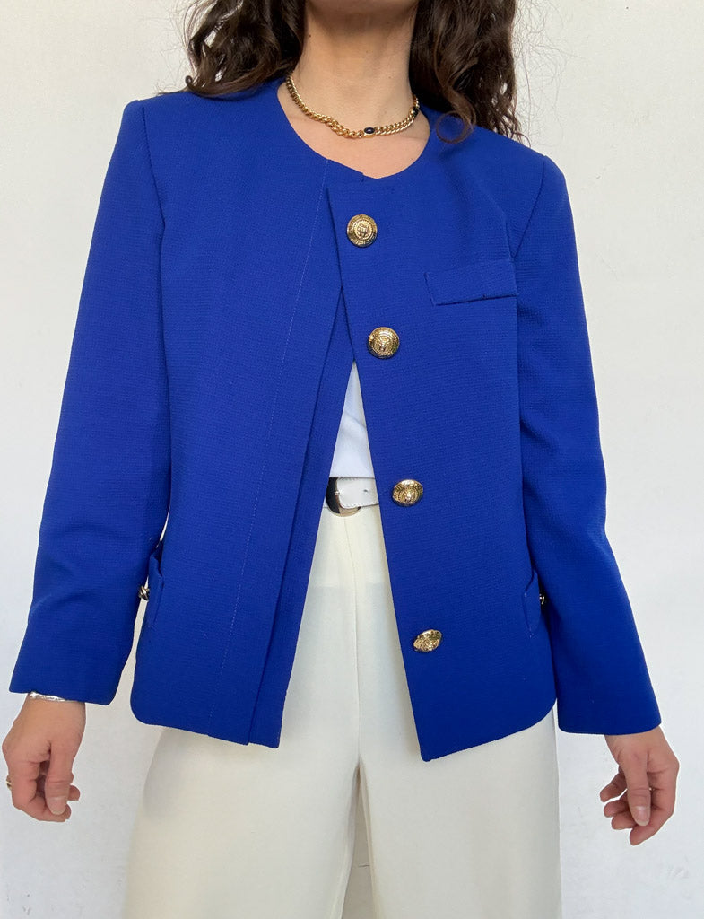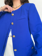 A statement of pure elegance. The striking royal blue instantly commands attention, while the structured cut and gold buttons bring a refined, almost couture inspired presence. This piece carries a strong, confident energy, elevated by its clean lines and impeccable tailoring. Chosen for its powerful color and timeless sophistication, it is the kind of jacket that defines a silhouette.