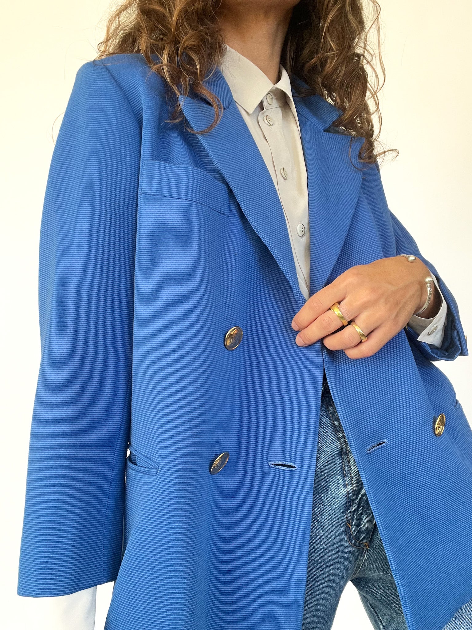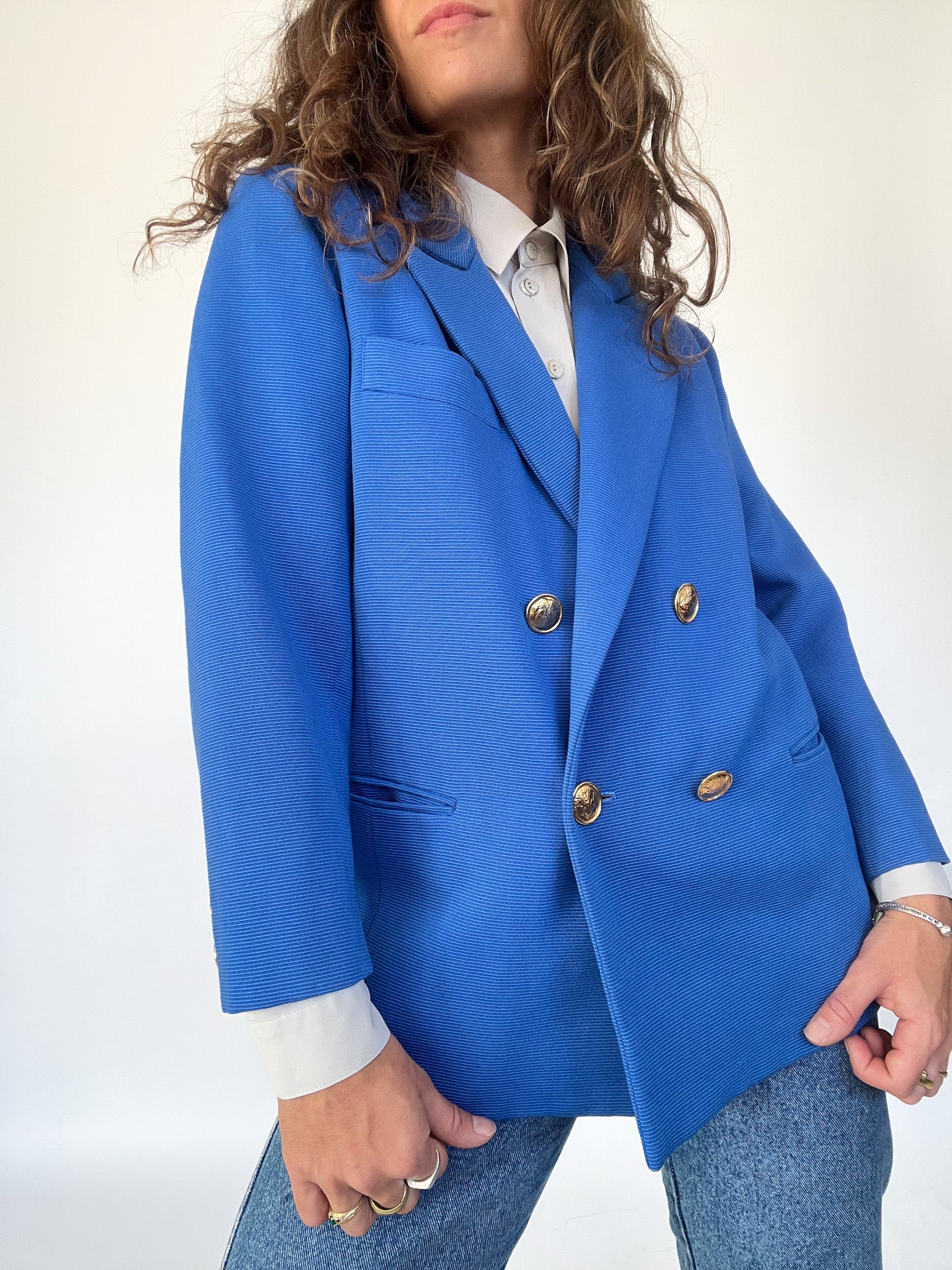 Step into a statement of modern sophistication with this electric blue double-breasted blazer. Featuring a striking gold button detail, this blazer offers a structured fit that flatters the silhouette while adding a pop of bold color to your wardrobe. The notched lapel and tailored finish ensure an elegant look, perfect for both casual and formal occasions. Whether paired with jeans or slacks, this blazer elevates any ensemble with its vibrant hue and sleek design.