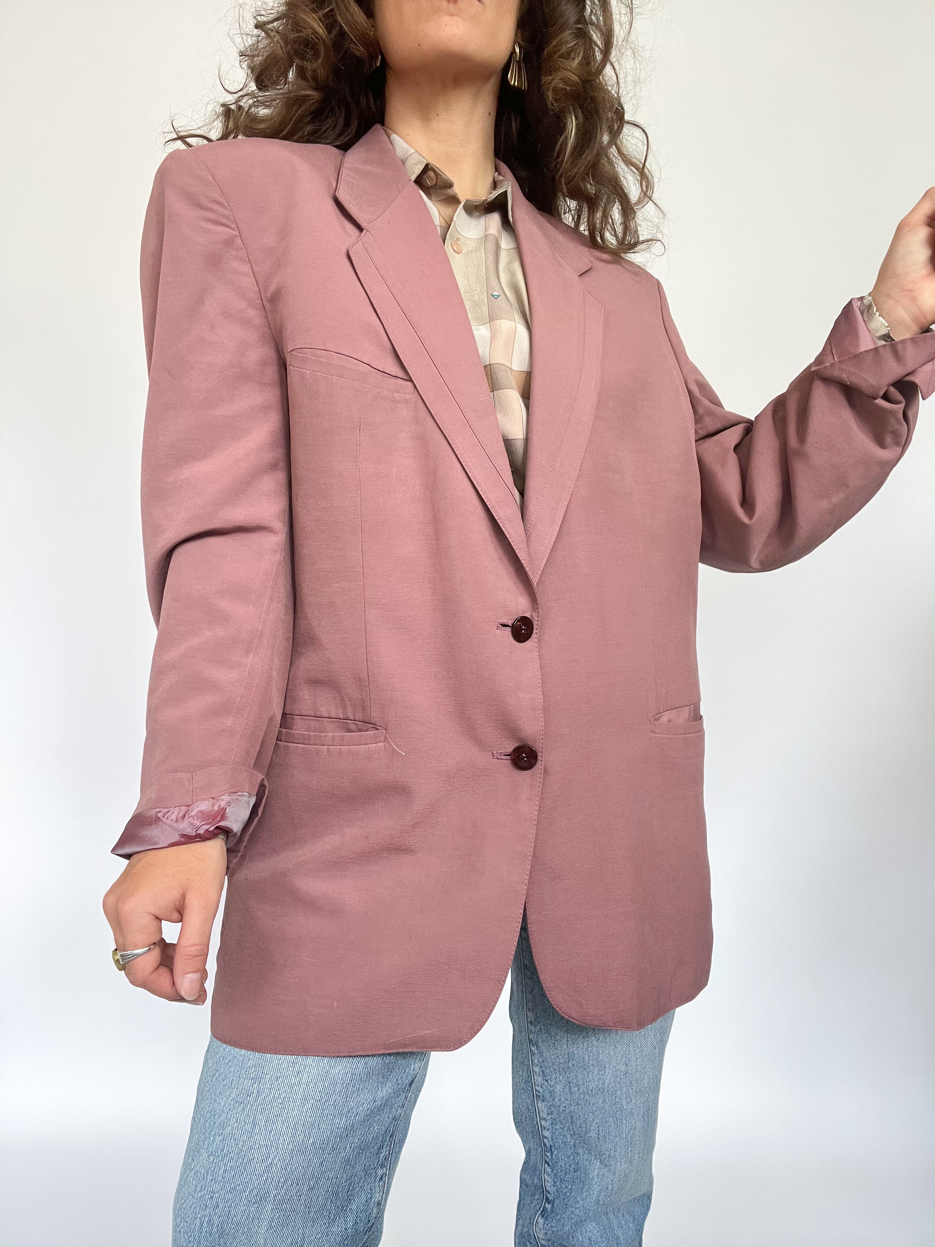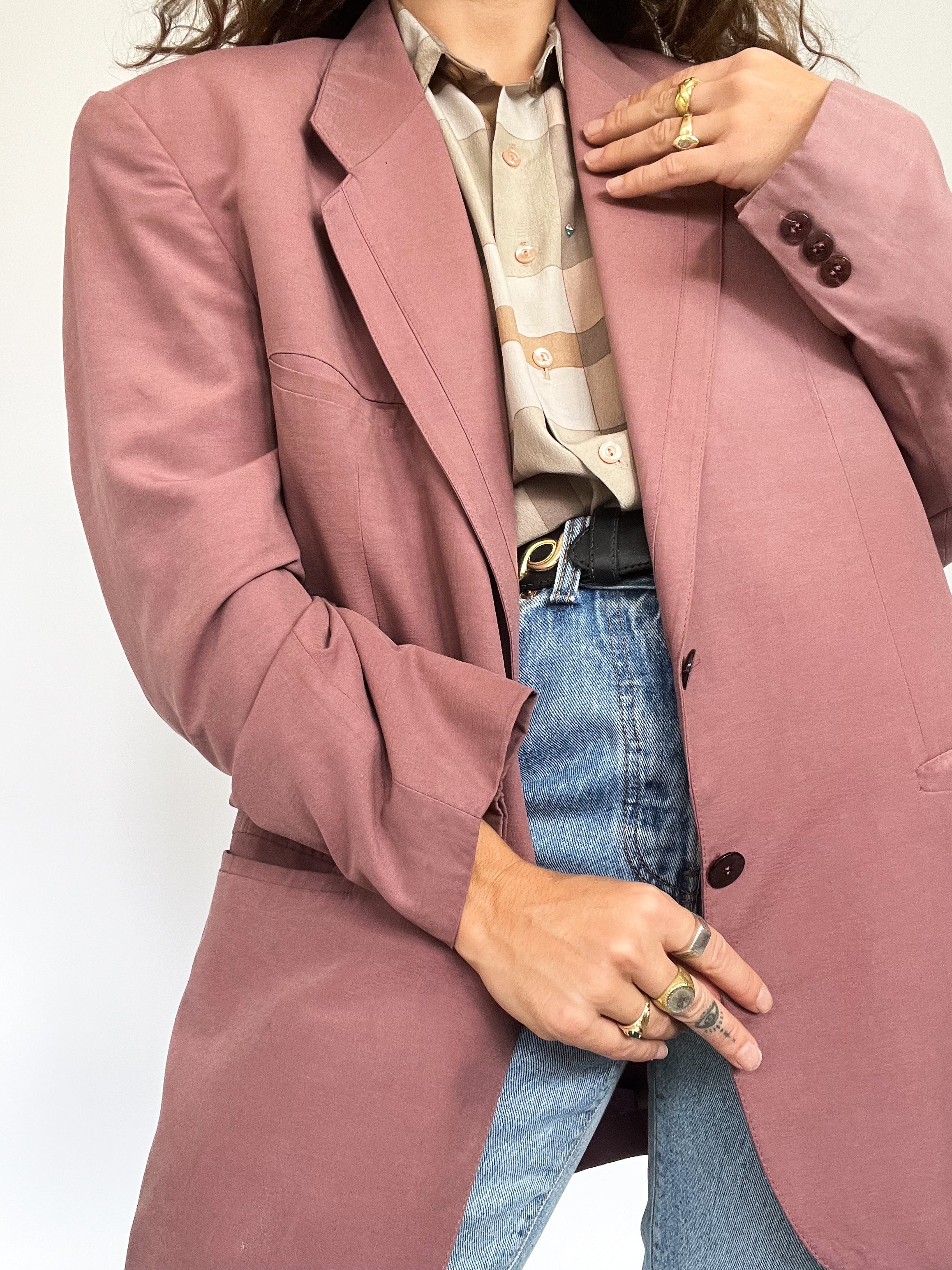 Add a touch of sophistication to your wardrobe with this chic dusty pink vintage blazer. Its oversized silhouette brings a relaxed yet structured fit, perfect for layering over any outfit. The blazer features a classic notched collar and two-button closure, along with spacious front pockets for added practicality. With a subtle yet eye-catching hue, this piece elevates both casual and formal looks, making it a versatile staple for any collection.