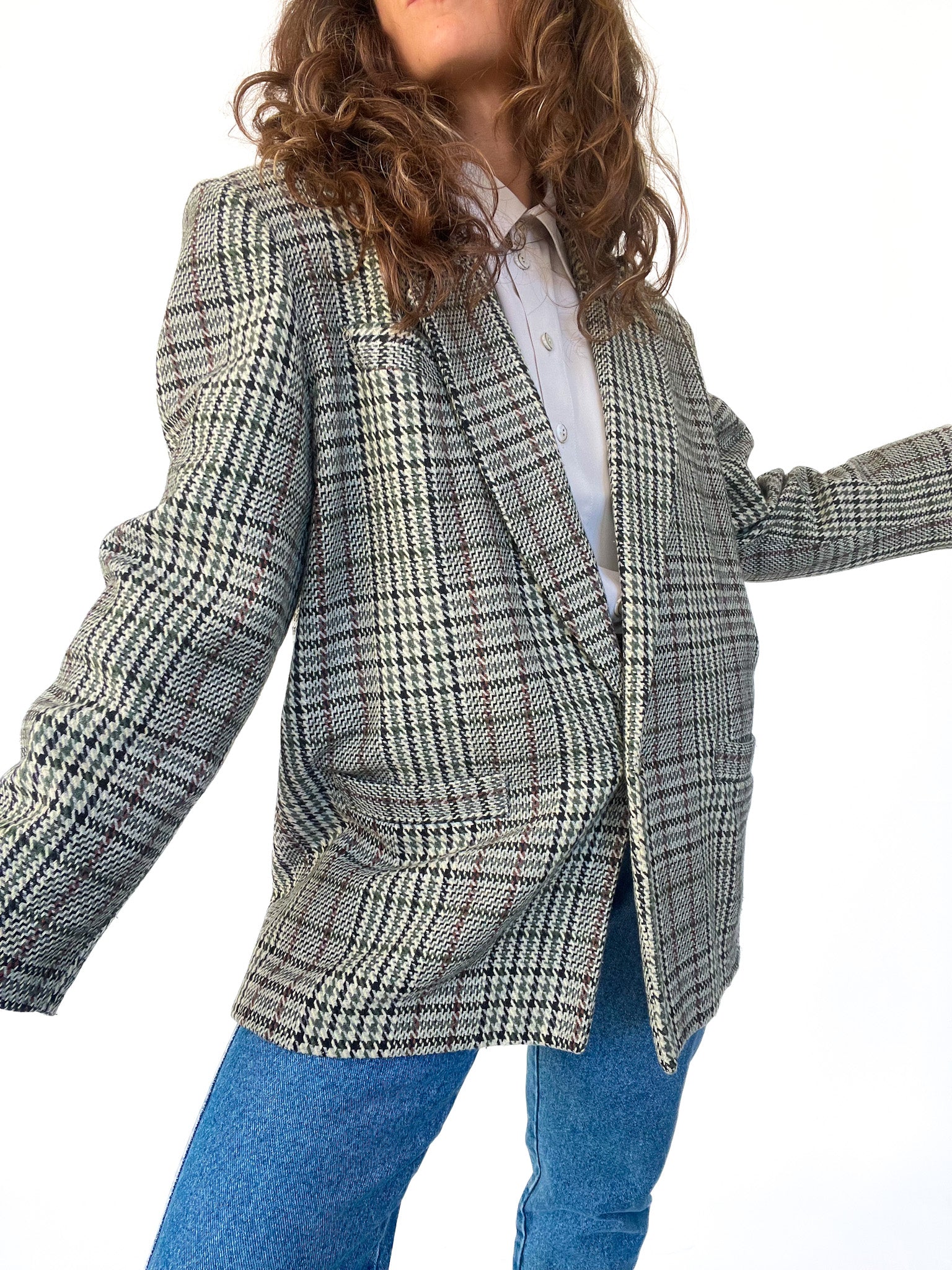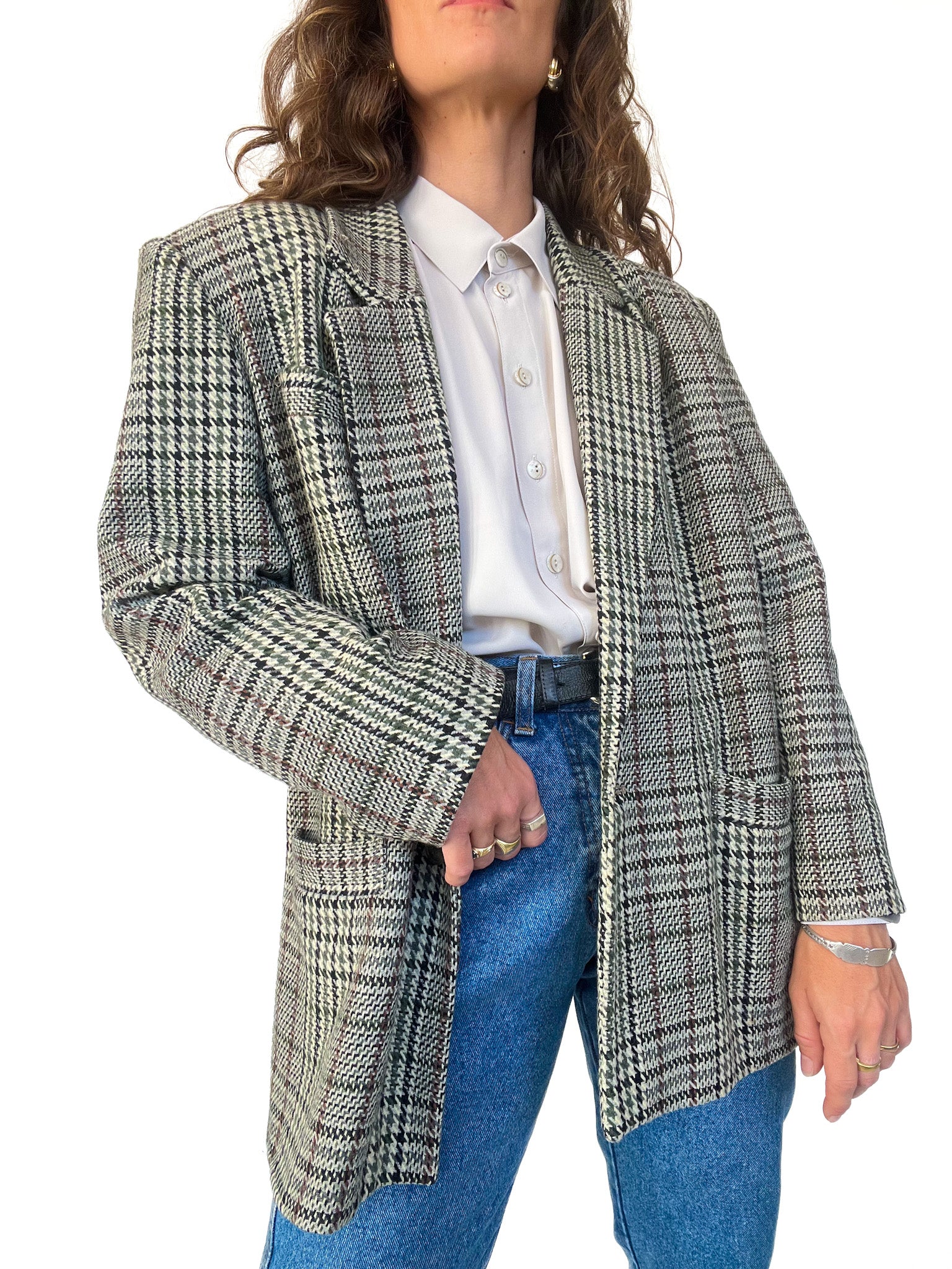 Step into timeless elegance with this vintage houndstooth blazer. The classic black-and-white pattern exudes sophistication, while the slightly oversized silhouette gives it a modern twist. This blazer features sharp lapels, structured shoulders, and a two-button closure, offering a polished look for any occasion. Perfect for layering over casual or formal outfits, it effortlessly blends vintage charm with contemporary style.