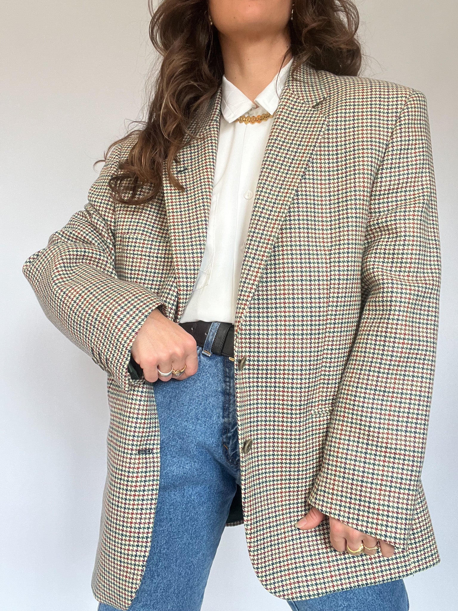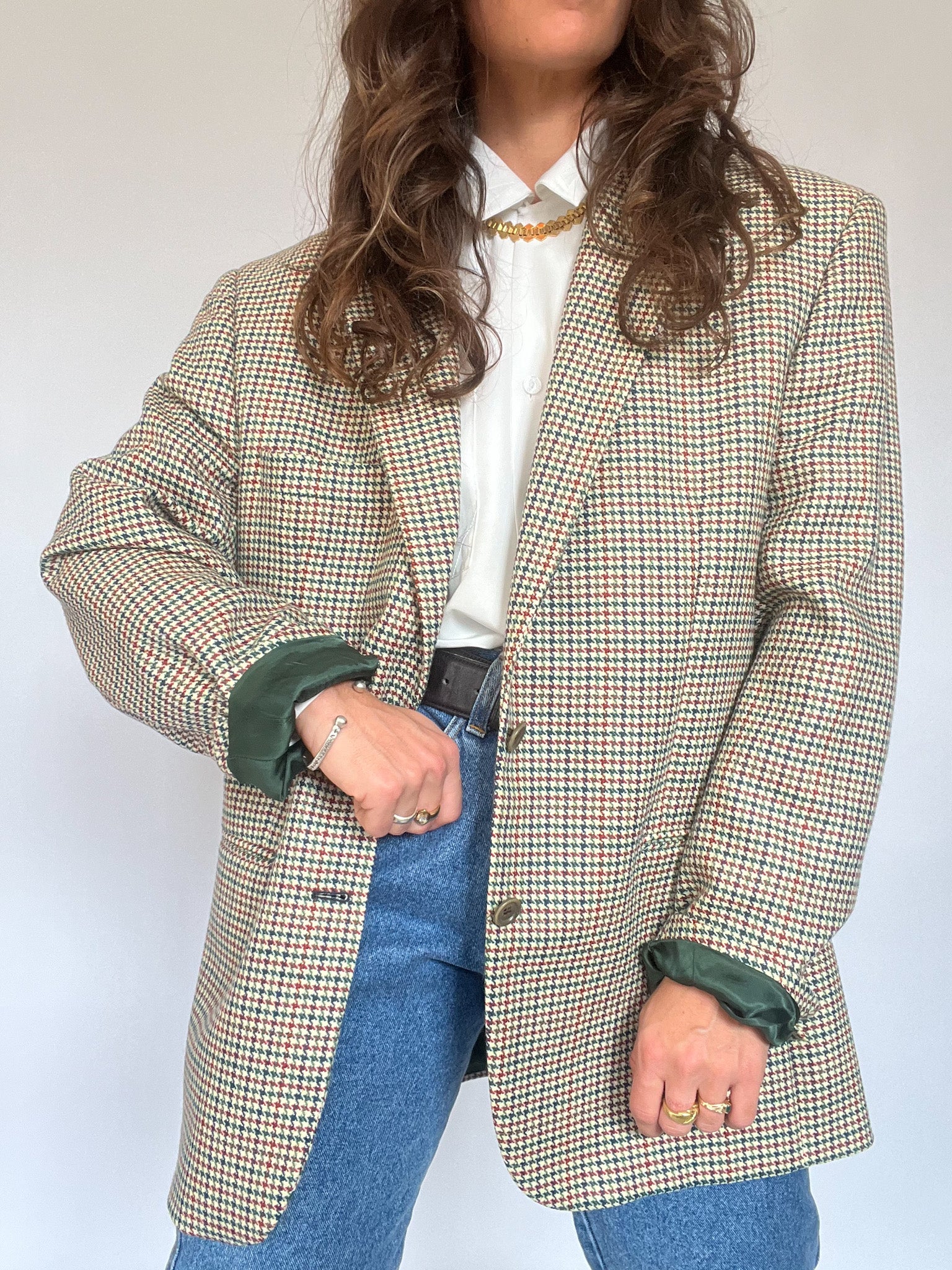 A timeless staple with an edge, this vintage blazer in houndstooth wool plays on masculine codes with effortless elegance. Its structured shoulders and elongated cut bring power and poise to any look, while the earthy tones of brown, green and red make it a perfect match for denim or tailored trousers. A piece that transcends trends and enhances your silhouette with confidence.