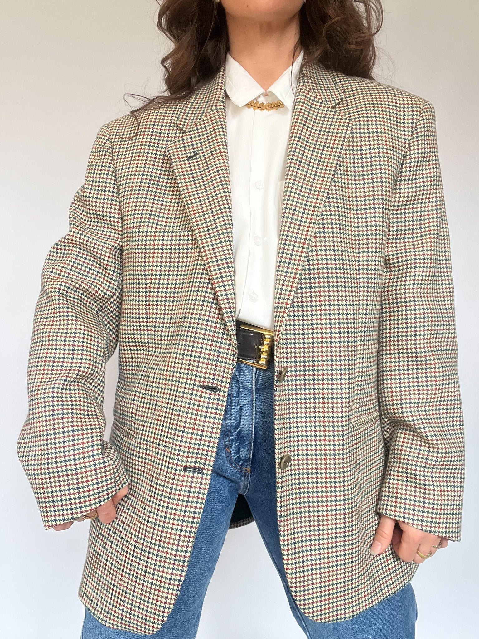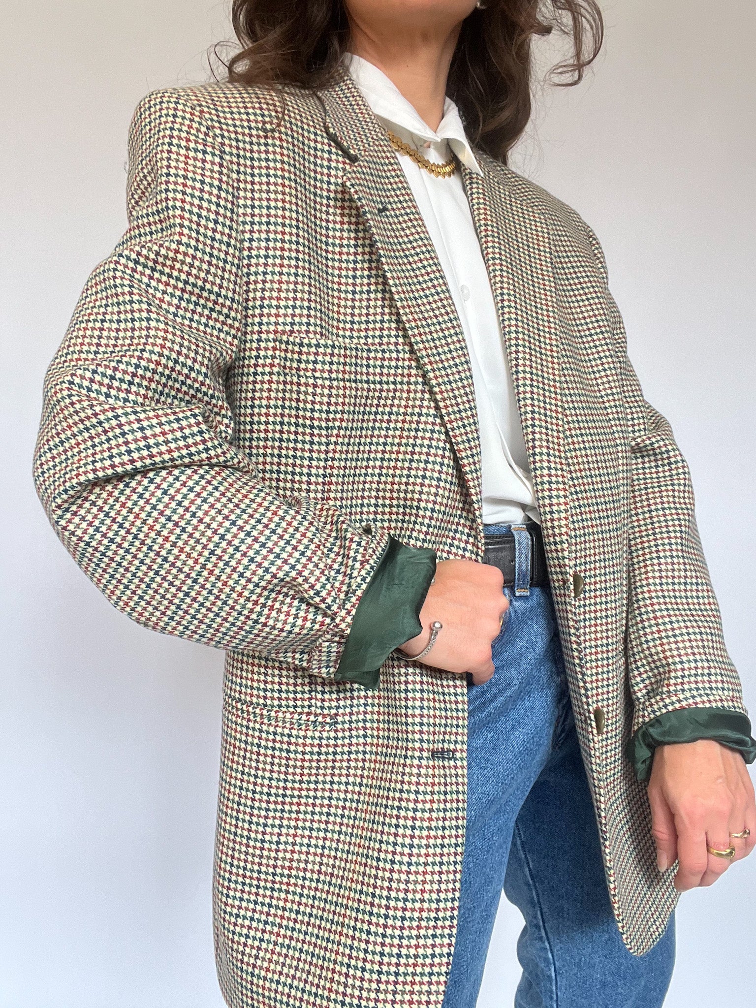 - Special features: Classic houndstooth pattern in warm tones, two front pockets, shoulder pads, single-breasted