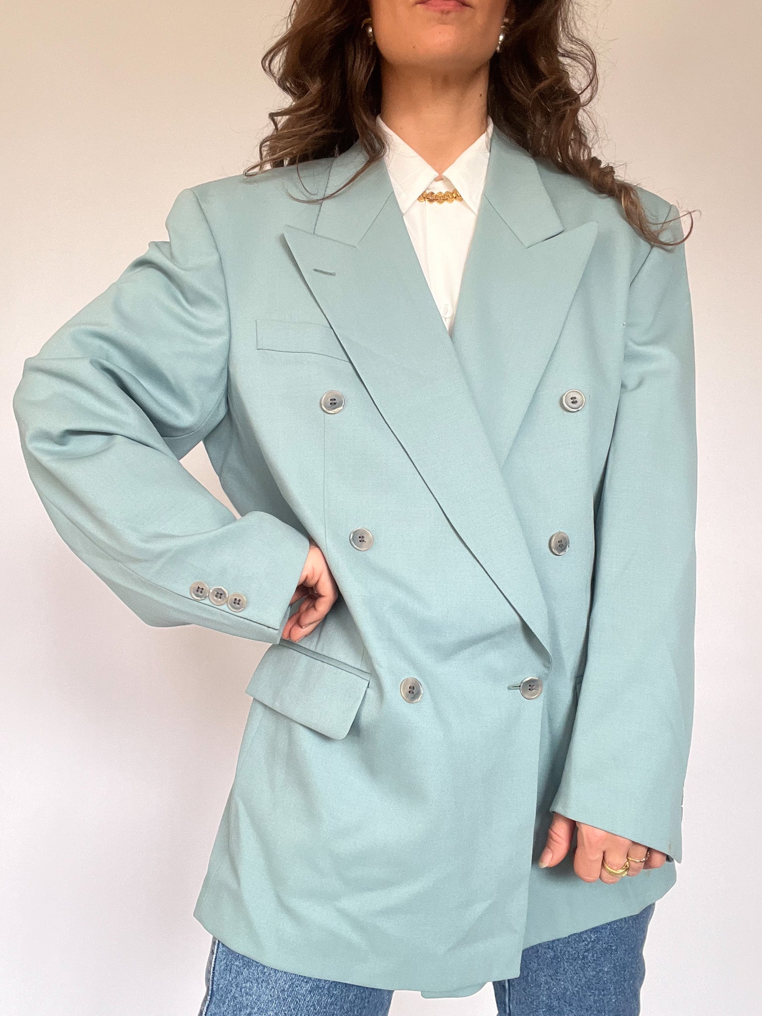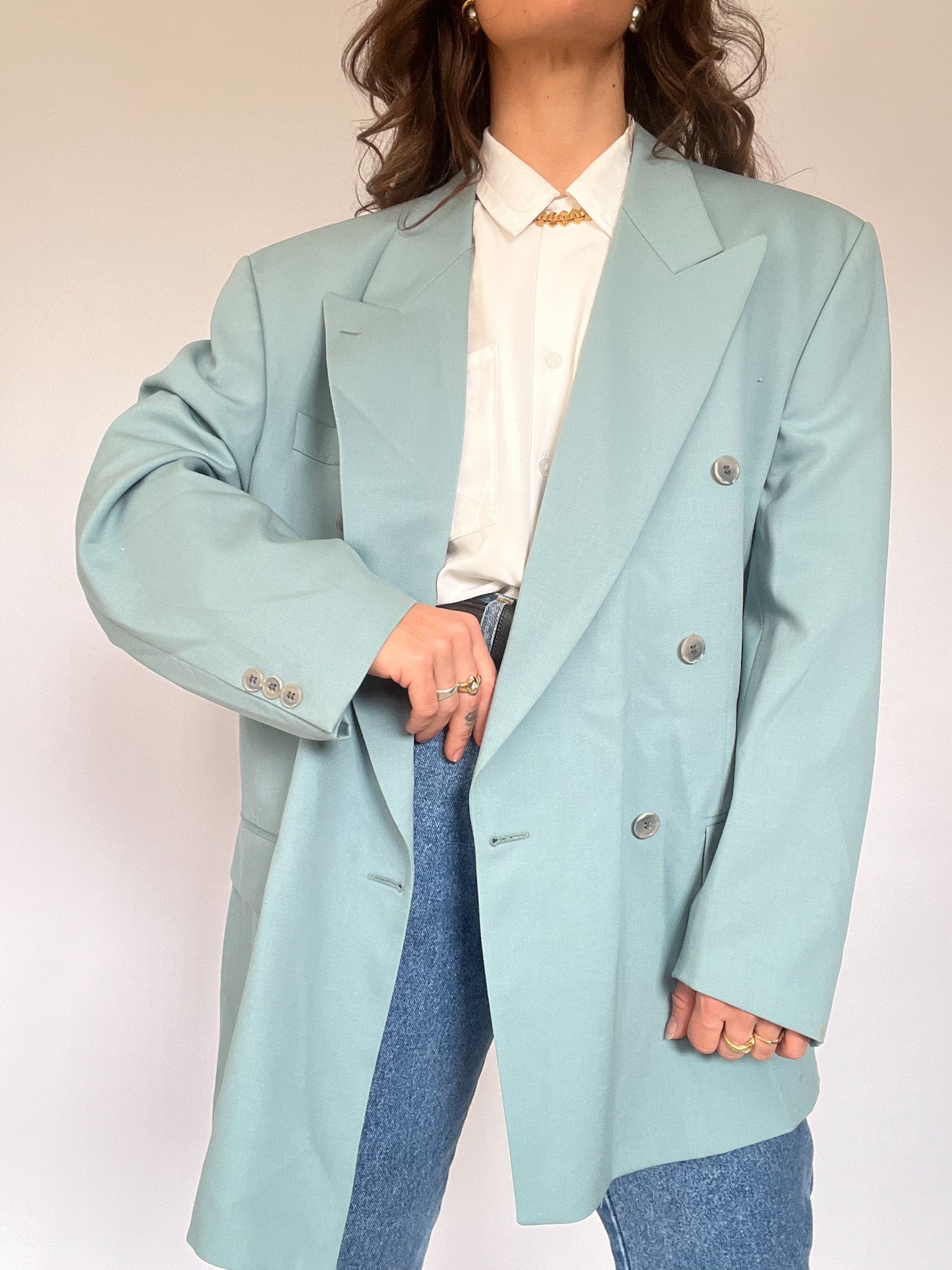 A refreshing take on classic tailoring. This vintage double-breasted blazer comes in a rare ice blue hue that elevates the silhouette with quiet confidence. Its strong shoulders, wide lapels and structured cut nod to the iconic power dressing of the 80s while keeping the look modern and clean. Wear it open over a crisp shirt or cinch it at the waist with a belt for a more sculpted effect—either way, it’s the kind of piece that instantly sets the tone.