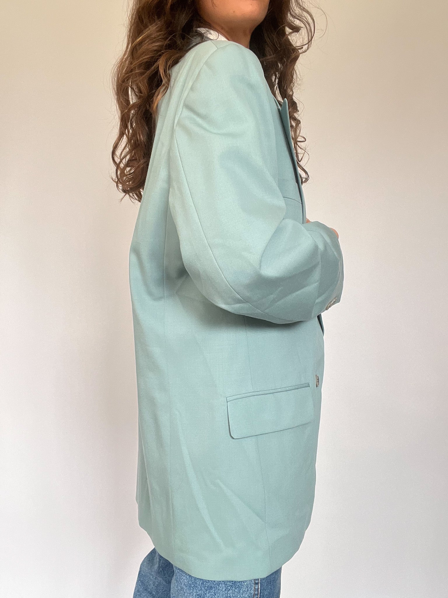 • Special features: Ice blue tone, double-breasted front with six buttons, two flap pockets, buttoned cuffs, shoulder pads