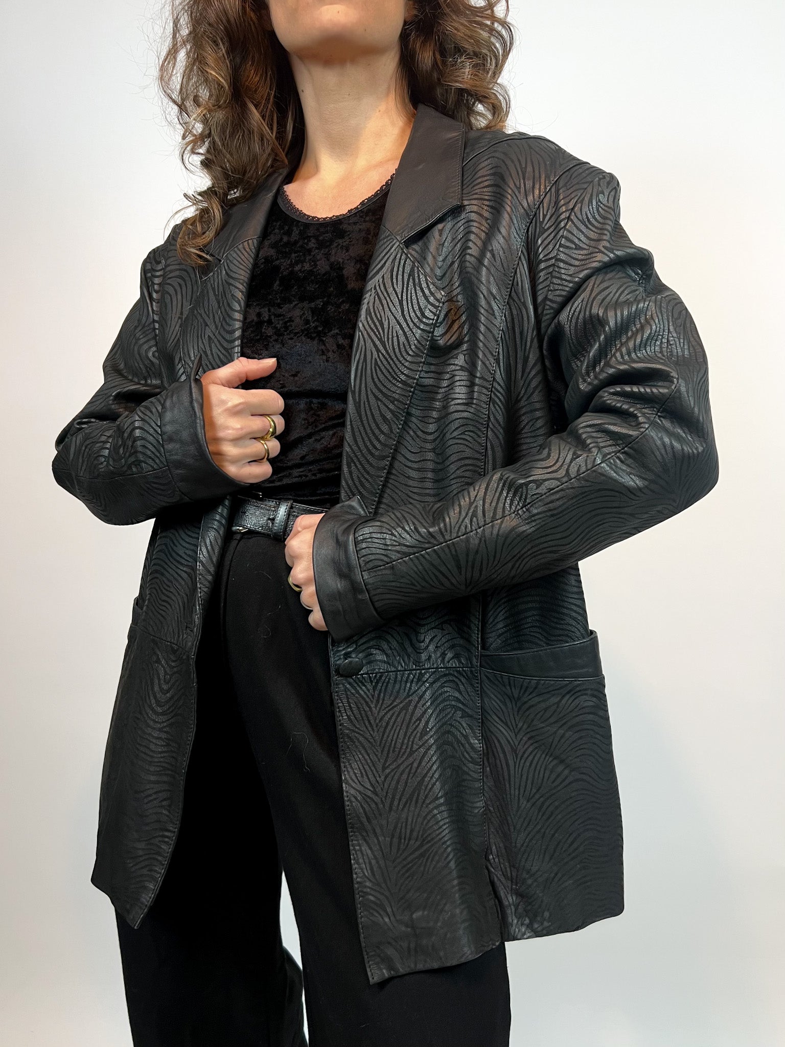 This stunning black leather blazer features an elegant zebra-embossed texture, bringing sophistication and bold character to your wardrobe. With its sharp lapel collar, relaxed fit, and deep front pockets, this blazer blends structure with effortless style.
