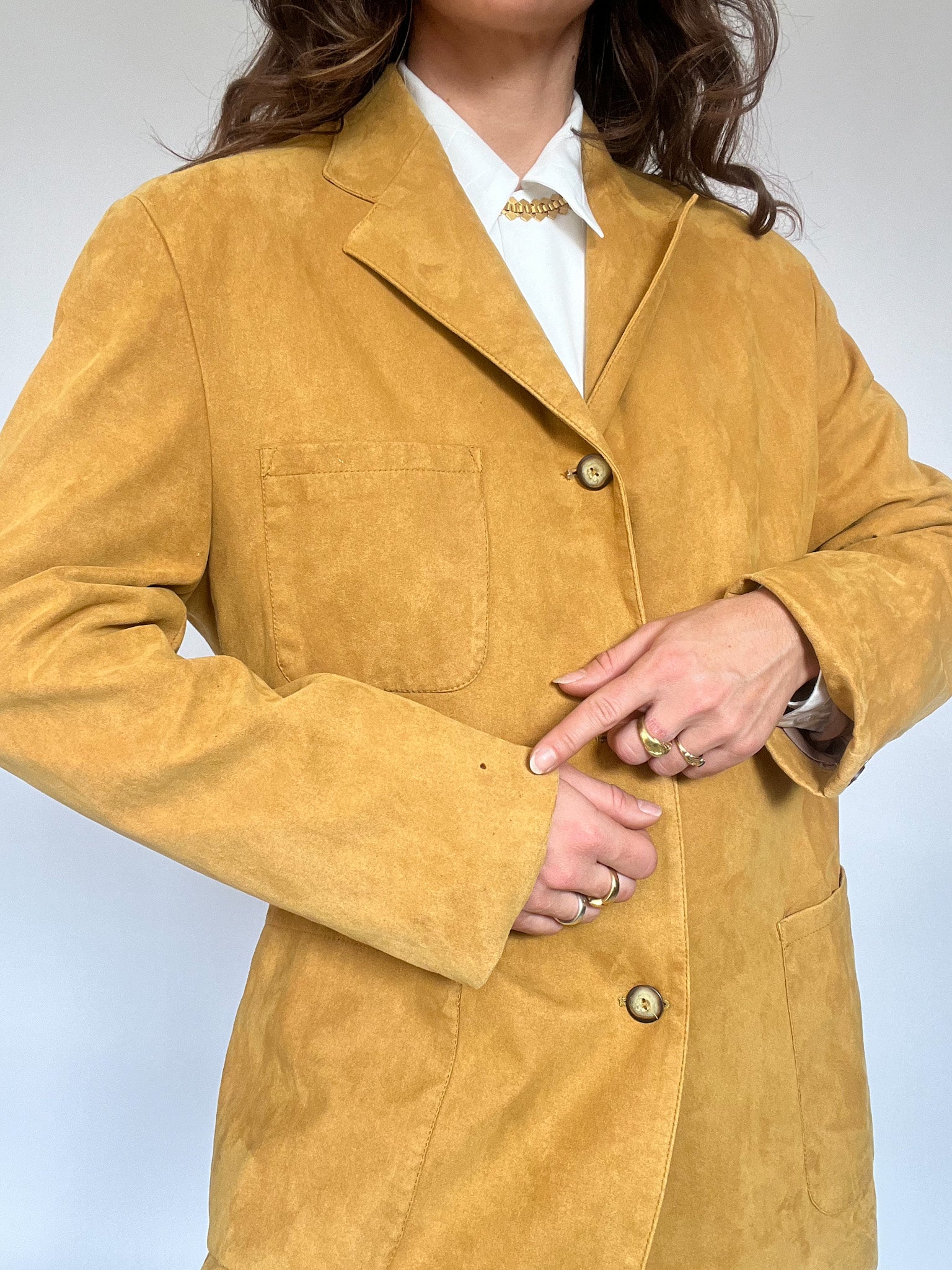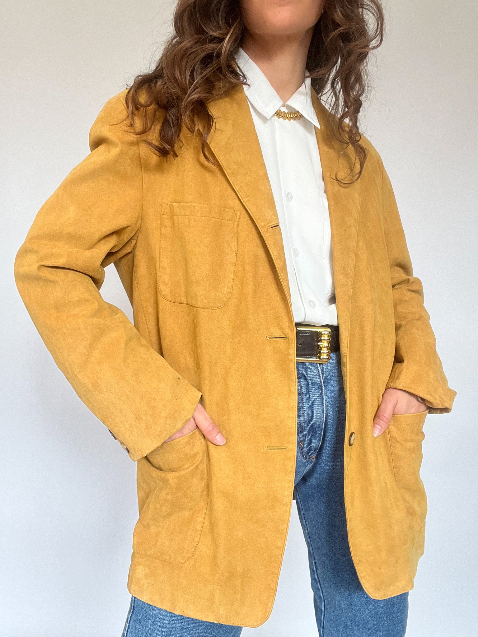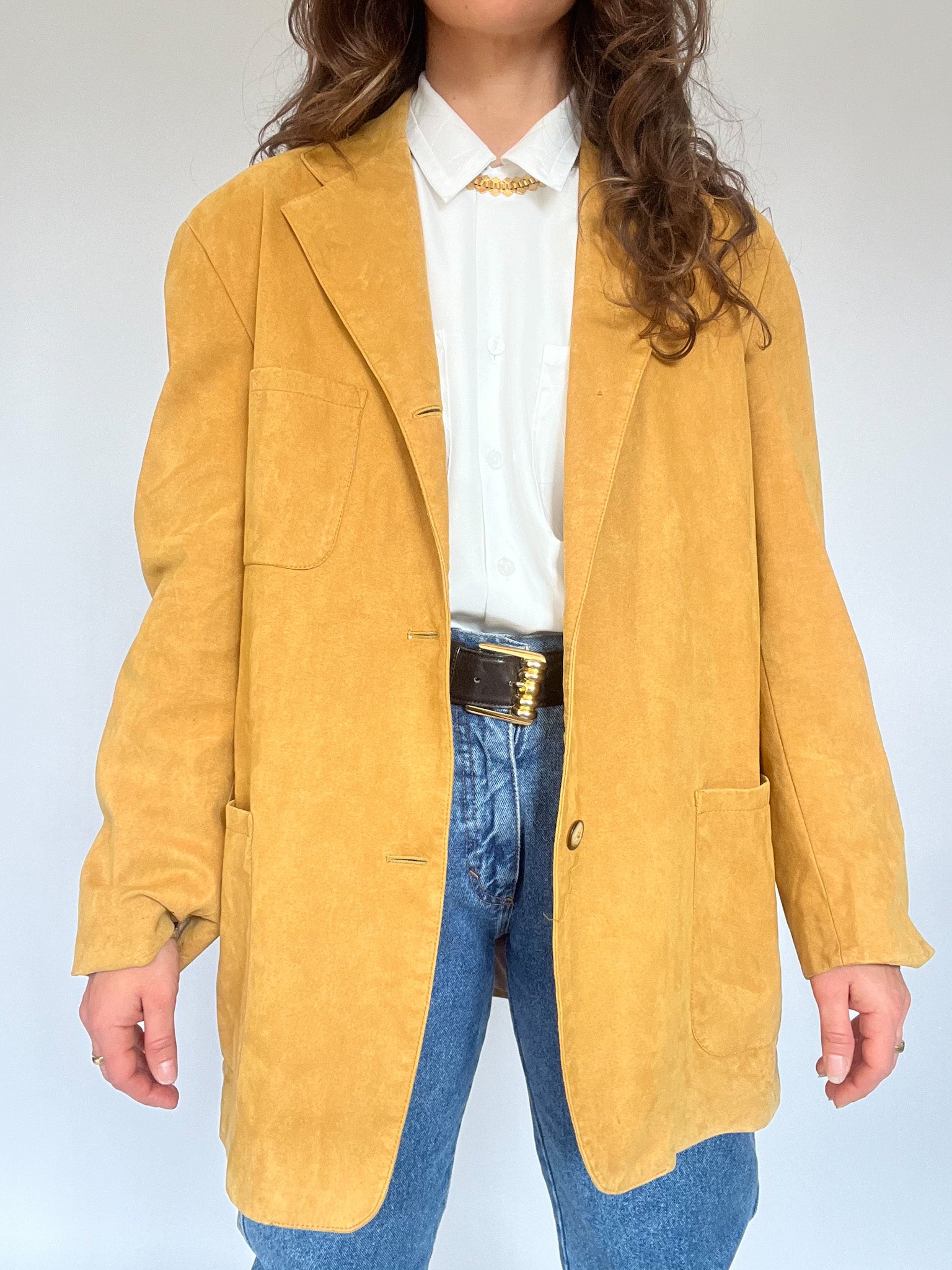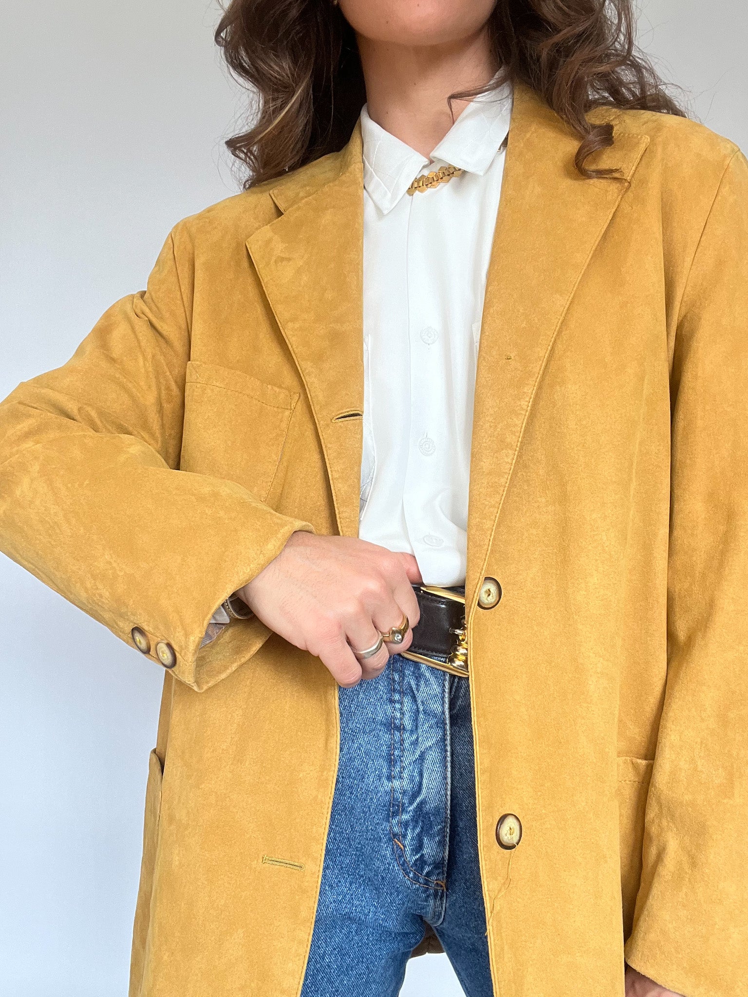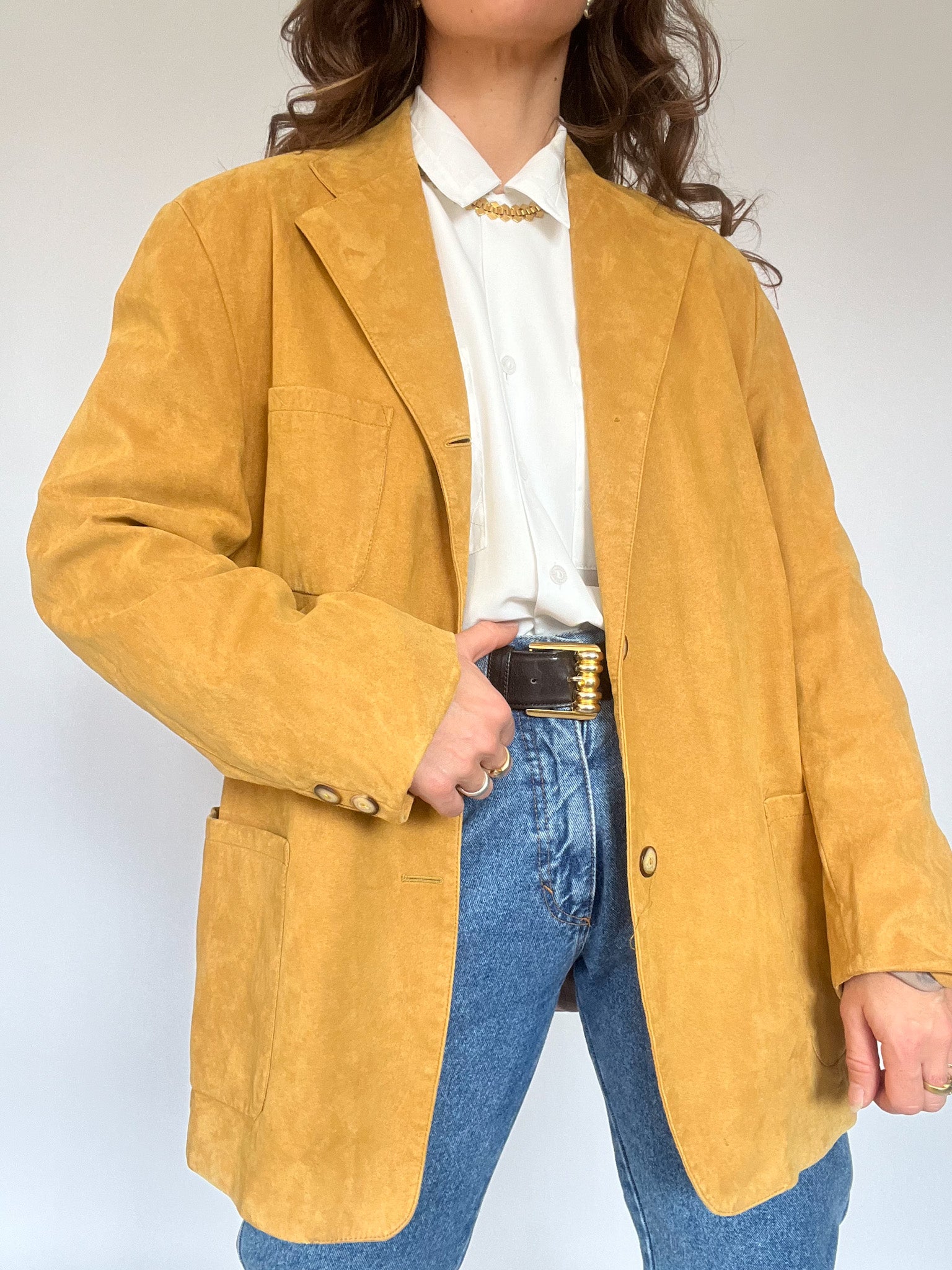 A unique blend of softness and attitude, this vintage suede blazer in a rich mustard hue makes a bold yet timeless statement. With its casual structure and tactile texture, it offers the perfect contrast between relaxed tailoring and refined vintage flair. The kind of piece that catches the light and turns heads without ever trying too hard.