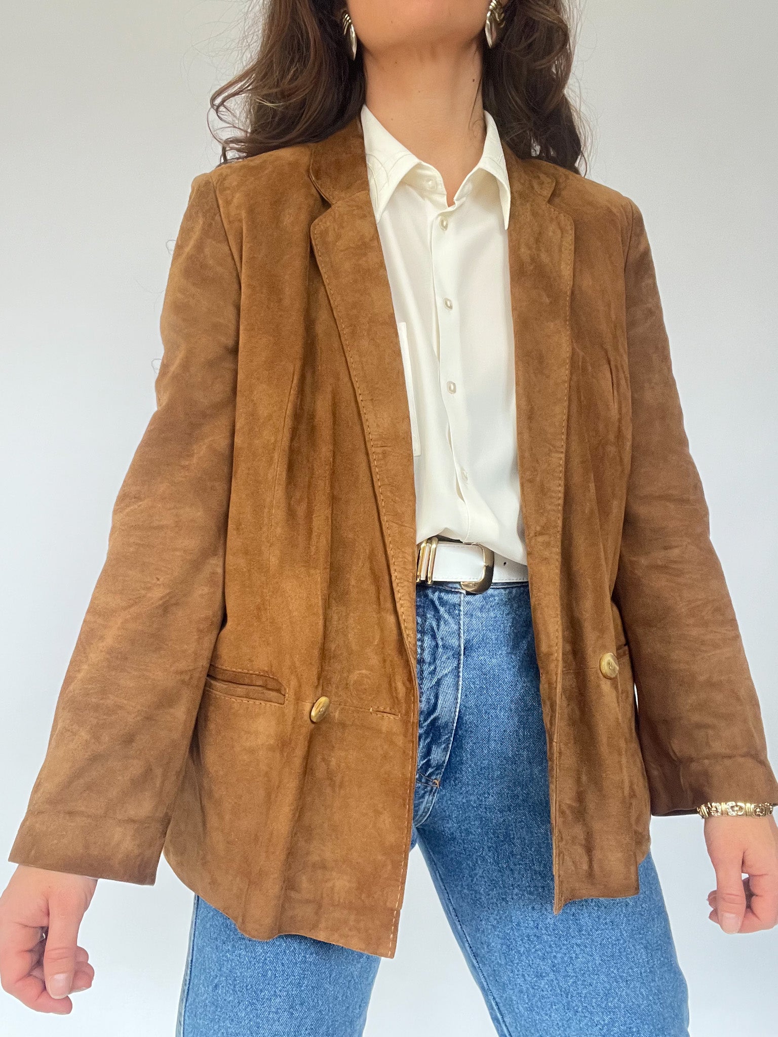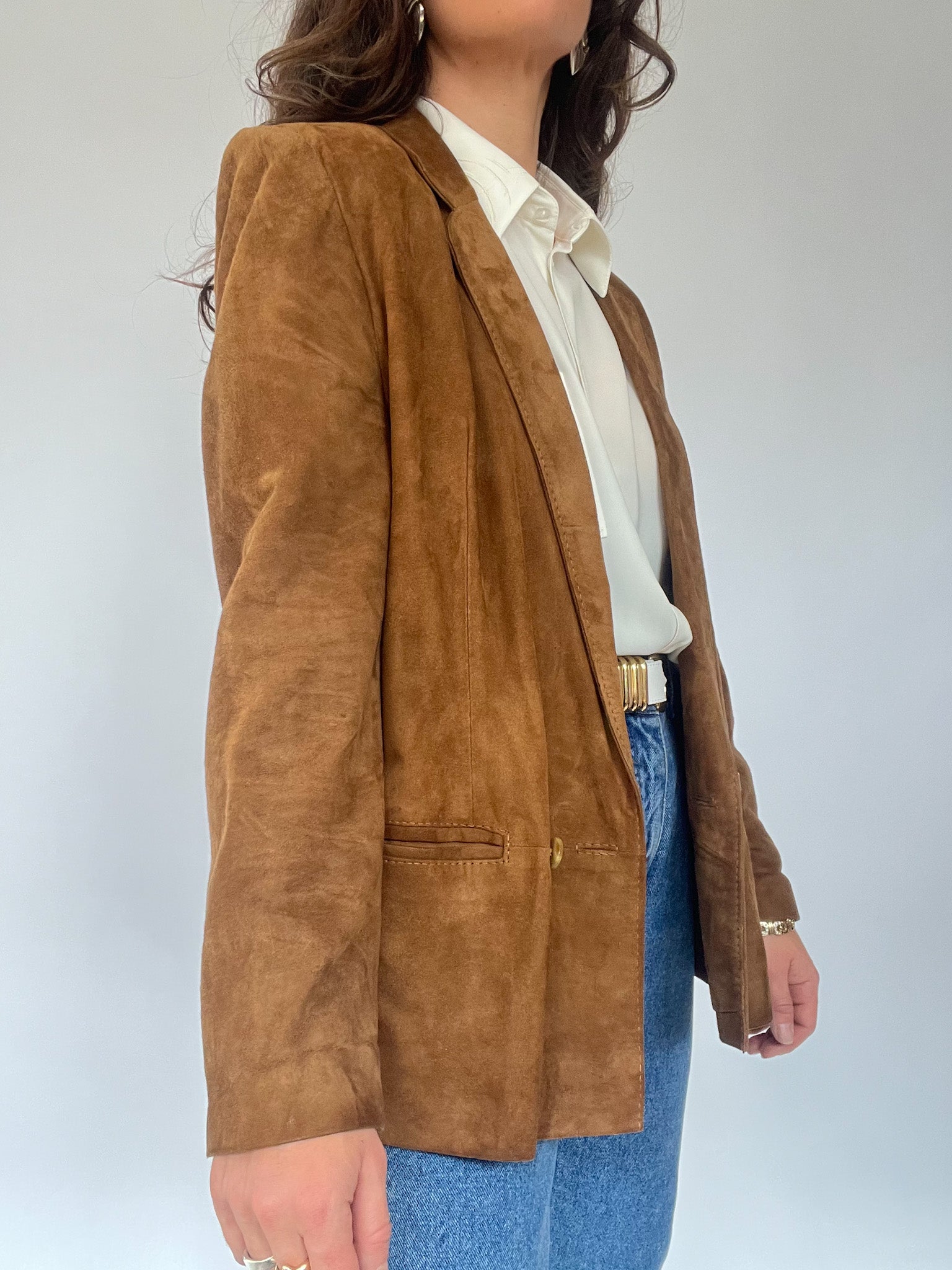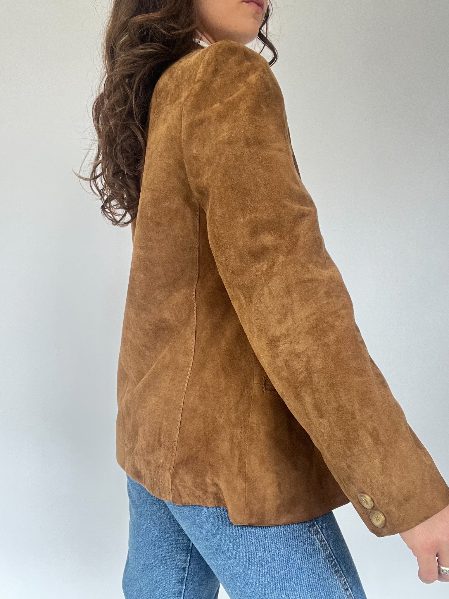An ultra-soft vintage suede blazer in a warm camel shade, embodying effortless cool with a touch of rugged charm. The perfect layering piece to transition through the seasons with style.