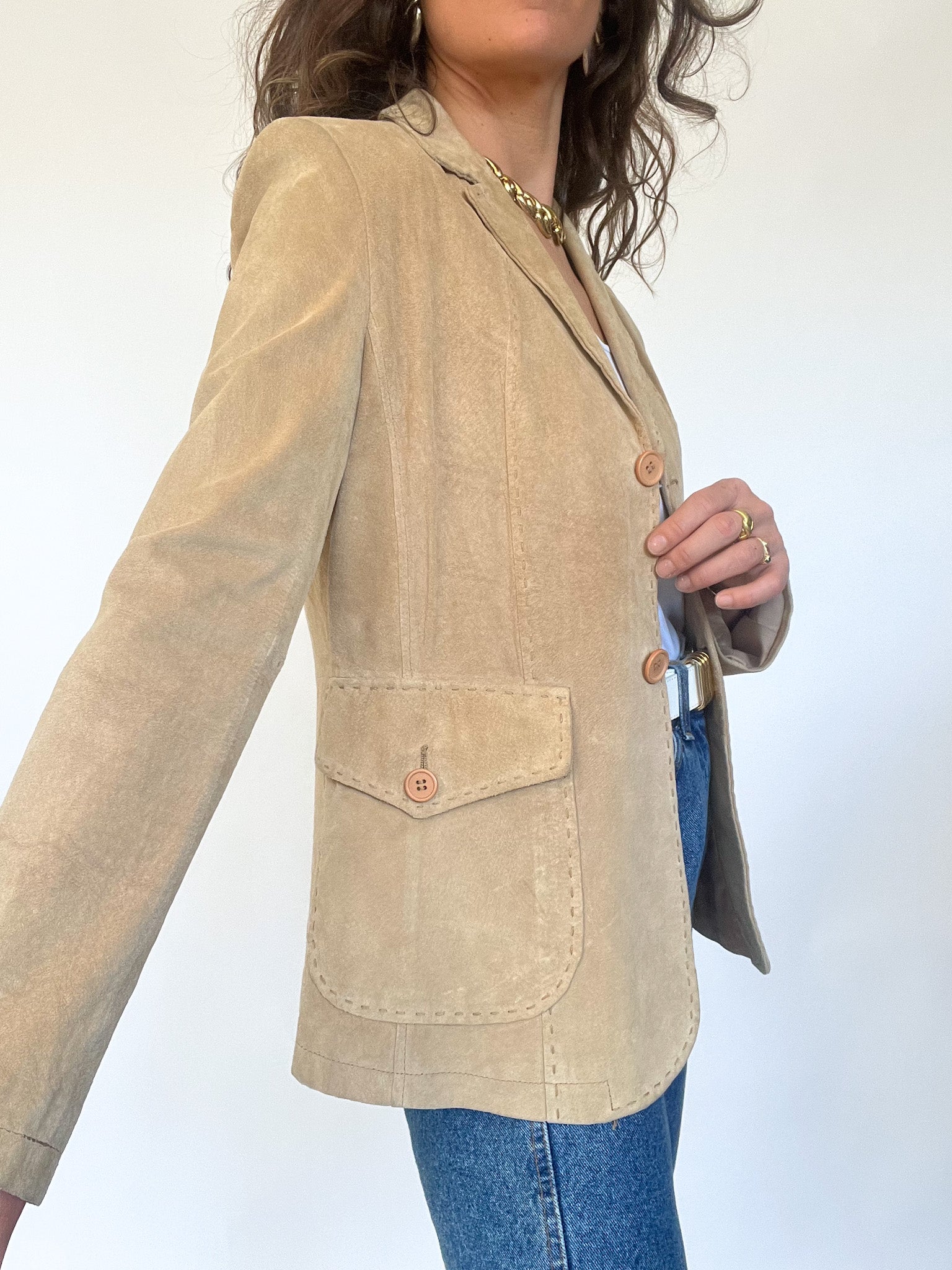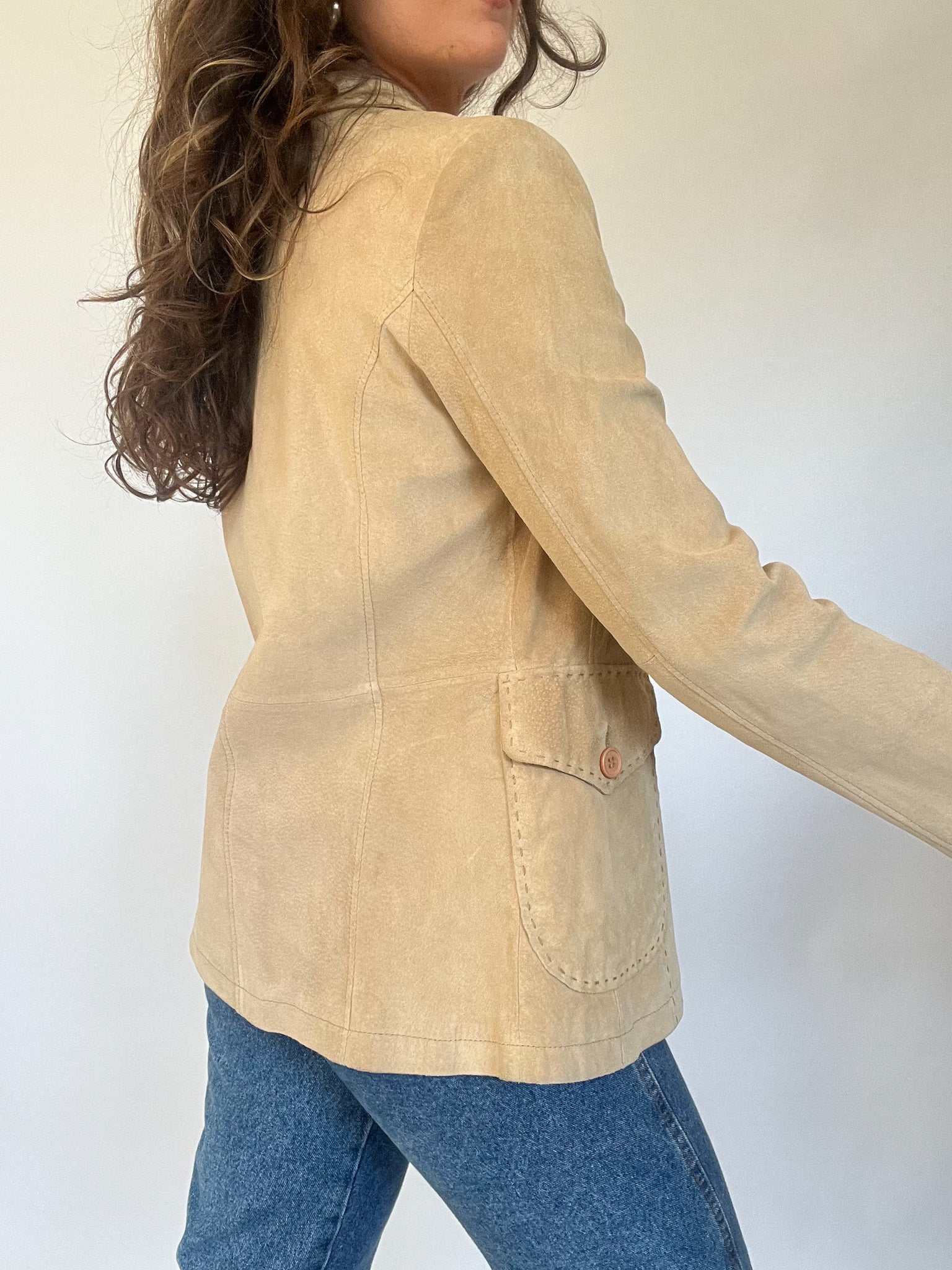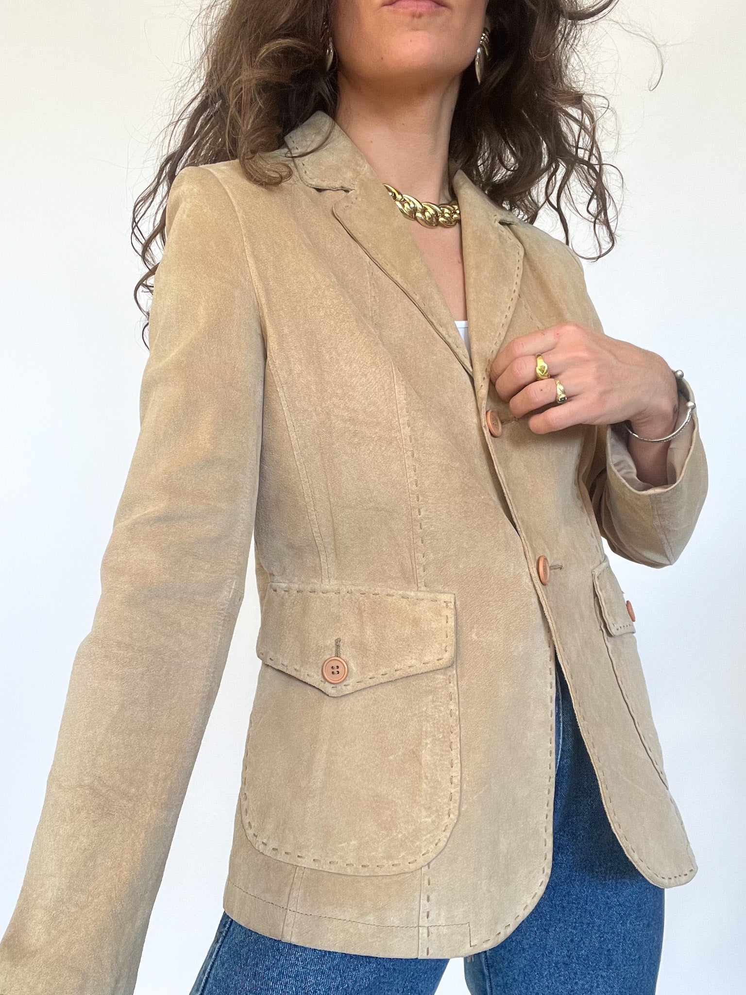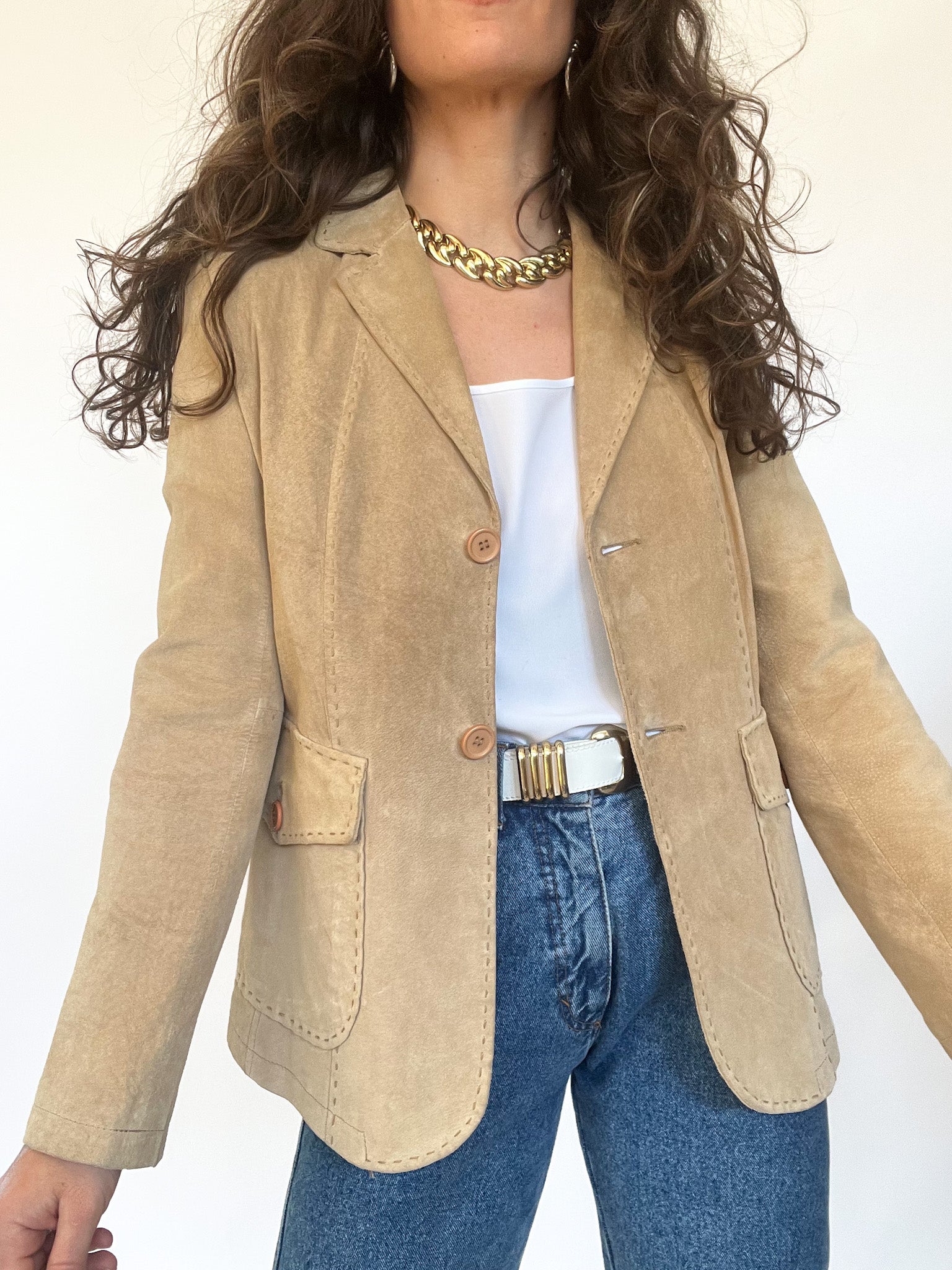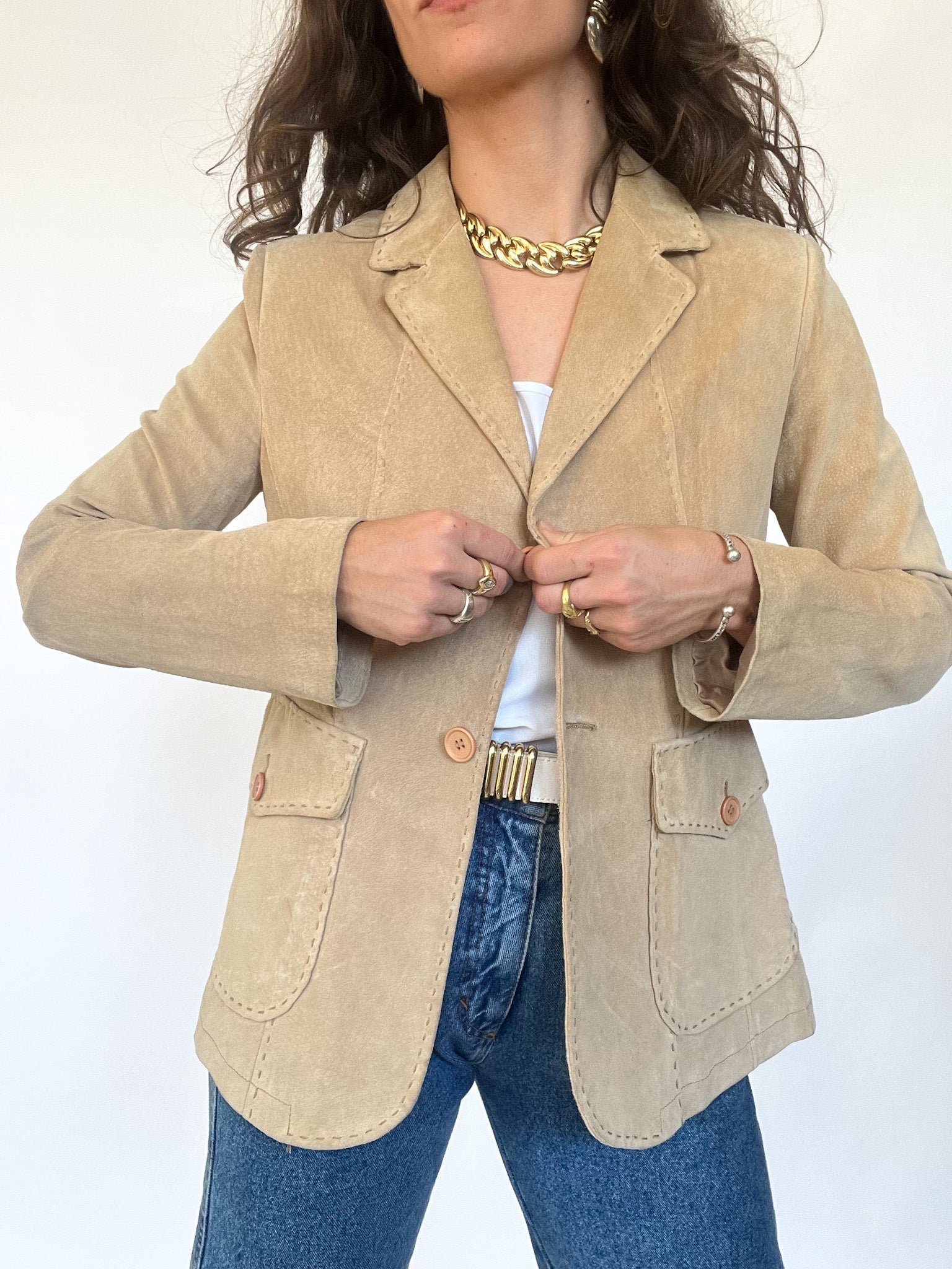 Soft suede and elevated tailoring come together in this unique camel blazer. With contrast stitching and a relaxed fit, this jacket walks the line between effortless and iconic. Skorpiones Vintage selects pieces like this for their quiet strength — it’s a classic that holds its own.