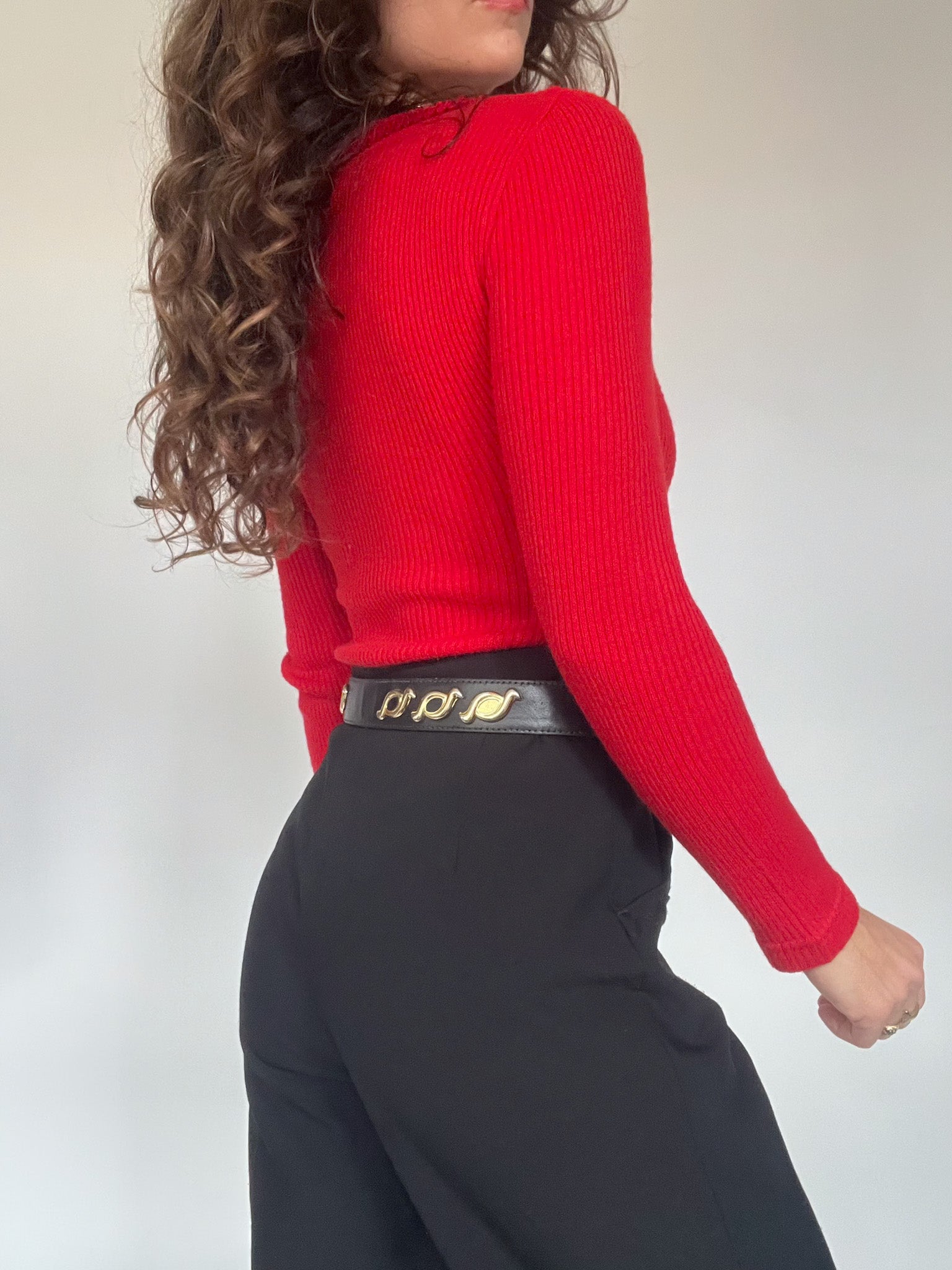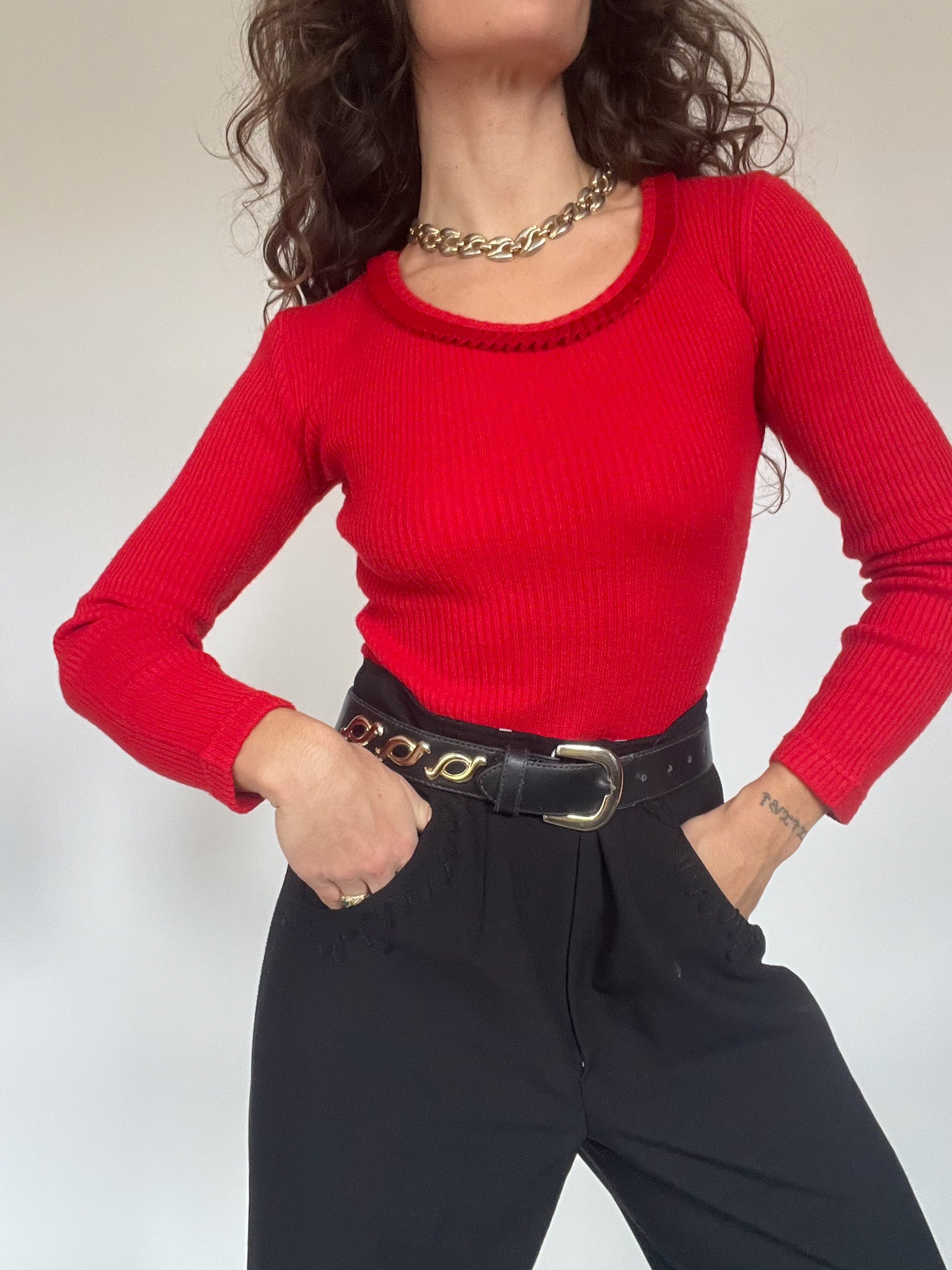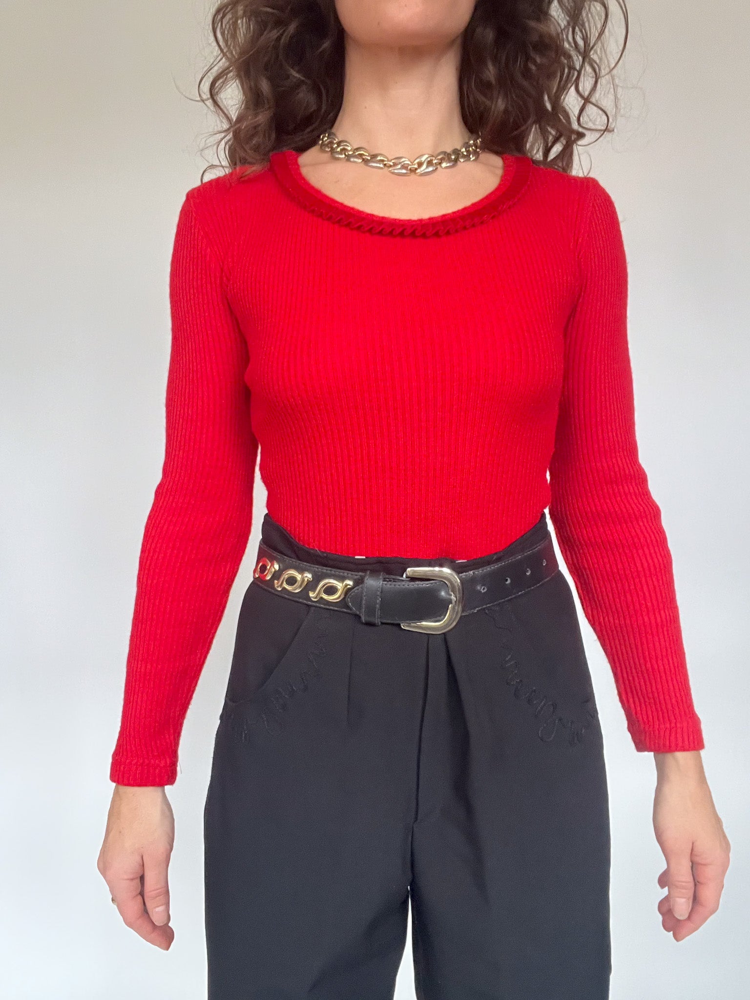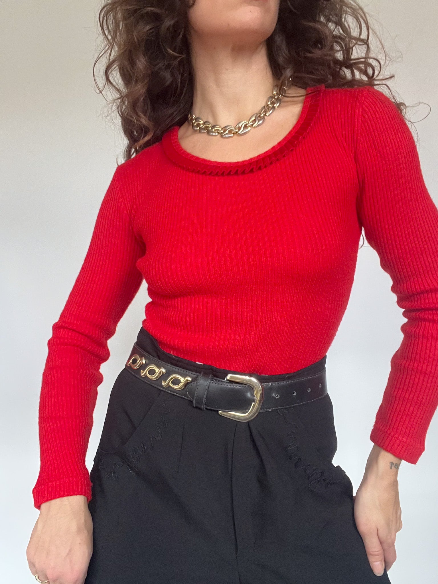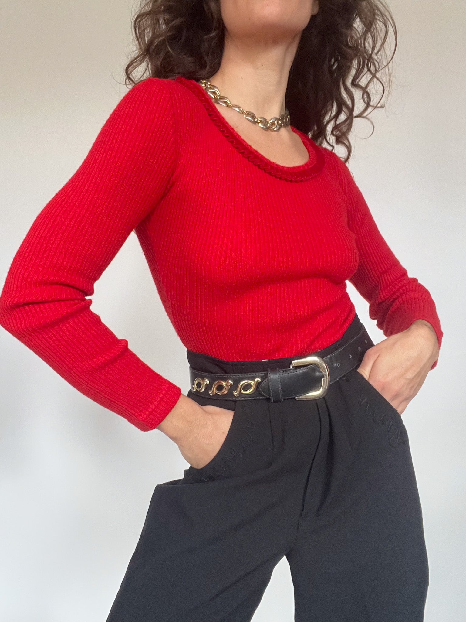 This 90’s bodysuit was chosen for its vibrant red shade, a colour that naturally brings energy and confidence to any silhouette. The ribbed knit creates a sculpting, comfortable fit that follows the body without feeling restrictive. Around the neckline, a delicate braided trim adds a subtle decorative touch that softens the boldness of the colour and gives the piece that effortless charm so characteristic of vintage Italian knitwear.