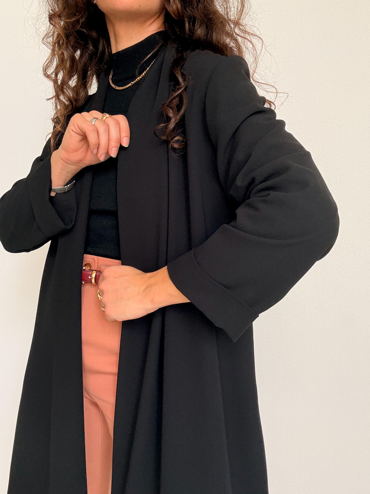 Chosen for its timeless, body-skimming silhouette that effortlessly adapts to different styles. This long open cardigan can be worn close to the body for a sleek, elegant look or styled loose for a more relaxed, effortless vibe. A classic black piece that instantly elevates any outfit, whether layered over a knit or worn as a statement on its own.
