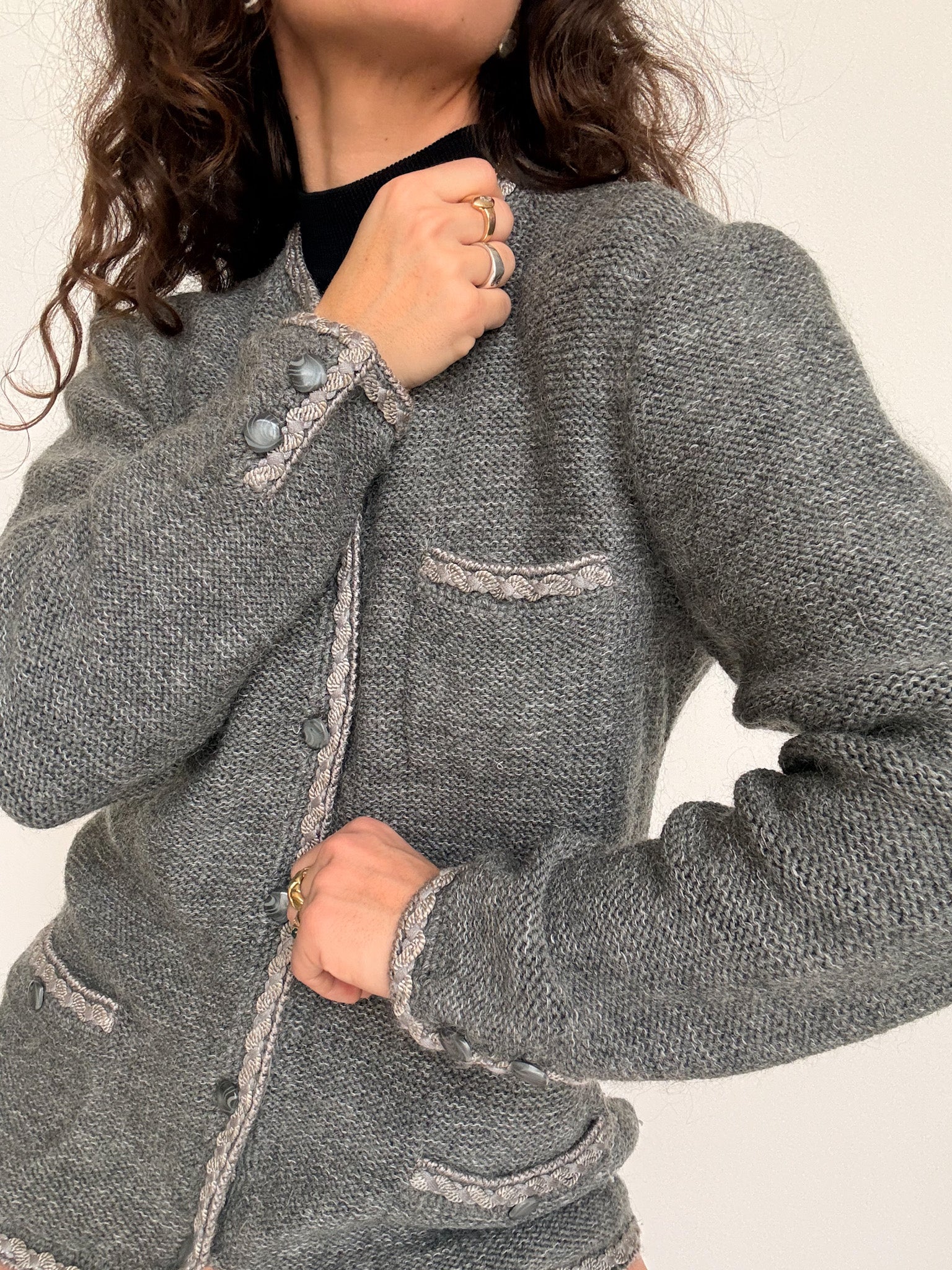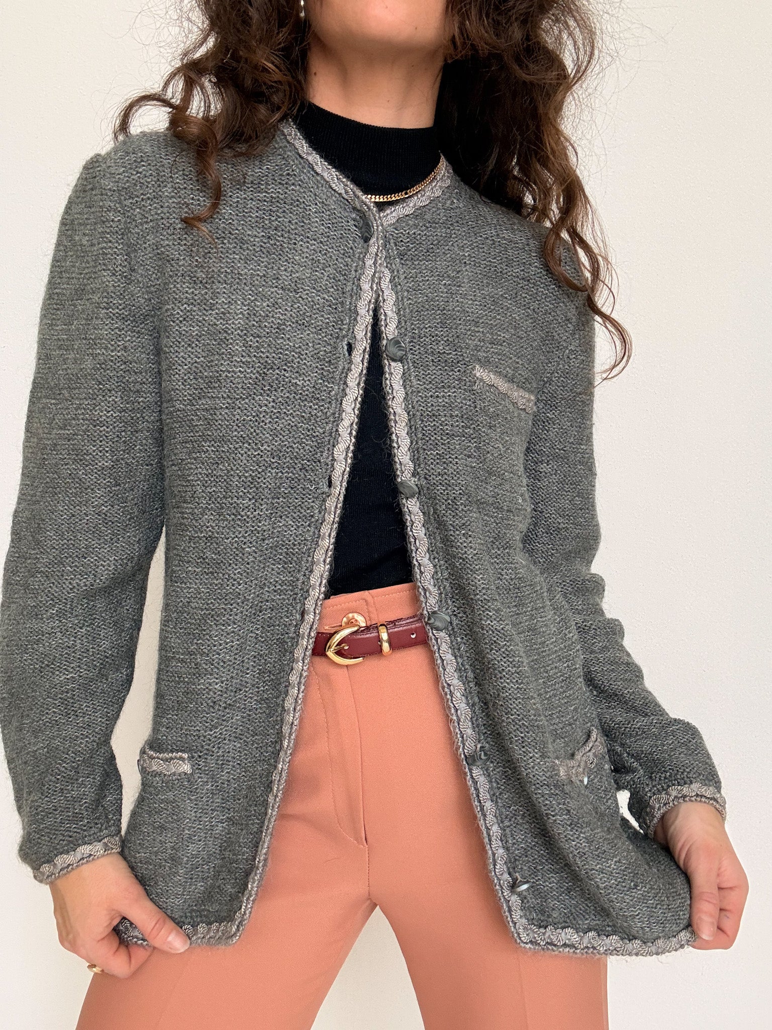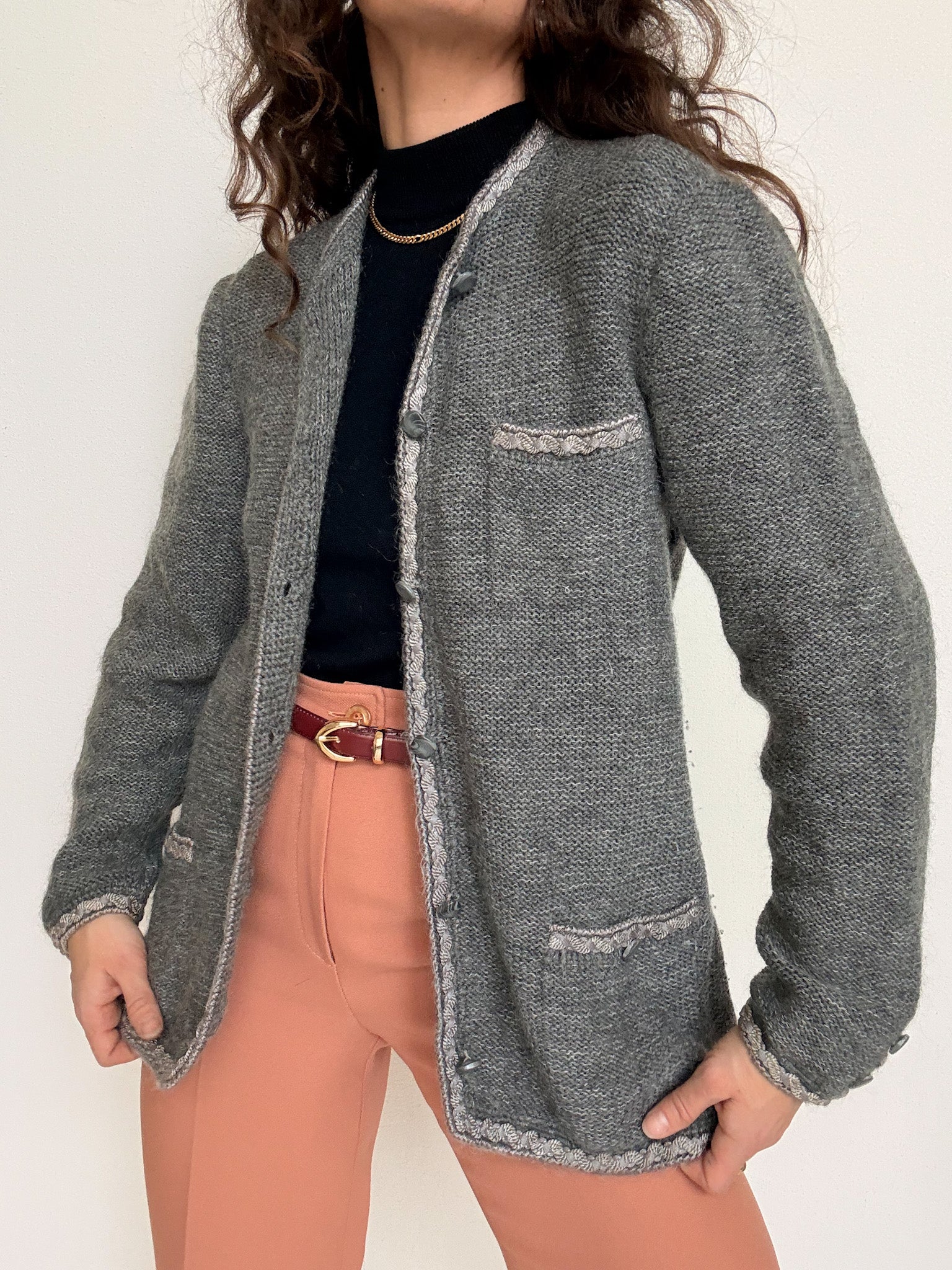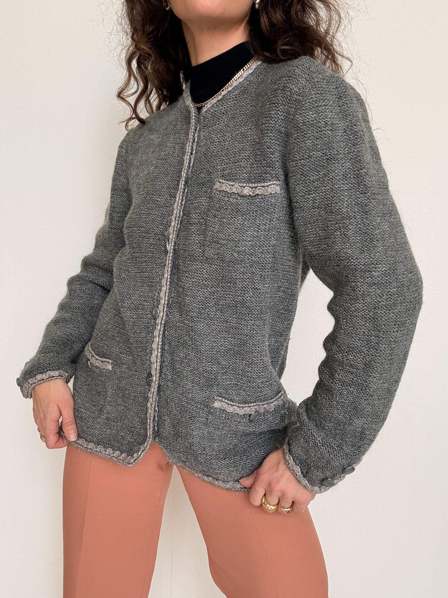 Chosen for its stunning grey tone and the remarkable attention to detail that elevates the entire piece. The textured trims along the collar and pockets, combined with the carefully selected buttons, give this knit a refined, almost tailored feel. Worn as a light jacket or layered like a cardigan, it brings structure, warmth and a strong sense of craftsmanship to any vintage wardrobe.