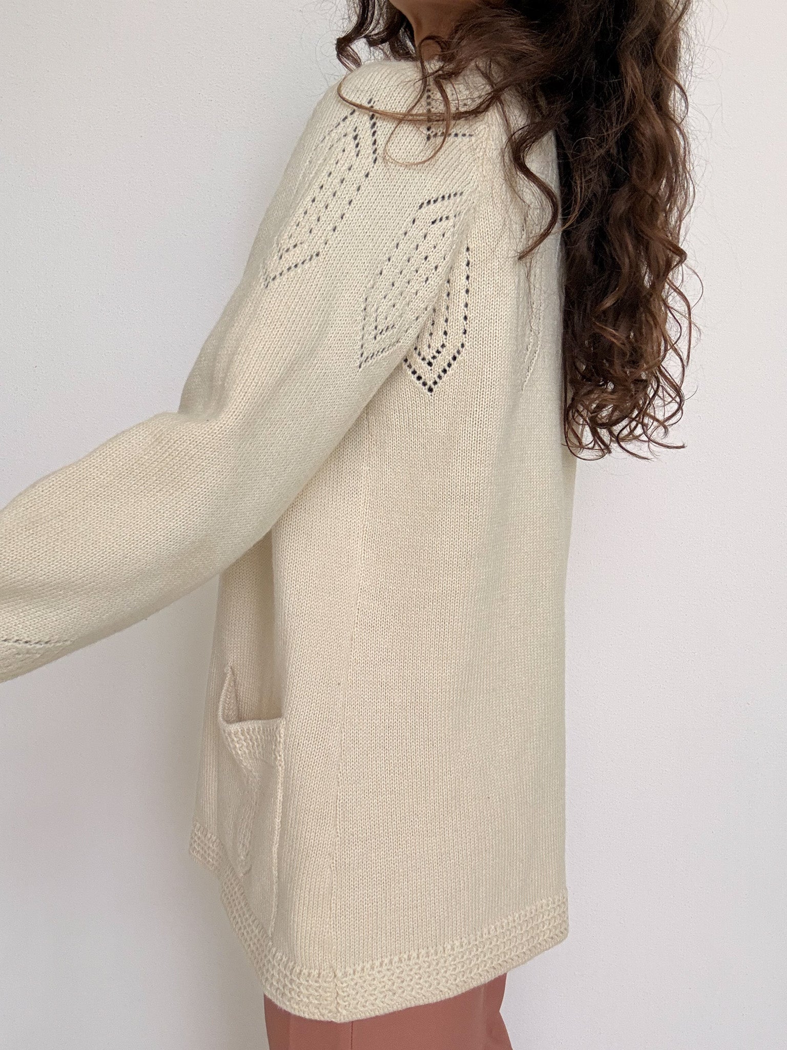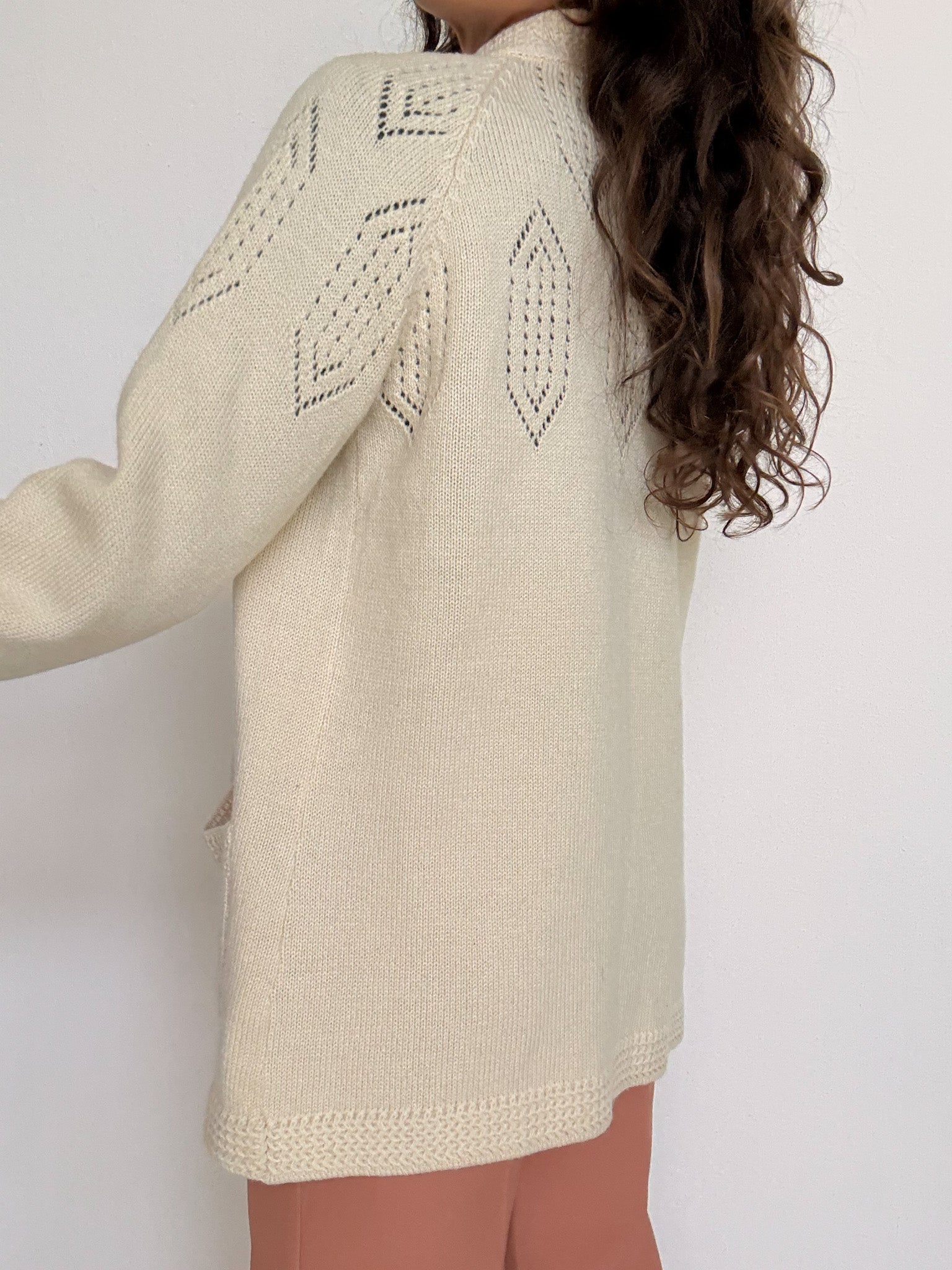Chosen for its beautifully balanced design and that refined straight cut that makes it incredibly easy to wear. This cardigan stands out through its soft cream tone, subtle openwork details and the delicate tie at the neckline, allowing it to be worn knotted or left open depending on the mood. A truly elegant piece that feels both feminine and timeless, with a quality you immediately notice.