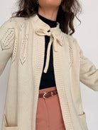 - Special features: Straight cut silhouette, delicate openwork knit details, front tie fastening that can be worn knotted or open, soft cream tone, refined Italian craftsmanship
