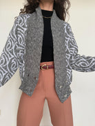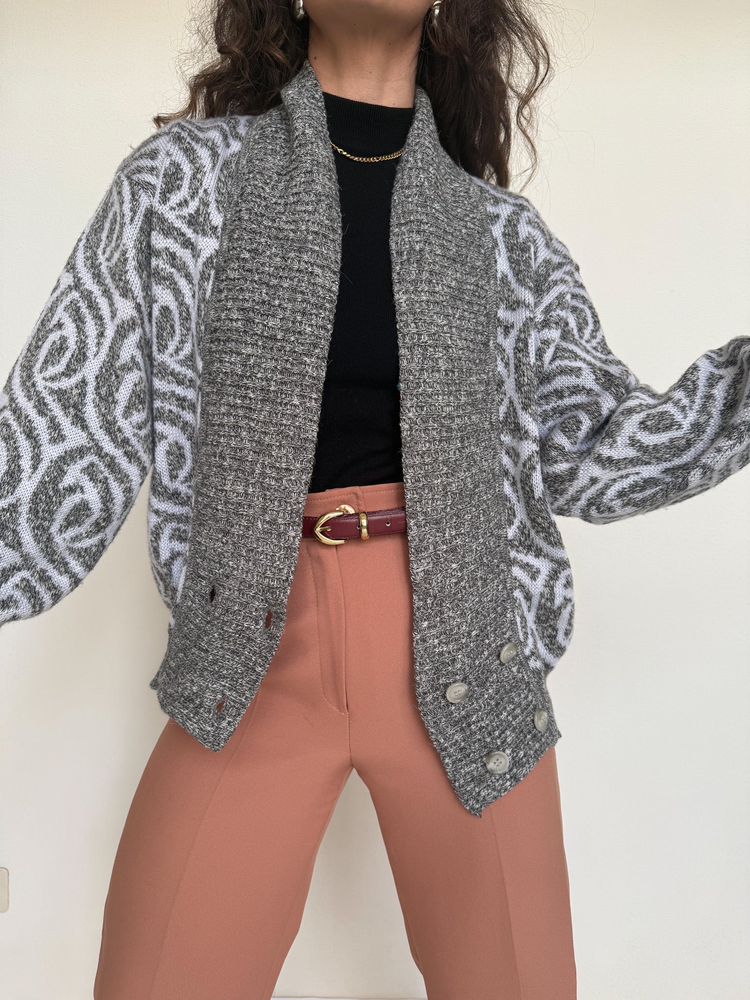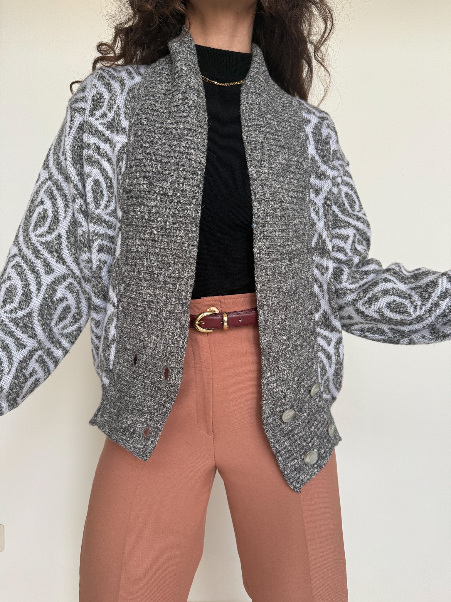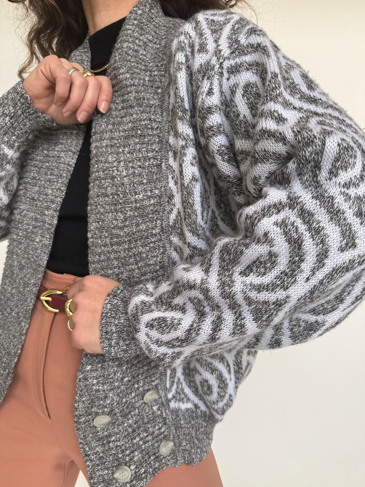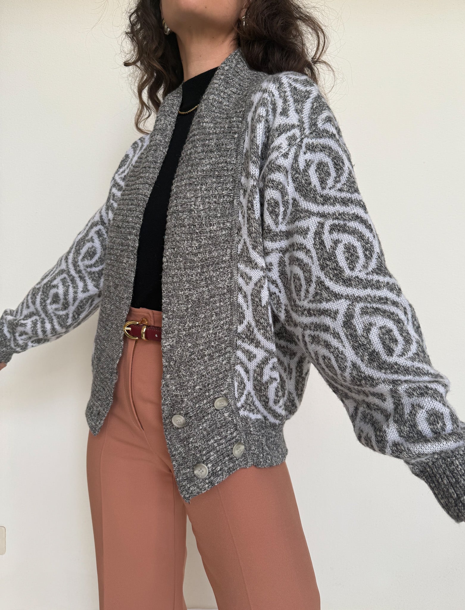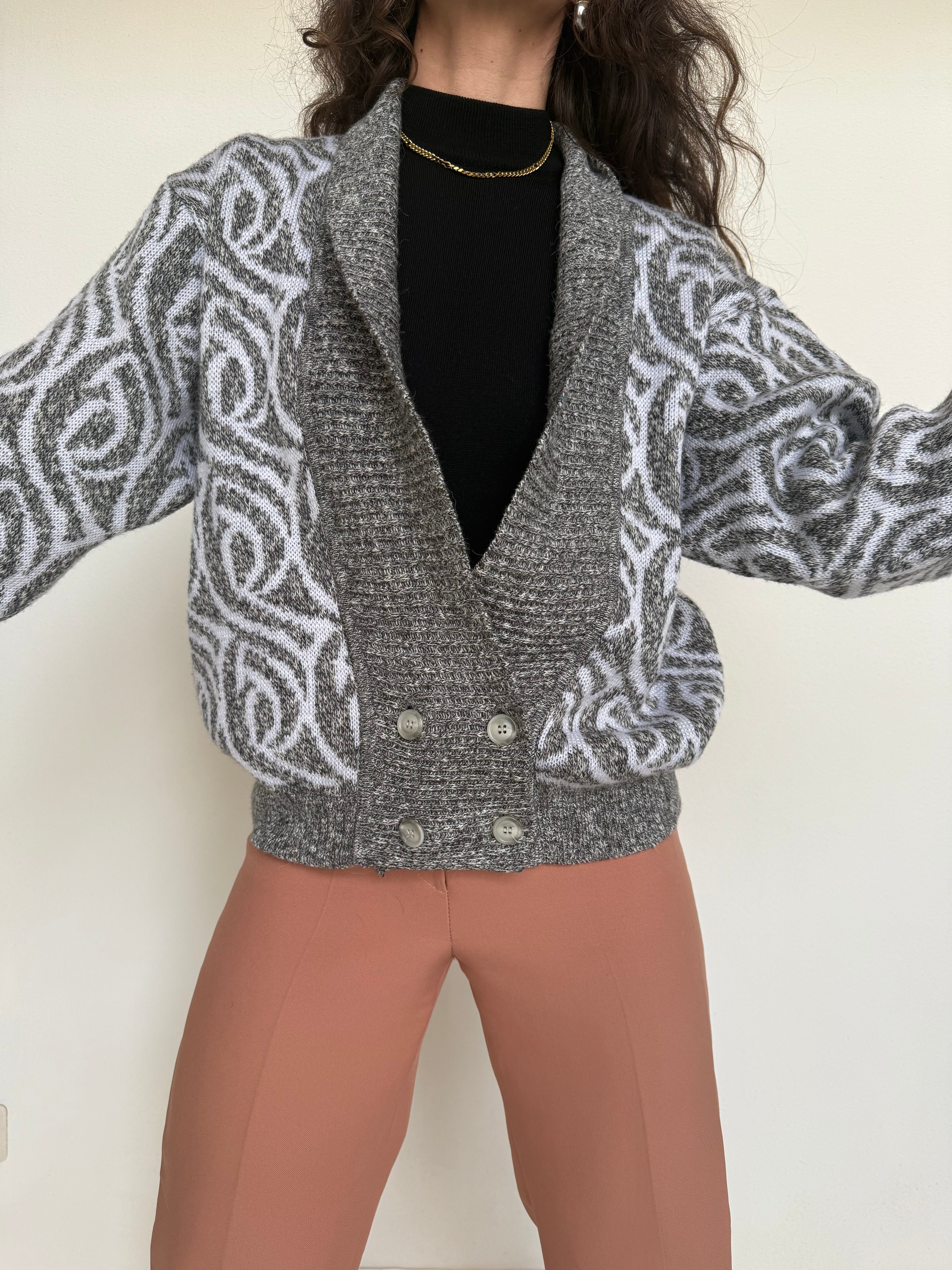 Chosen for its subtle grey mélange and its graphic patterned knit that brings instant depth to the silhouette. This cardigan balances softness and structure, making it easy to layer while still standing out. Worn open over a fitted top or paired with tailored trousers, it adds texture and a confident vintage touch to everyday looks.