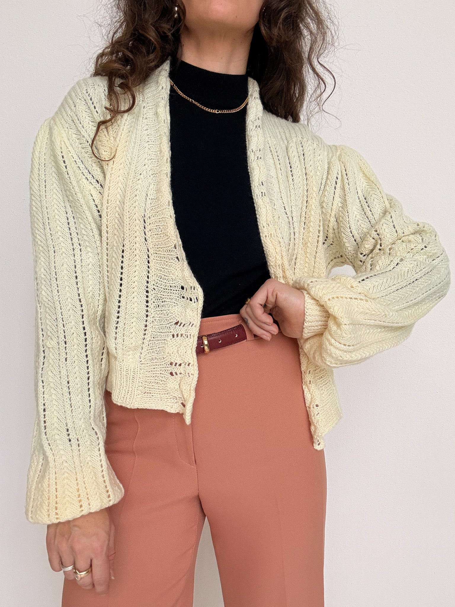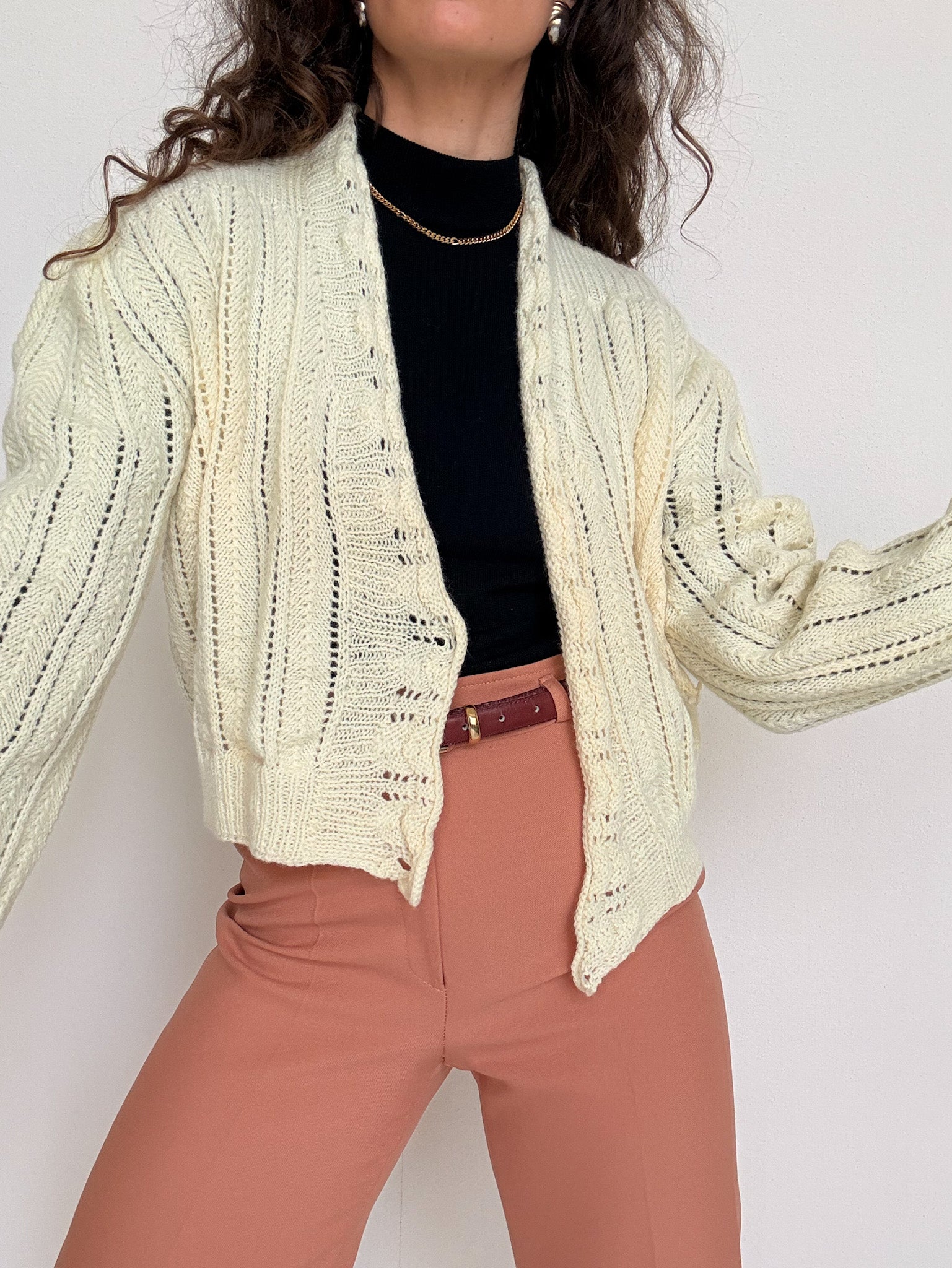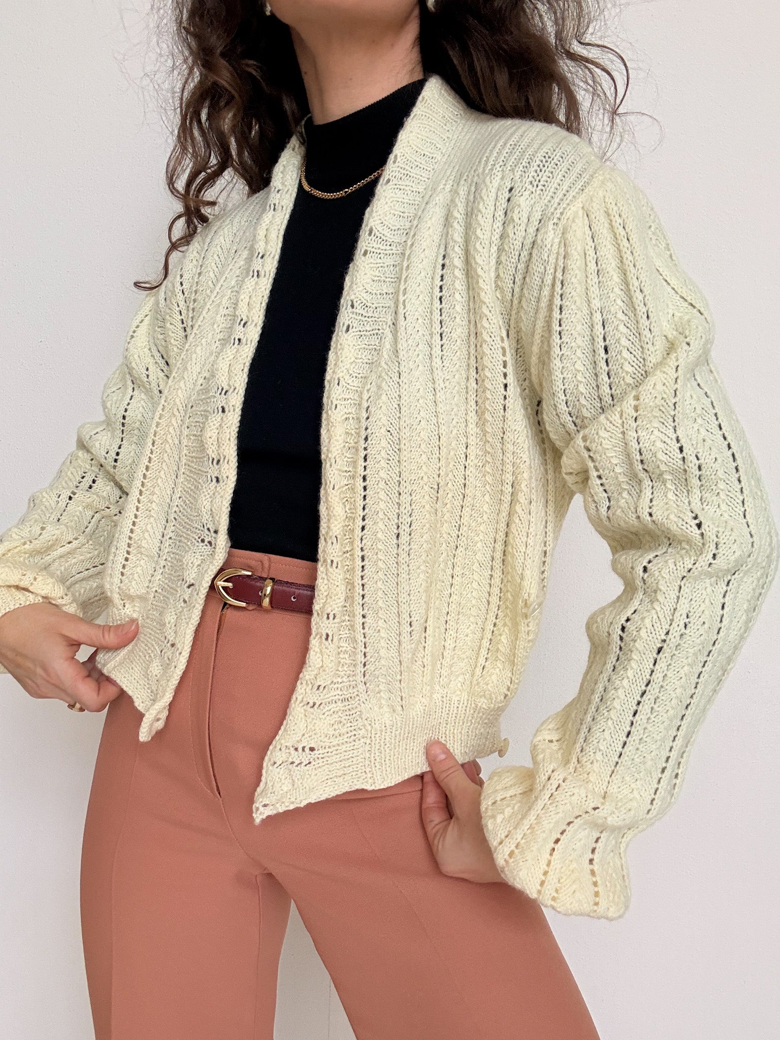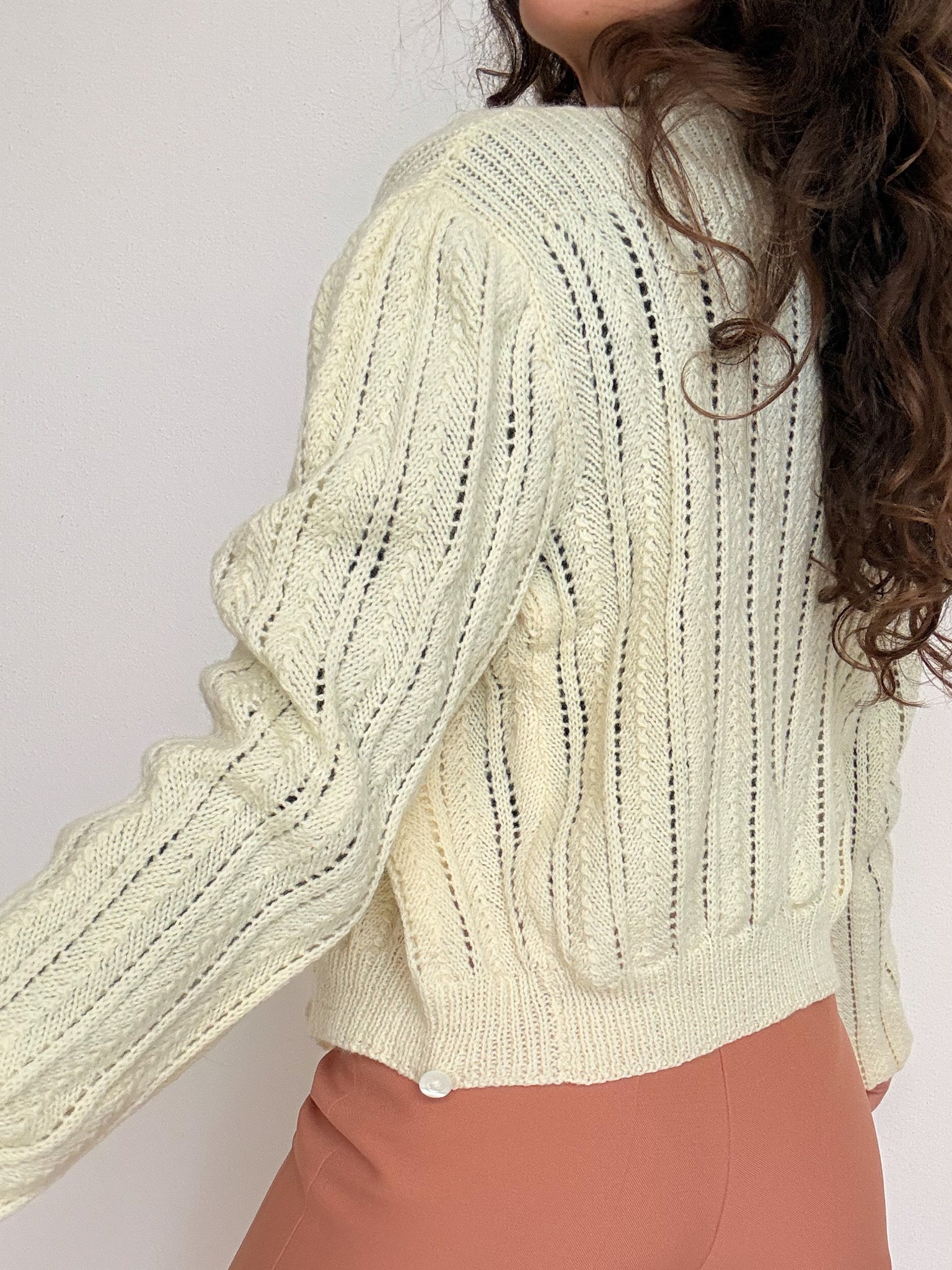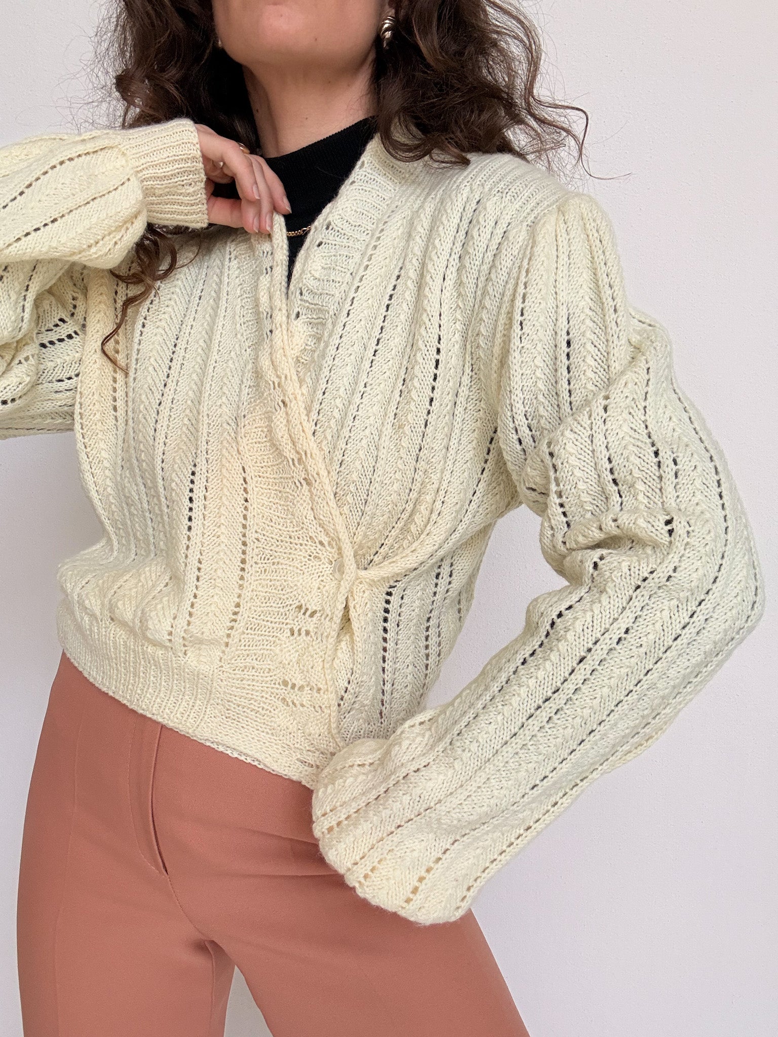 Chosen for its beautifully sculpted wrap silhouette that hugs the body in the most flattering way. This hand knit piece stands out through its soft cream tone and refined openwork texture, creating a feminine and elegant look when worn closed. The inner tie closures allow for a perfectly adjusted fit, making it a truly special vintage knit with a subtle couture feel.