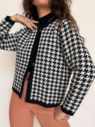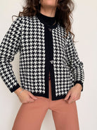Chosen for its timeless houndstooth pattern that instantly brings elegance and a strong couture feel. This piece naturally recalls iconic Chanel inspired cardigans, with its refined black and white contrast and those beautiful metal hook closures that make all the difference. Worn open or closed, it elevates any silhouette and adds a confident, feminine vintage statement to the look.