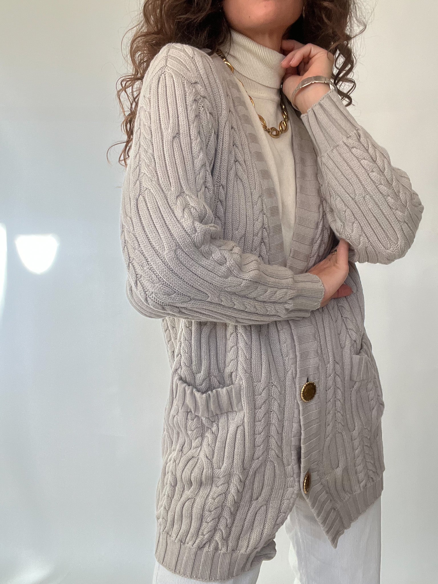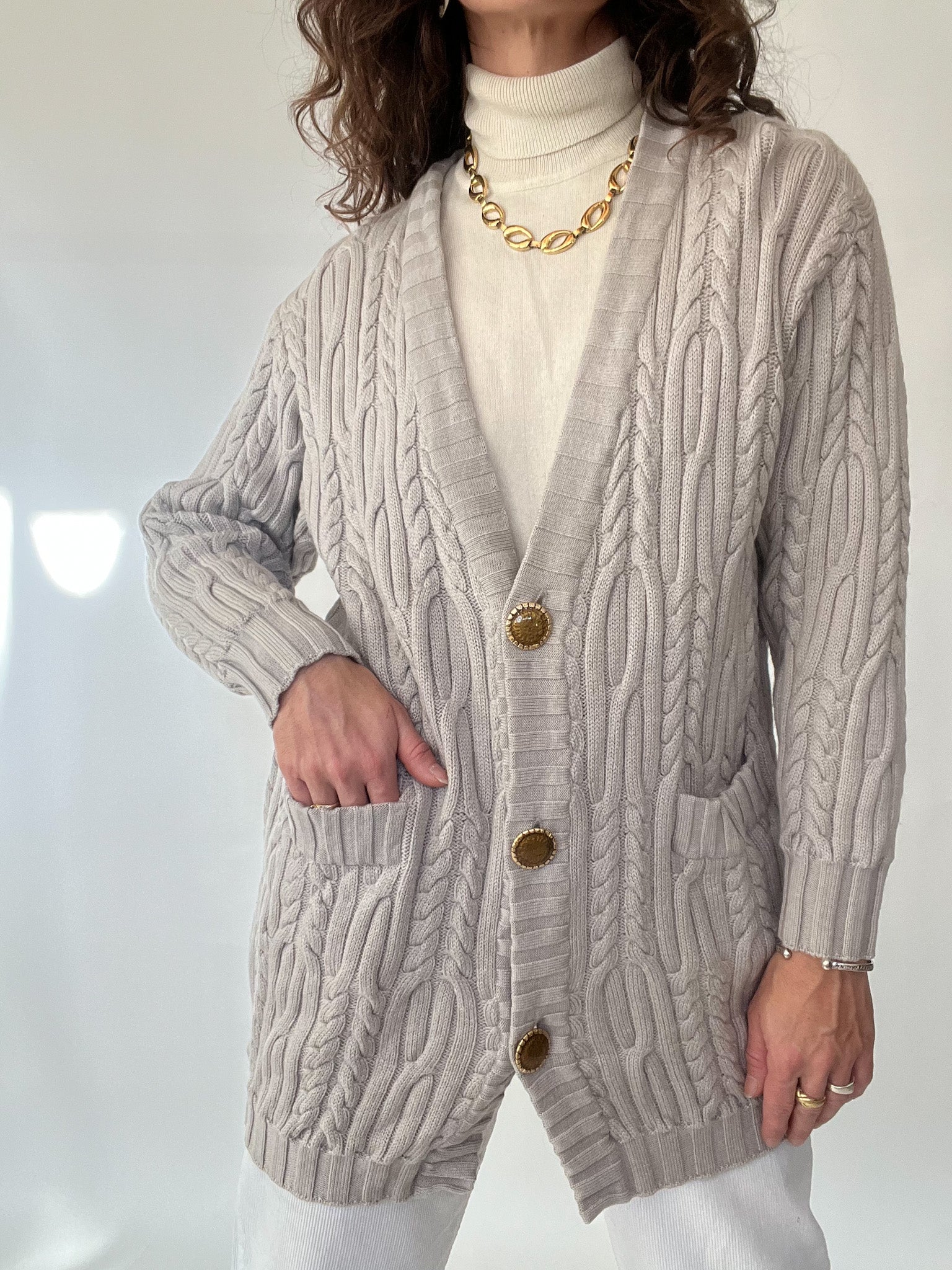 A true Italian wool gem, this cardigan blends softness, structure, and elegance in the most effortless way. Its luxurious cable-knit texture feels incredibly smooth and flexible, wrapping you in warmth without ever feeling heavy. The soft grey tone elevates the piece into something quietly powerful—understated yet full of character, just like the women who wear Skorpiones Vintage. Finished with gorgeous gold buttons and deep front pockets, it’s the kind of cardigan that instantly transforms a simple outfit into something iconic, timeless, and deeply personal.